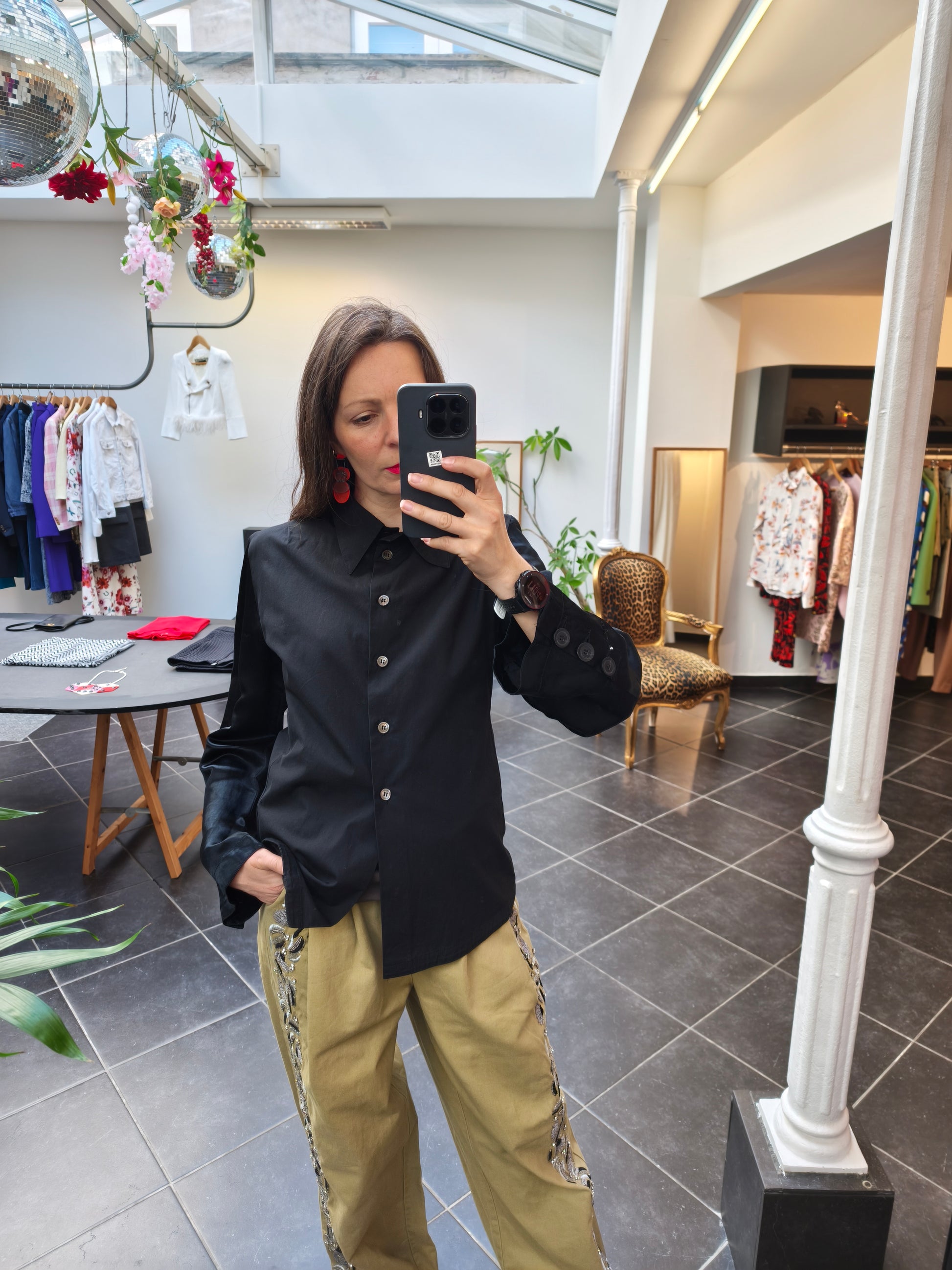 Zwarte hemd met zijden mouwen.