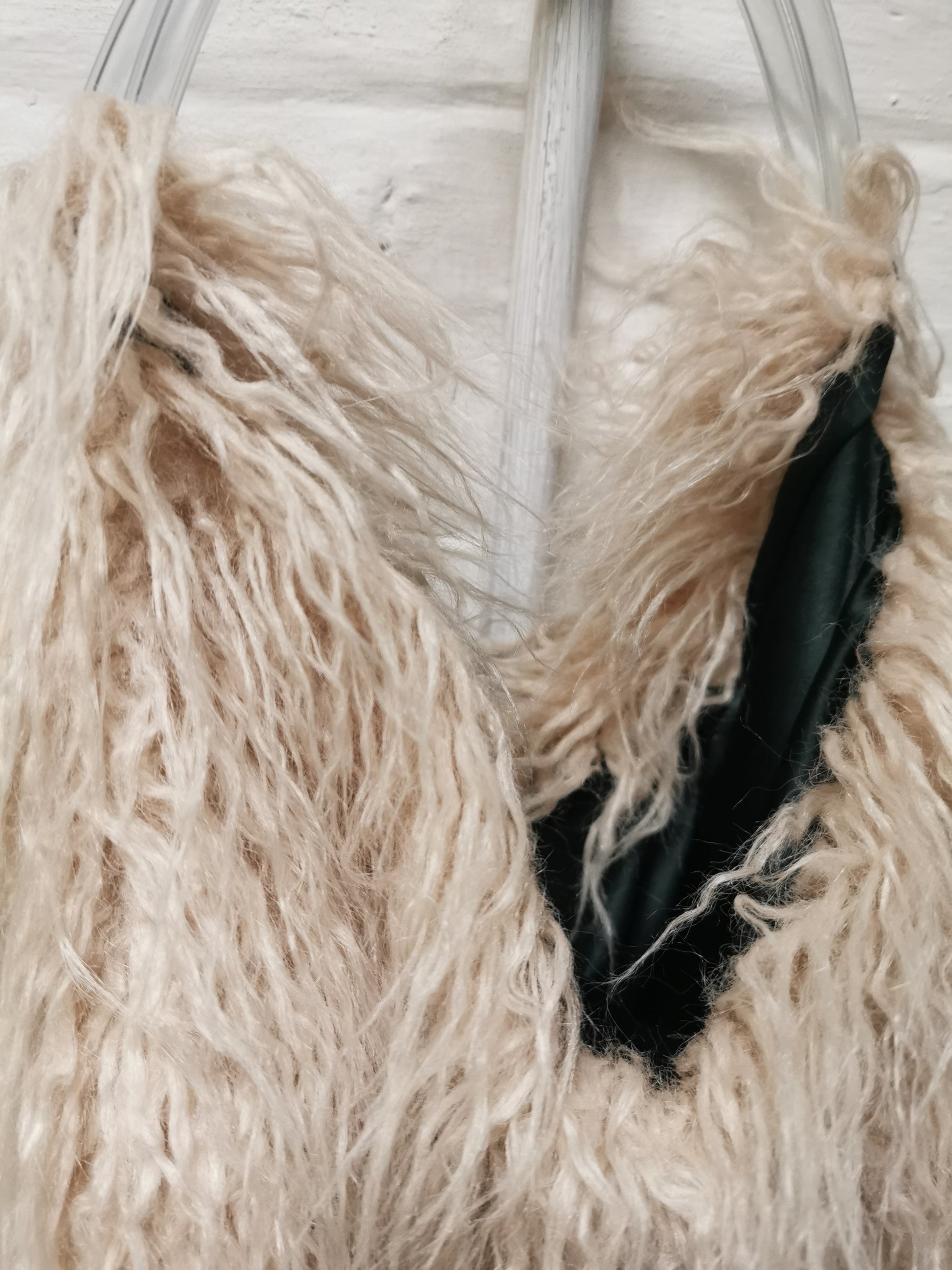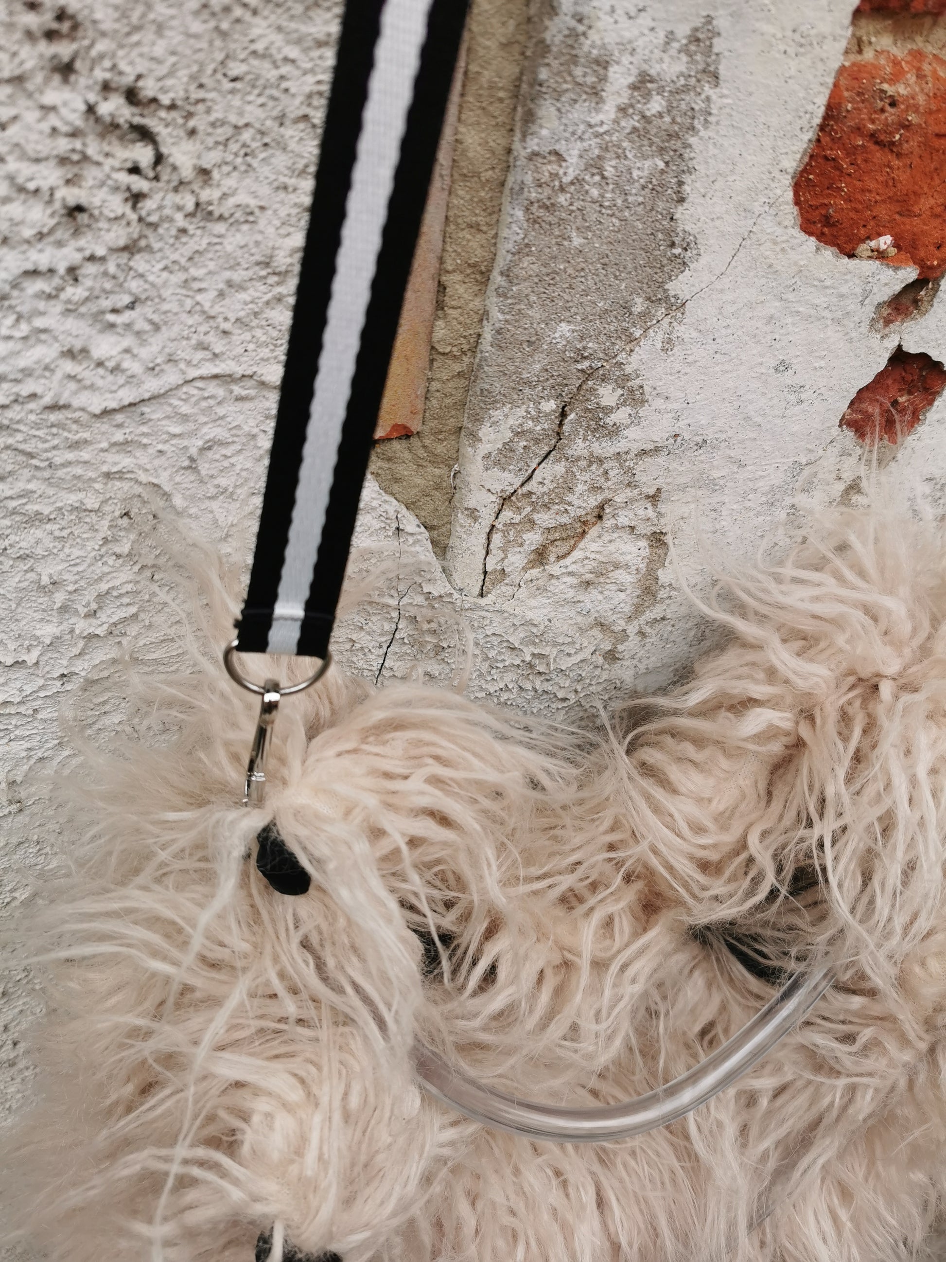 Oversized, faux fur tas. Korte plastic handvaten en lange stoffen riem om de tas aan de schouder of crossbody te dragen. Binnenin is ze gevoerd in donkergroene textiel en is er nog een ritszakje.