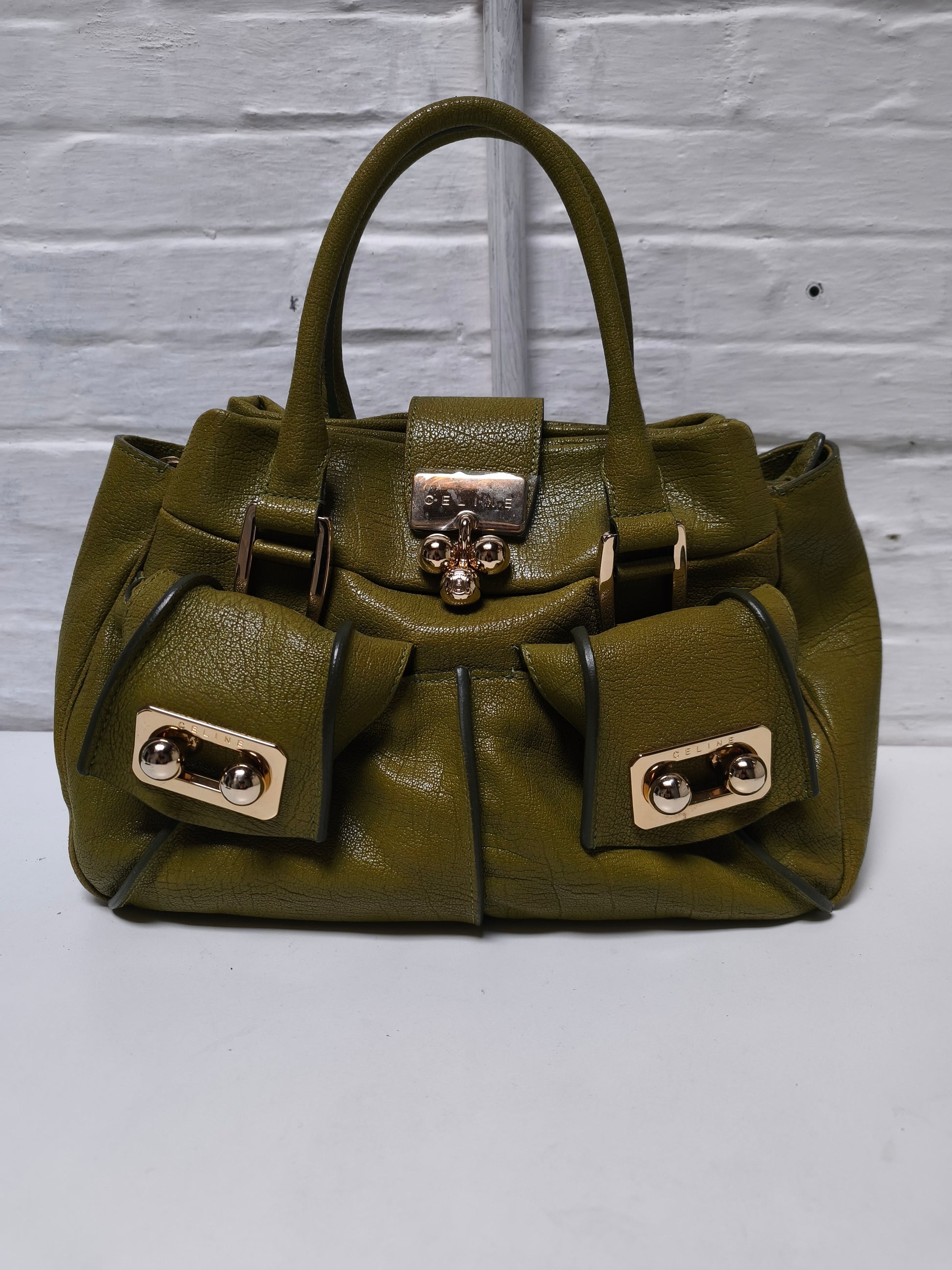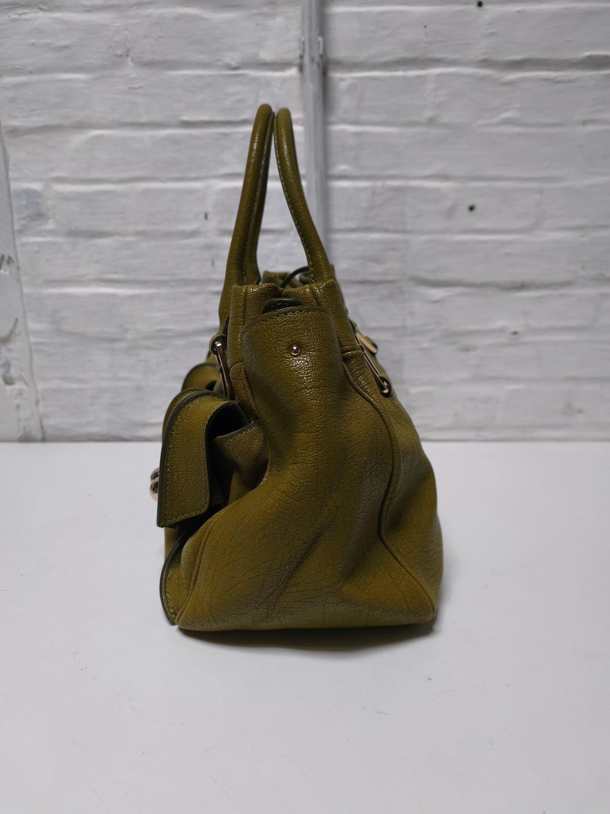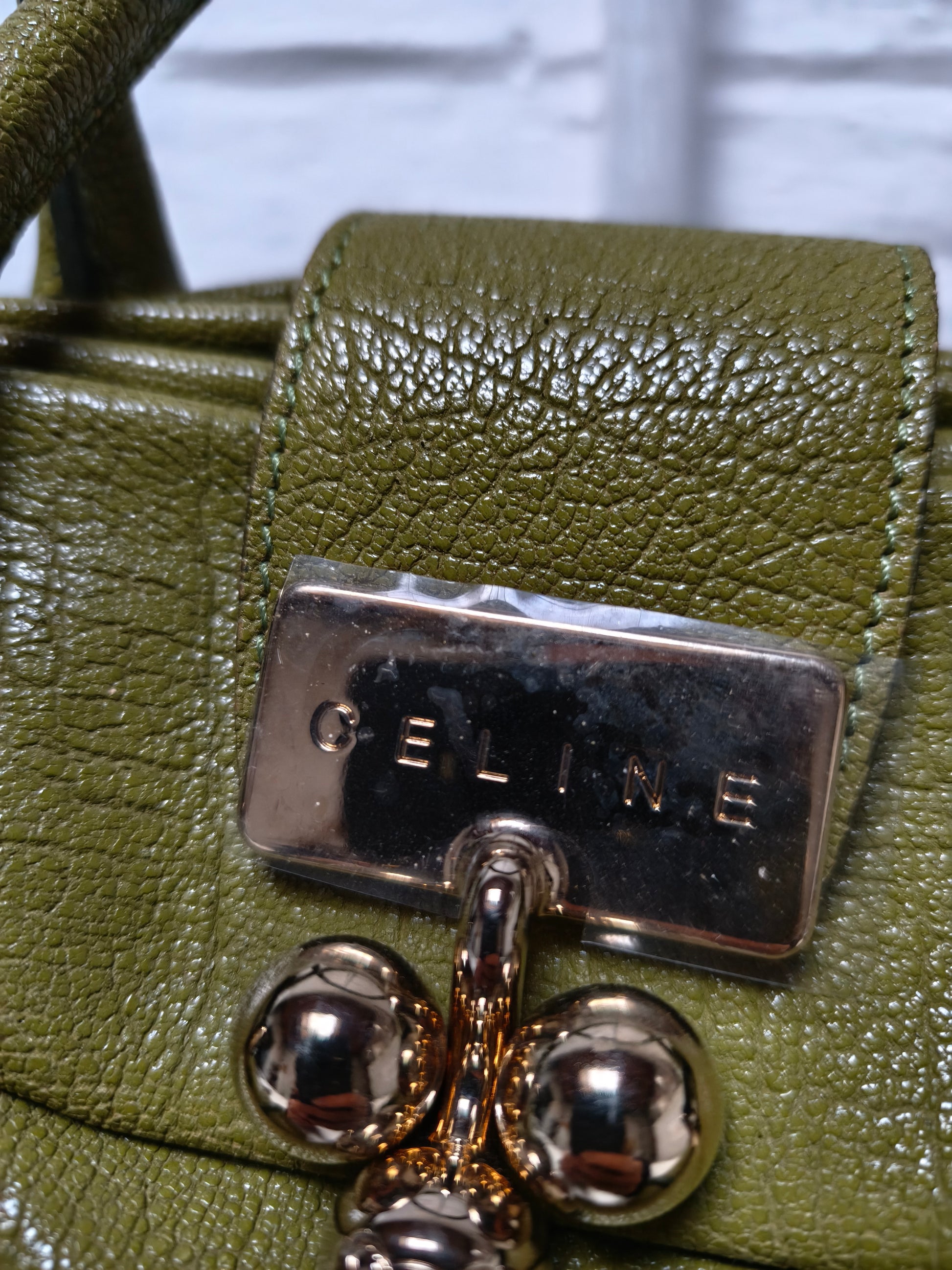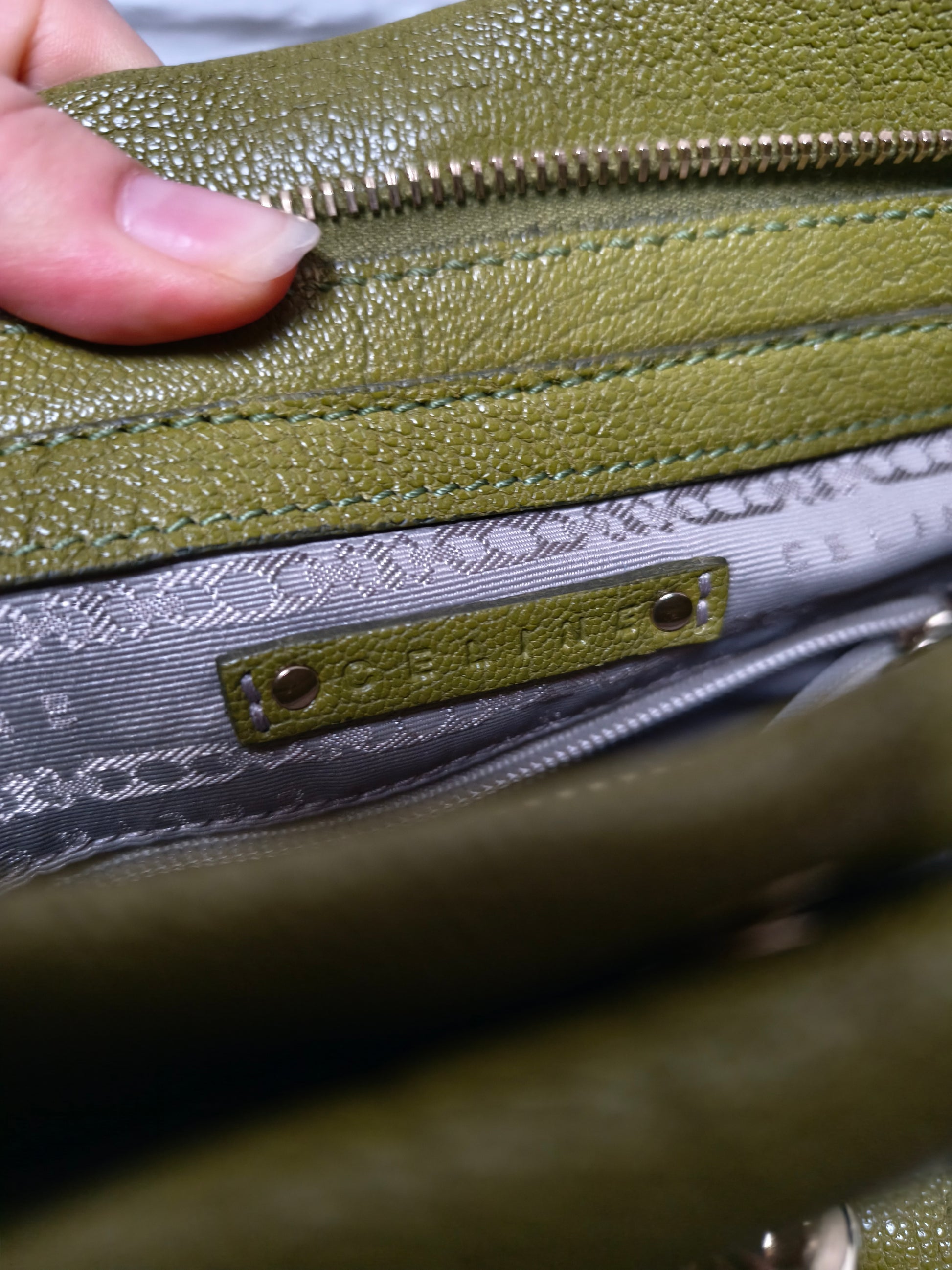 De CELINE Blossom bag in kaki kleurig, gestructureerd leer met goudkleurig metalen hardware. De tas bestaat uit 3 compartimenten waarvan de middenste met rits en de 2 buitenste met magnetische drukknop. De tas is binnenin gevoerd met grijs textiel. Je kan de tas dragen aan de hand of aan de schouder, want ze komt met een extra draagriem.