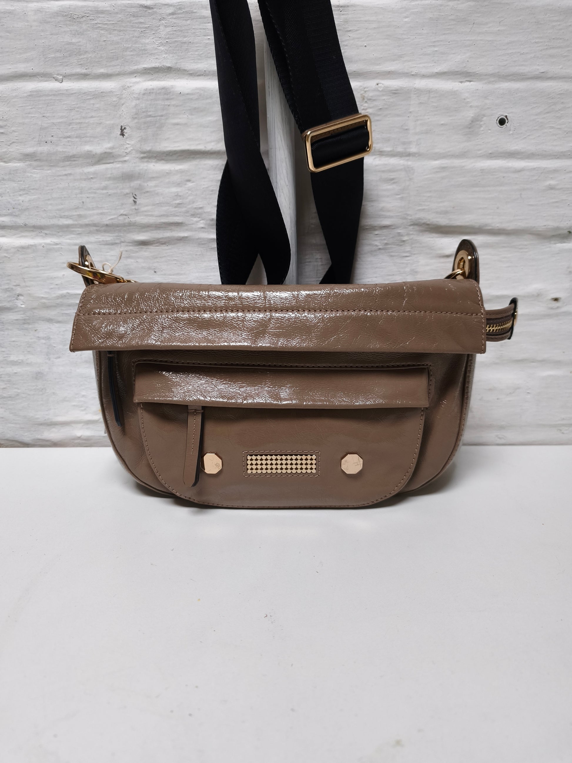 Met zijn gelijkenis met een heuptasje is de NEPTUNE your best friend. Deze tas is bewust chic en sportief en kan dankzij de verstelbare riem crossbody of over de schouder gedragen worden. Ruimer dan een bananentasje biedt hij alle ruimte die je nodig hebt voor je essentiële spullen, zowel in de stad als op kantoor. De NEPTUNE heeft een klein ritsvakje aan de voorkant voor je telefoon of sleutels, en een binnenvak met rits om al je geheimen in op te bergen. Gemaakt van hoogwaardig lakleer en versierd met messing studs, straalt deze tas charme uit!