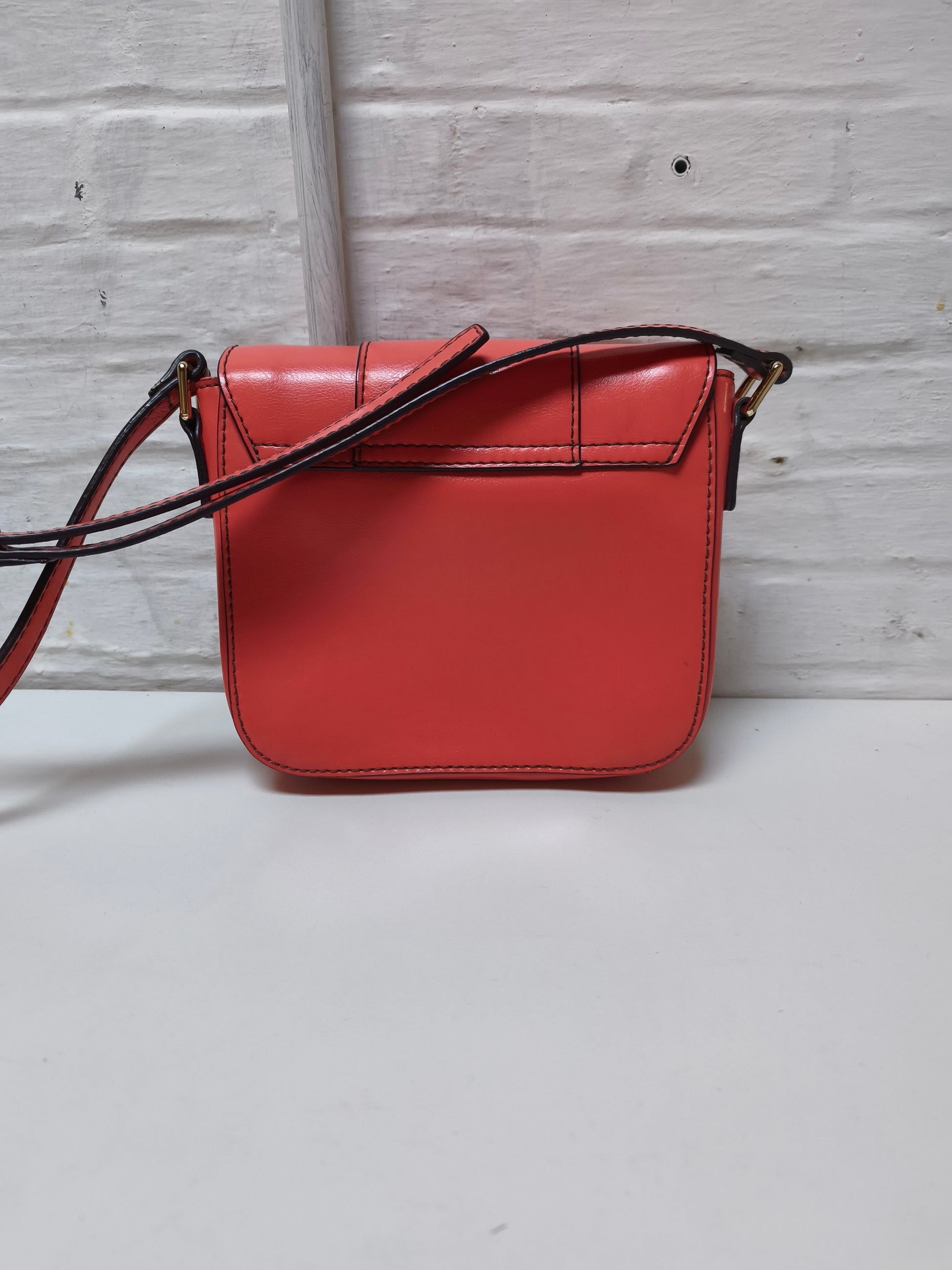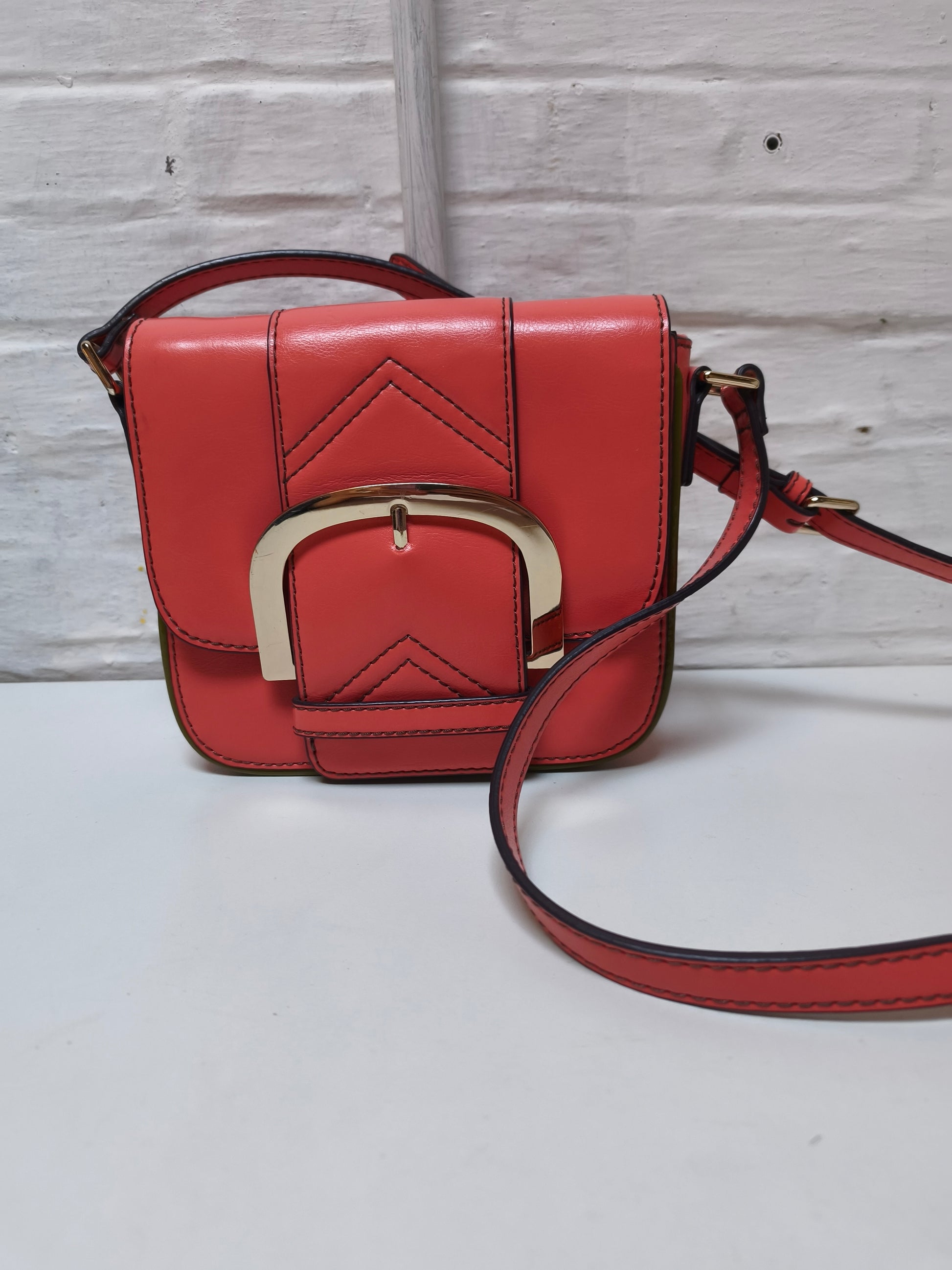 Handtas in koraalrood leder, kaki randverf en goudkleurig metalen hardware. De tas sluit met een magneet drukknop en heeft een groter binnevak met ritszakje en kaarten steekzakken. Daarnaast heeft ze nog een kleiner compartiment. Door de verstelbare draagriem kan je de tas zowel crossbody als als schoudertas dragen