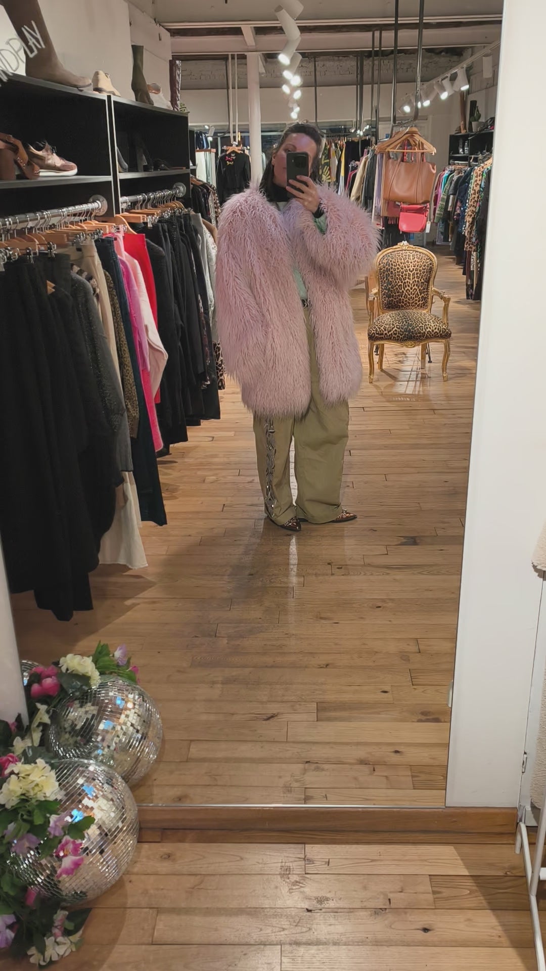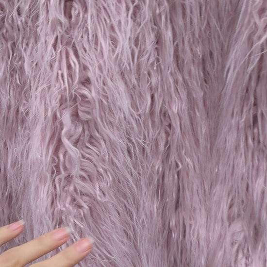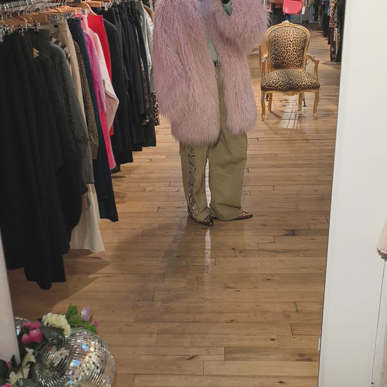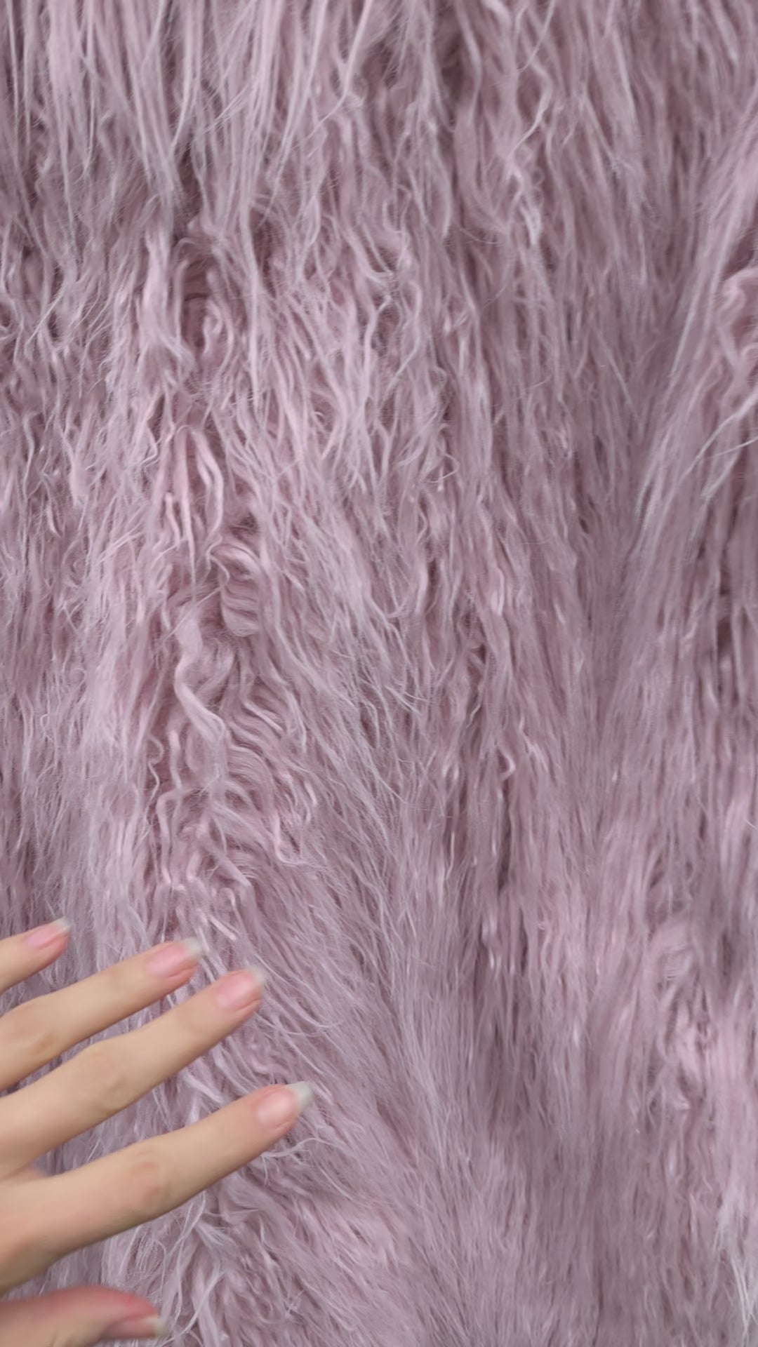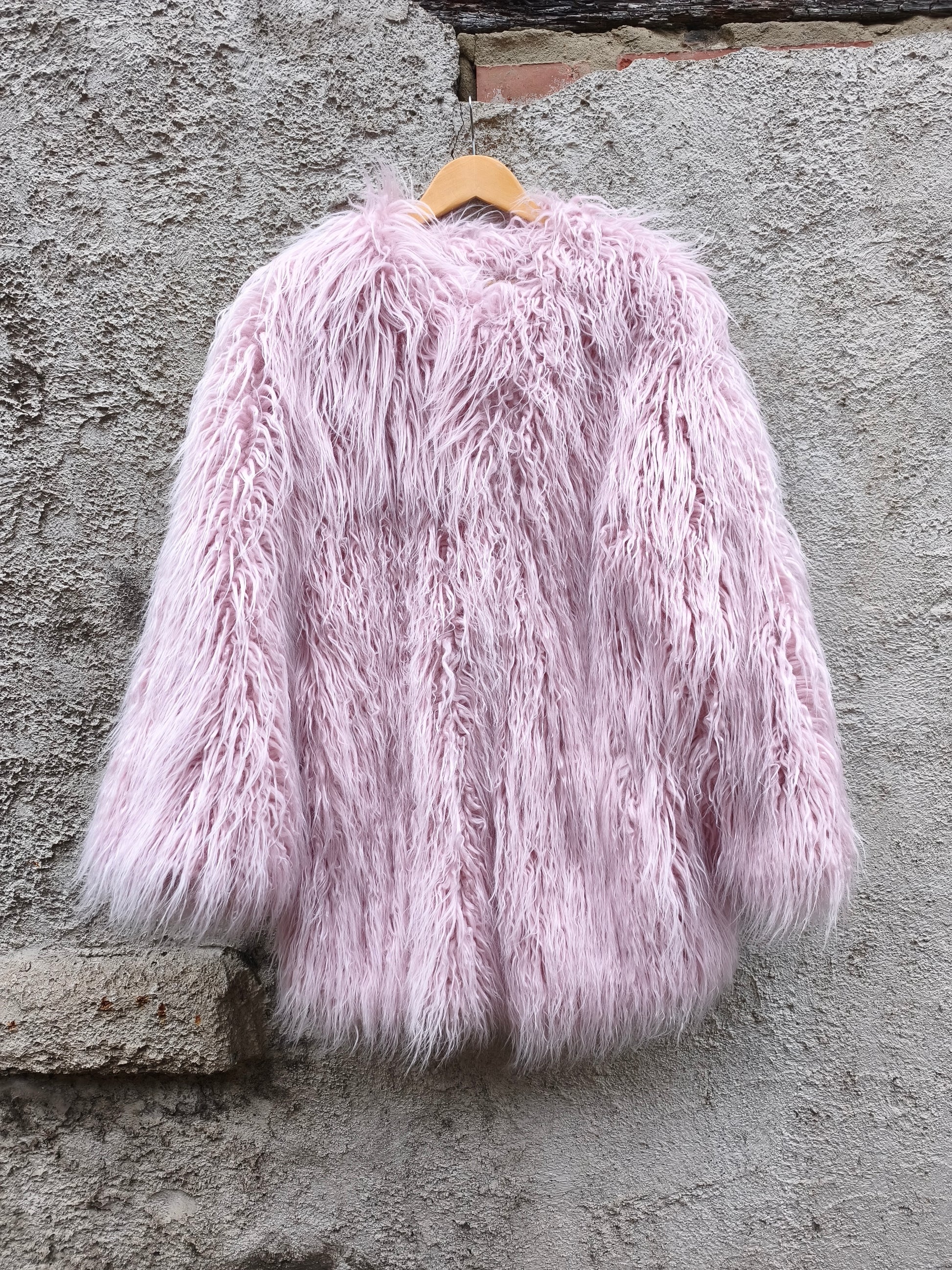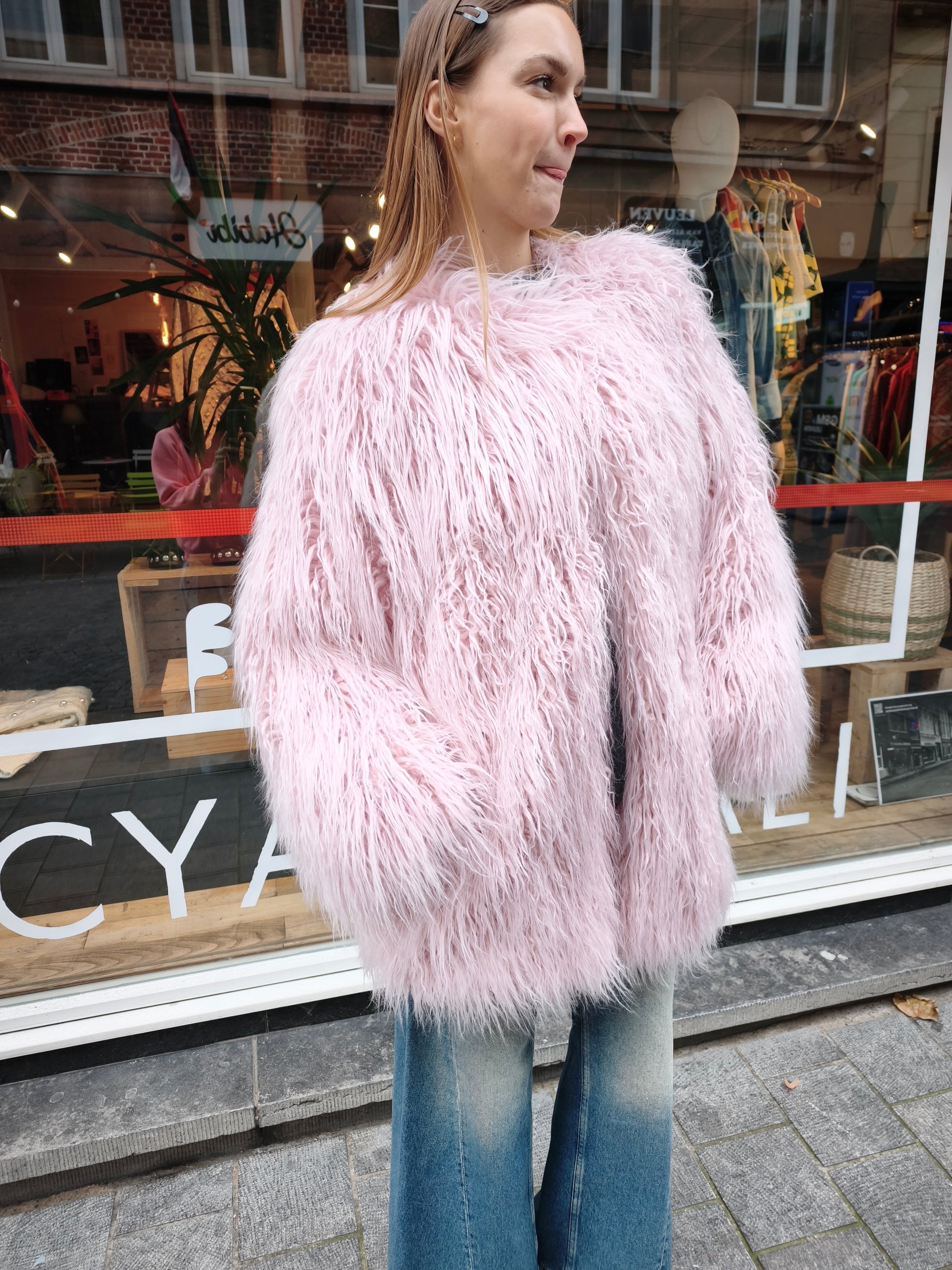 Jas in langharig fake fur. Heeft zakken en sluit met bonthaakjes. Gevoerd.