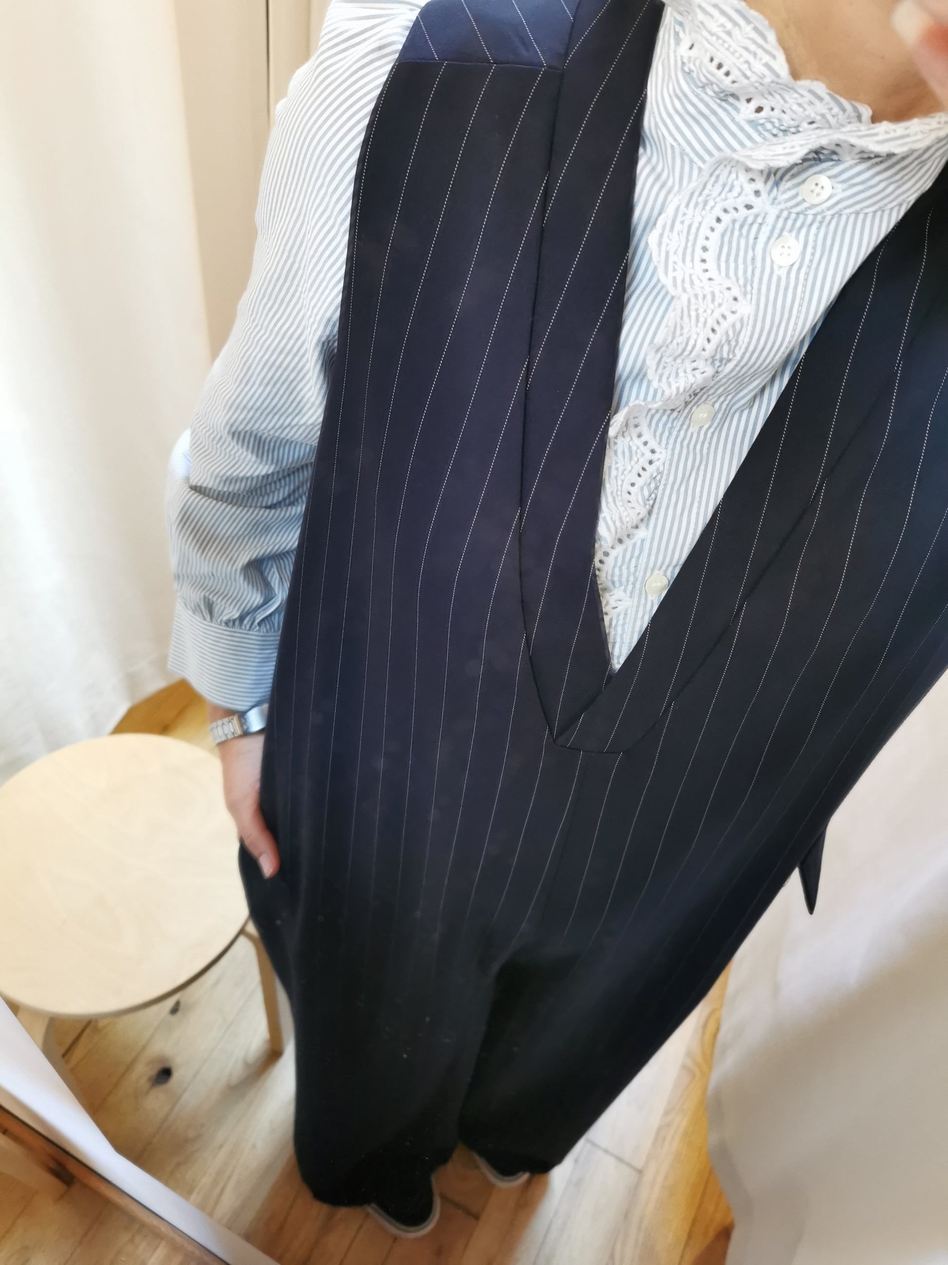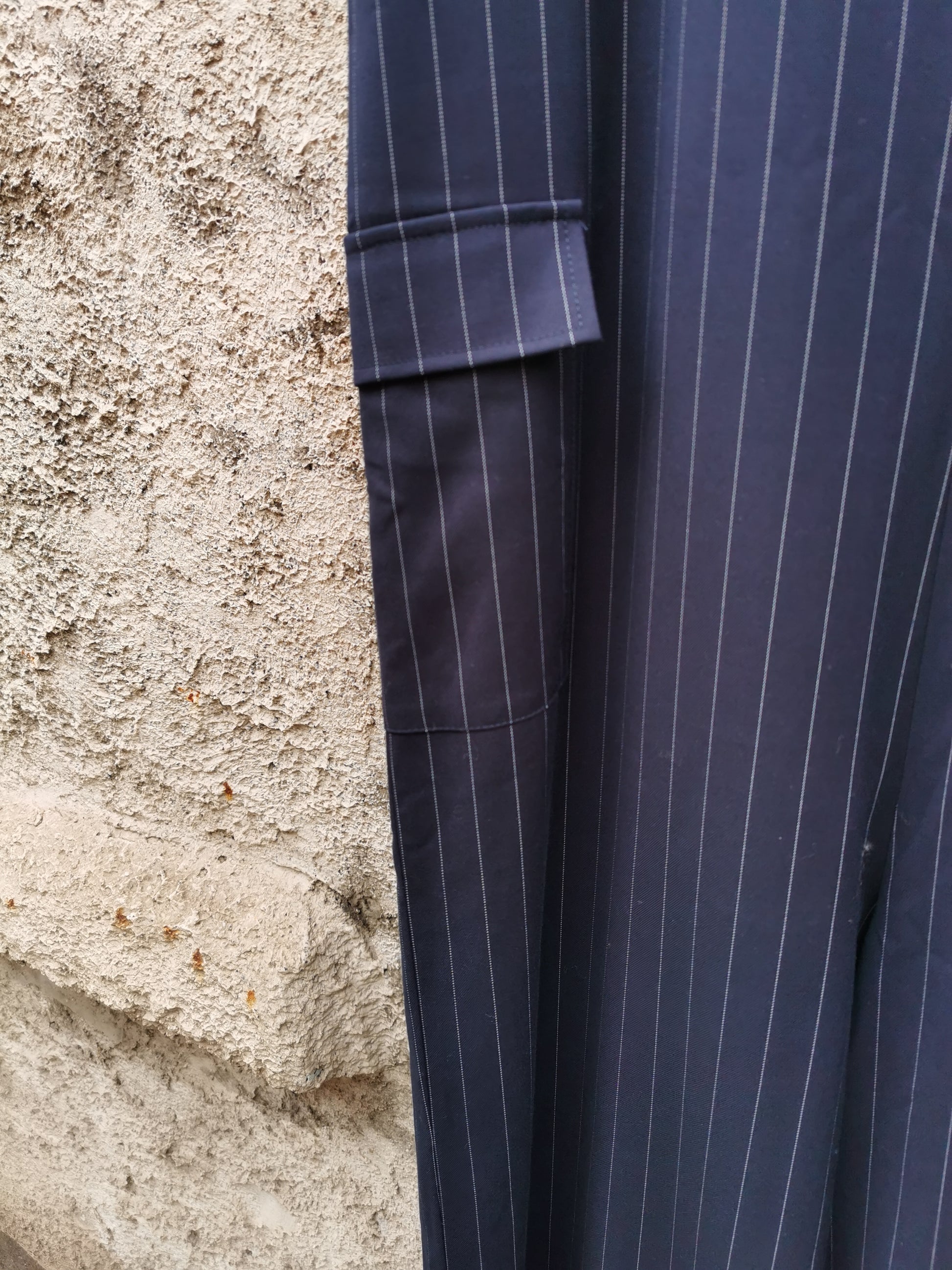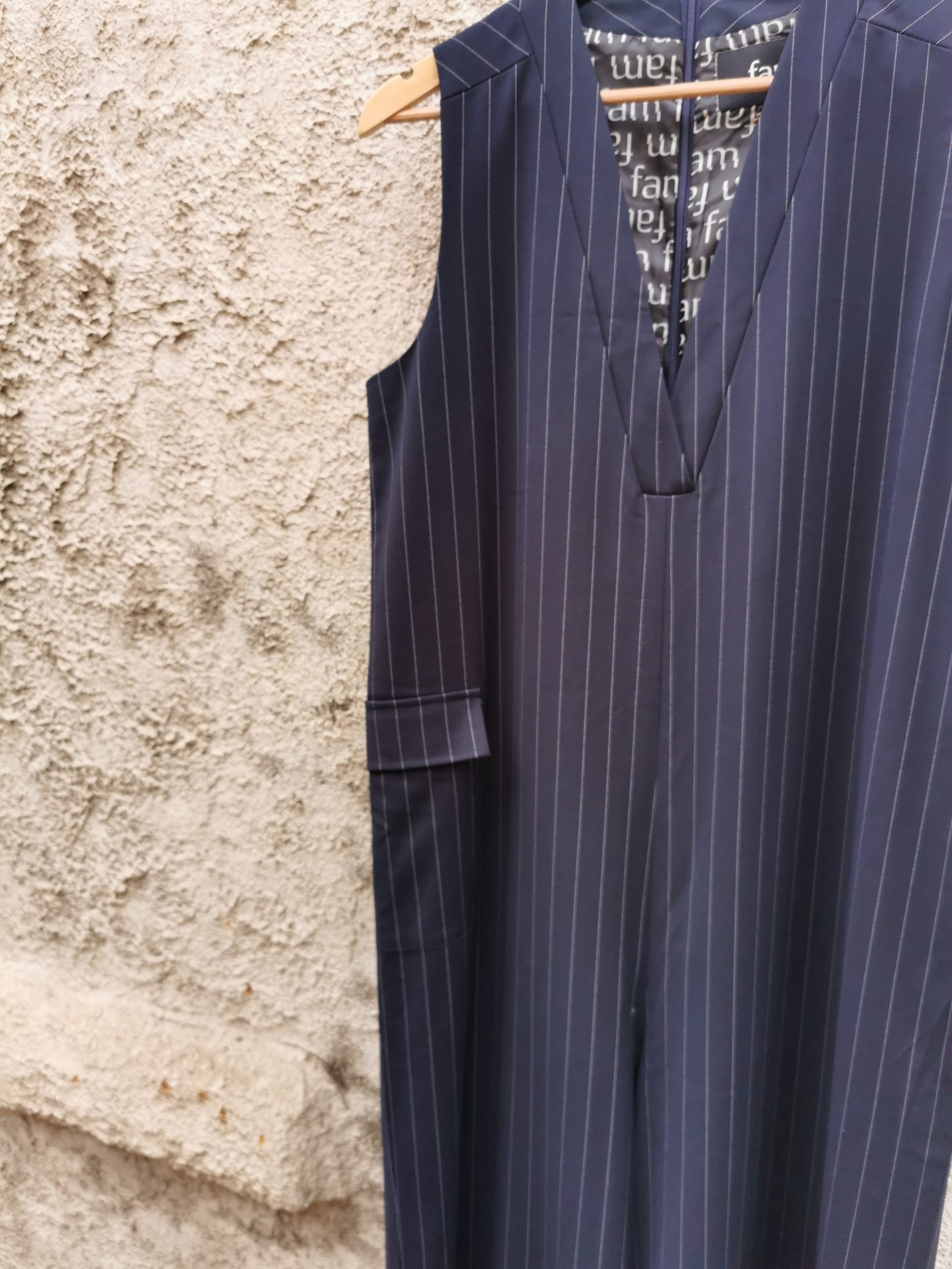 Jumpsuit in navy deadstock krijtstof. Rits in het rugpand. Eén steekzak en één opgezette zak zorgen voor unieke afwerking.