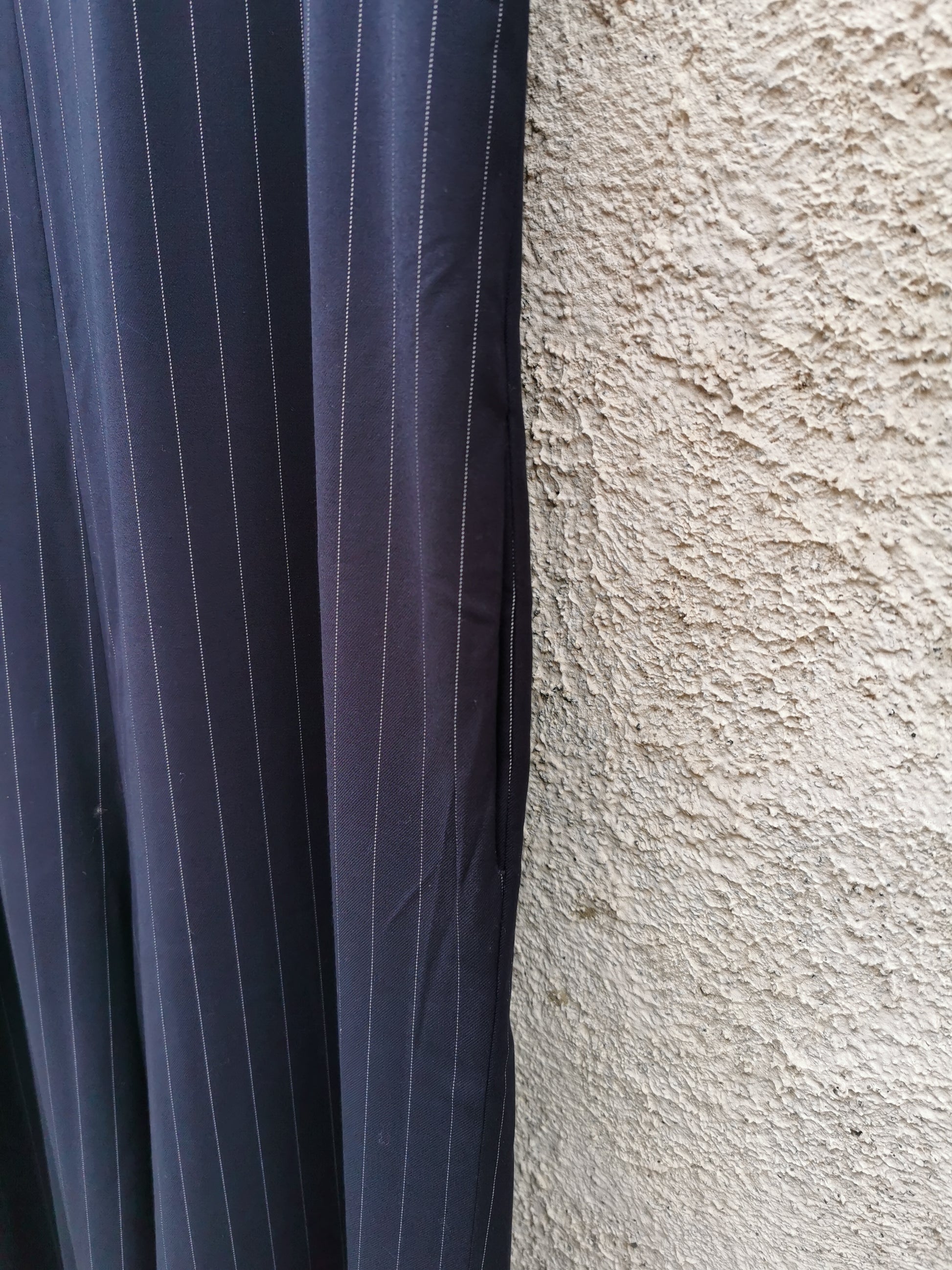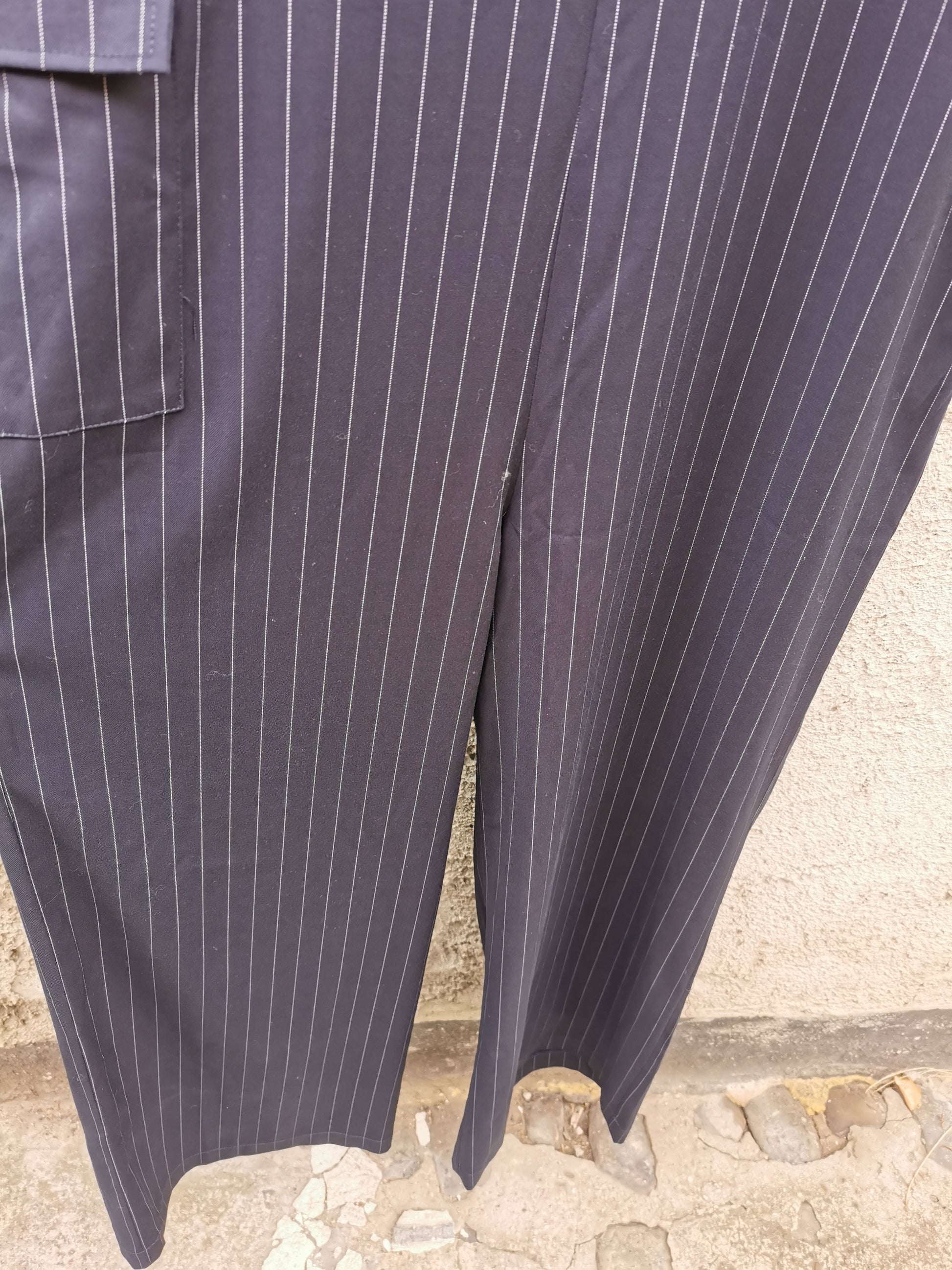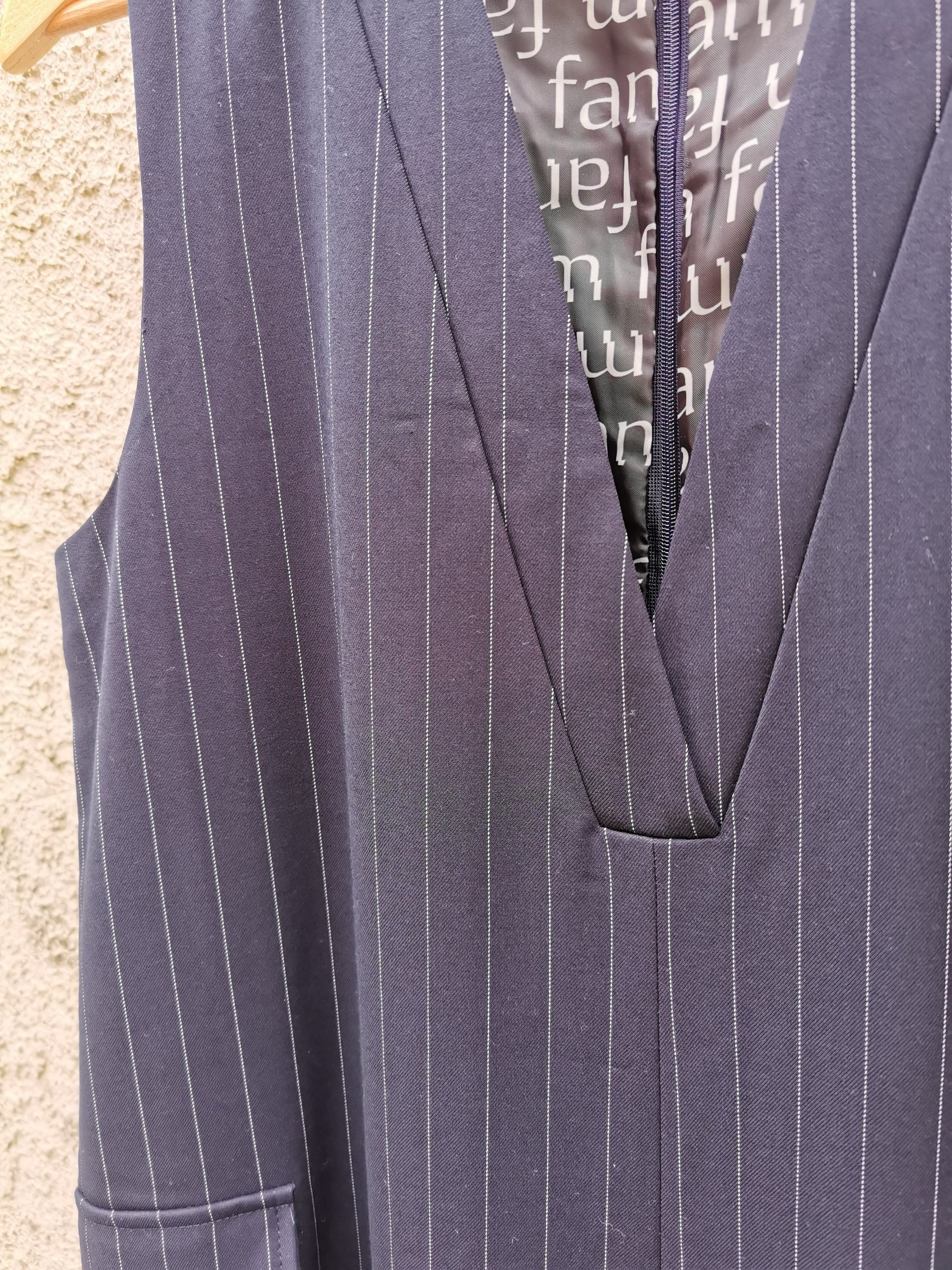 Jumpsuit in navy deadstock krijtstof. Rits in het rugpand. Eén steekzak en één opgezette zak zorgen voor unieke afwerking.