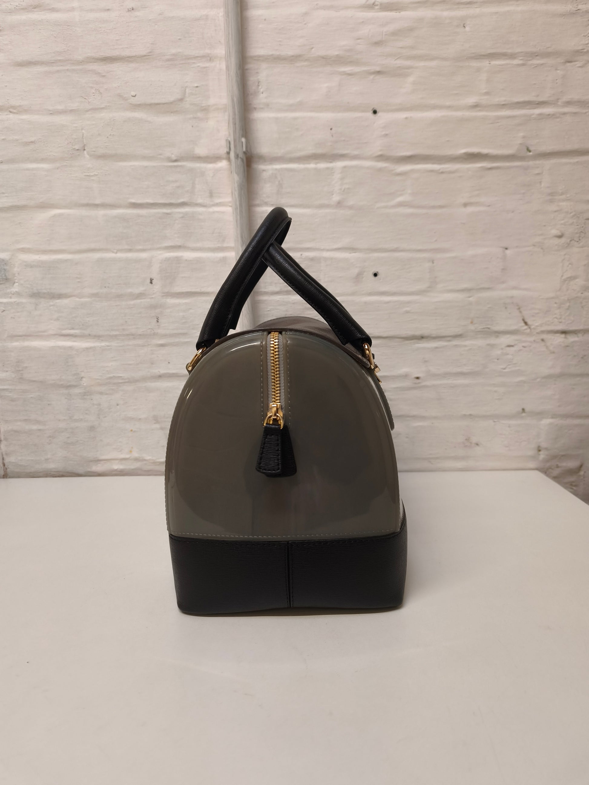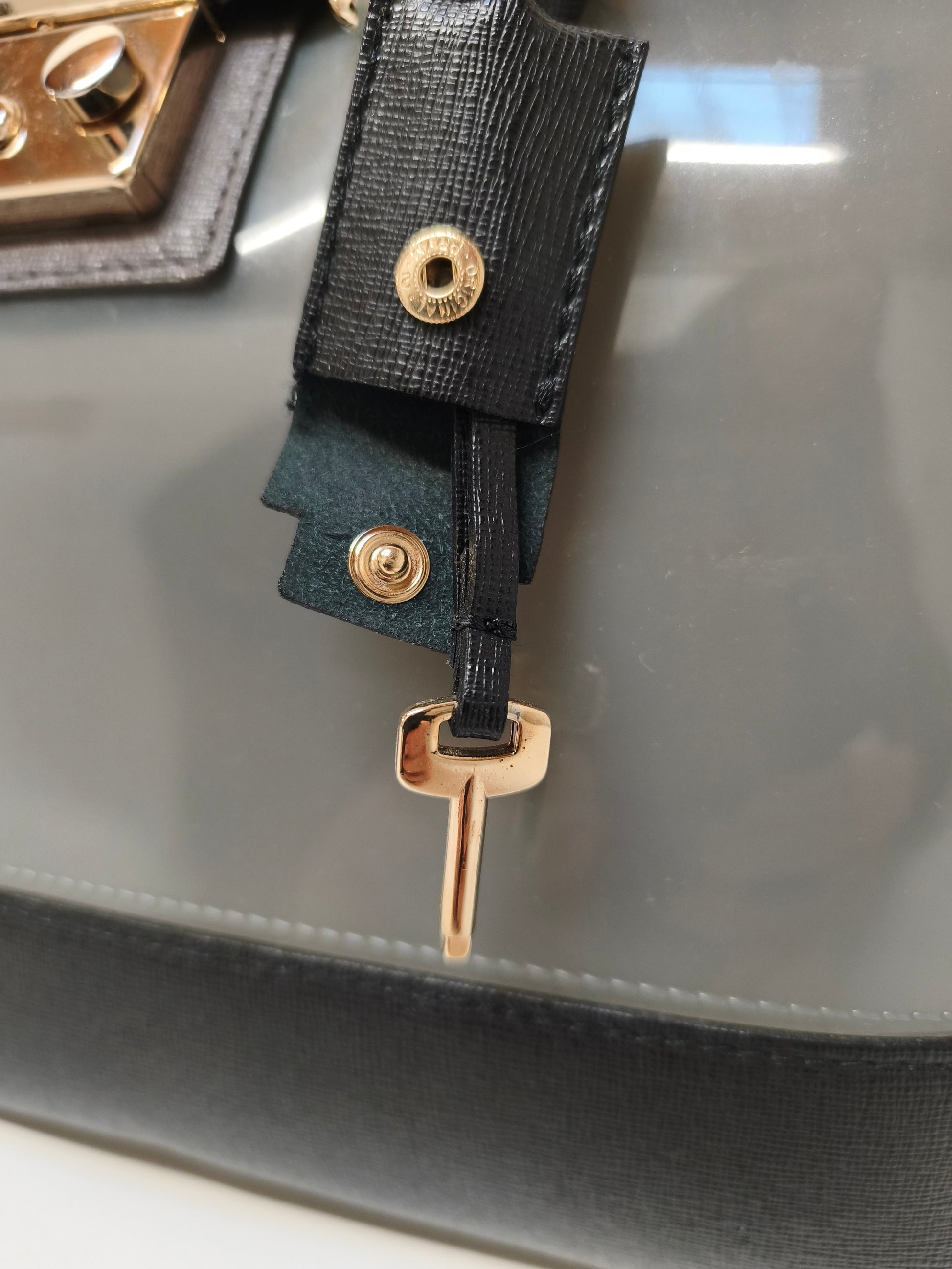 De tas zelf is in plastic de flap en onderkant zijn in zwart leer. De binnenkant is gevoerd in beige canvas.