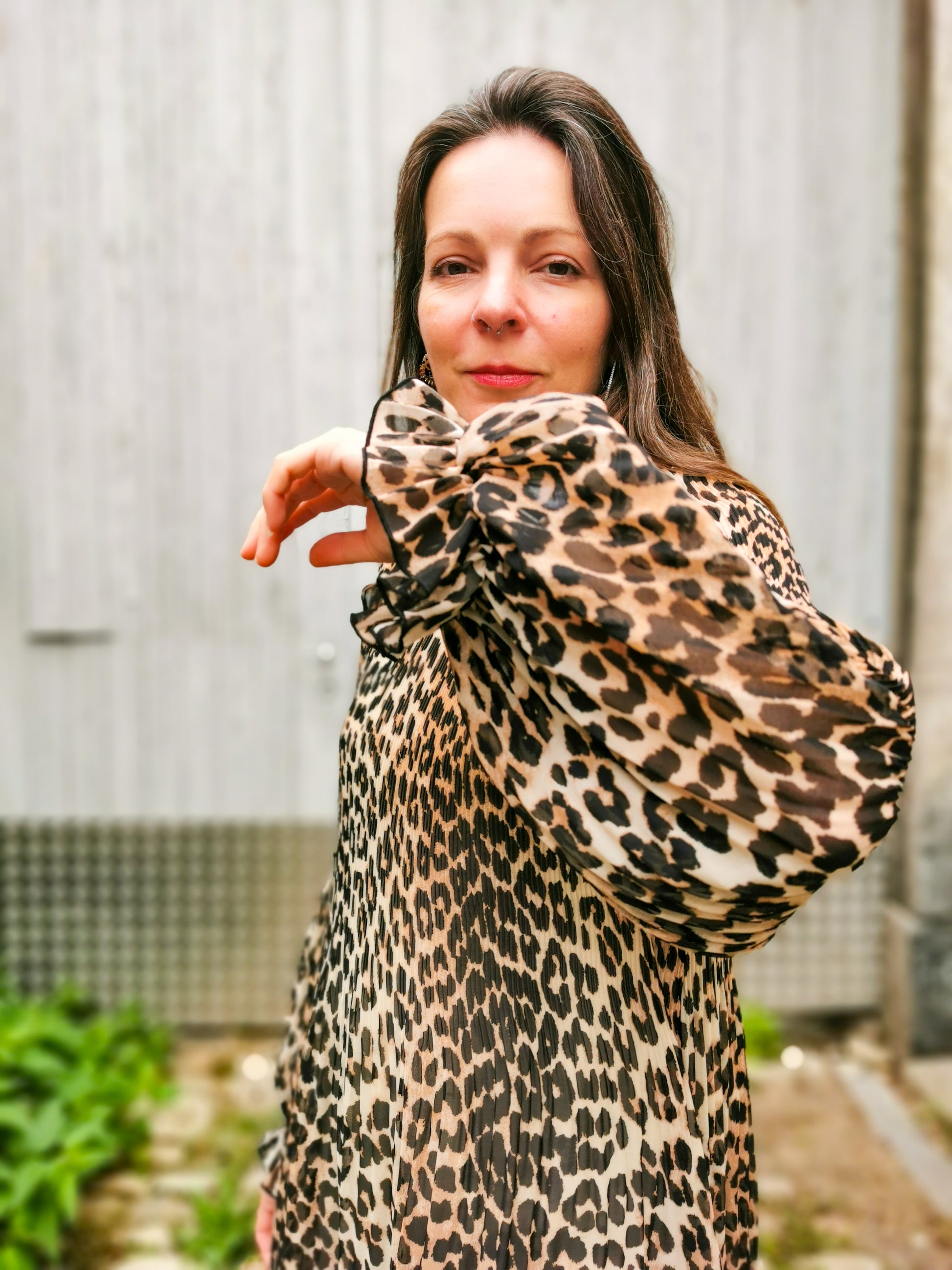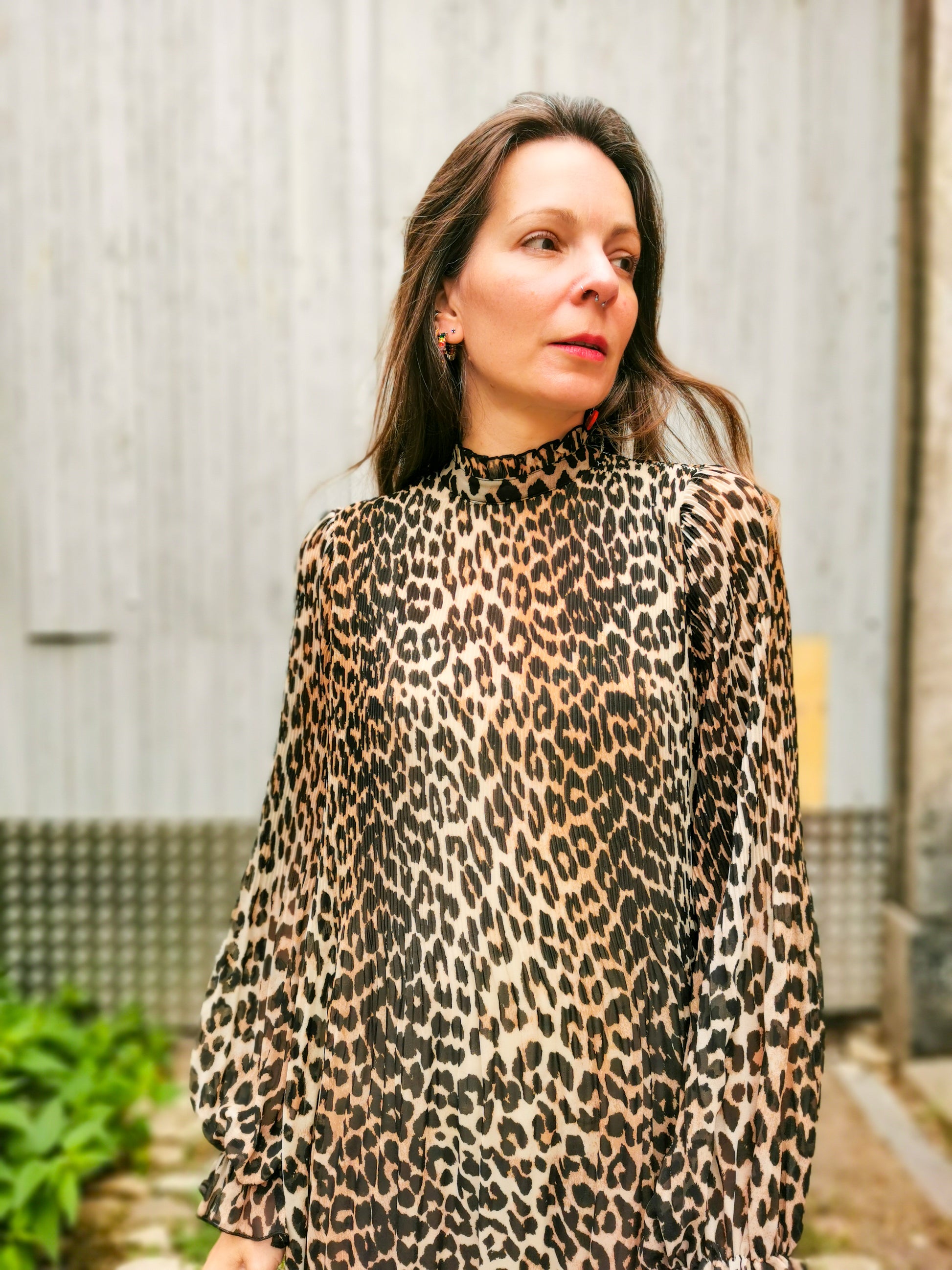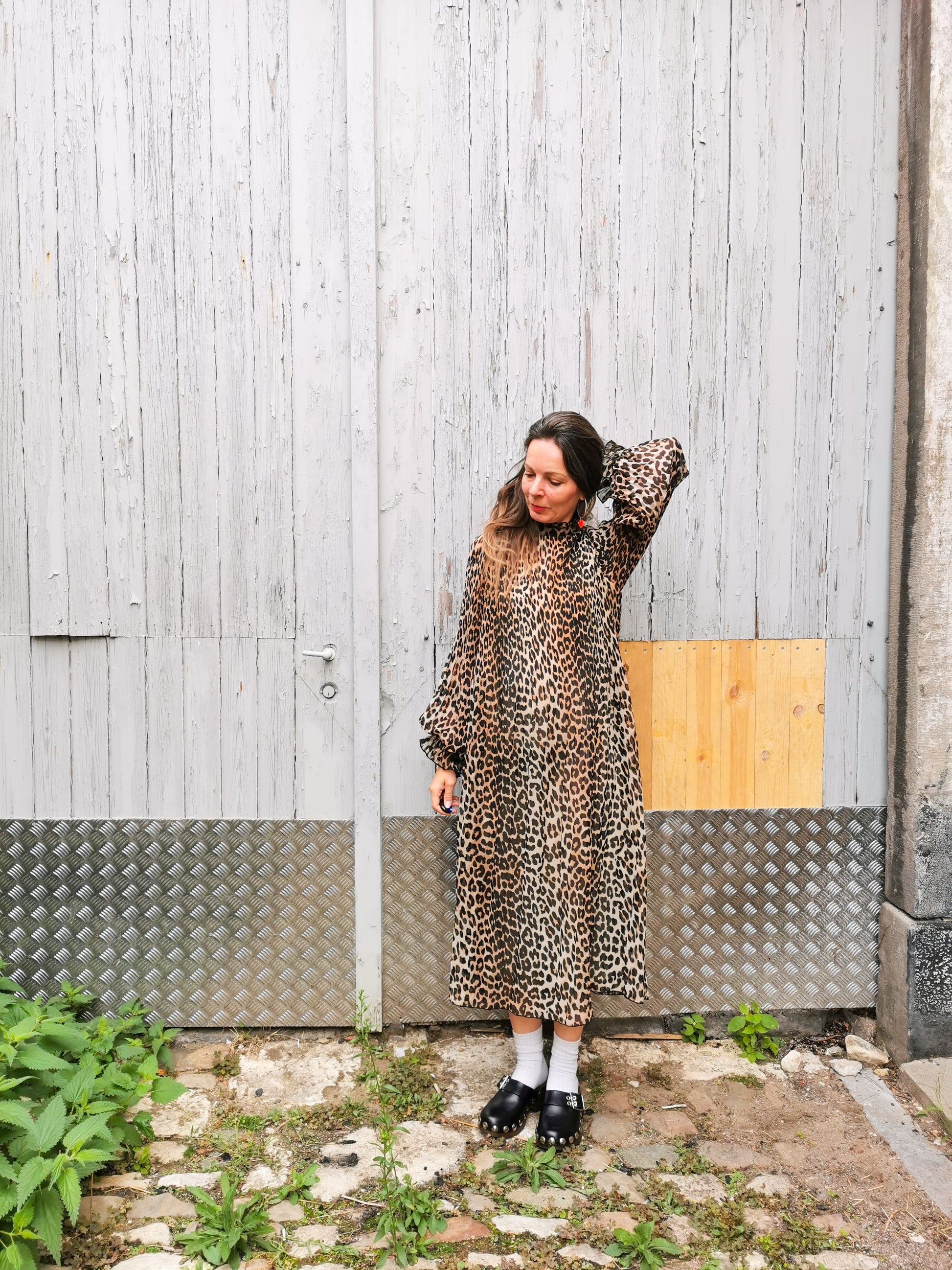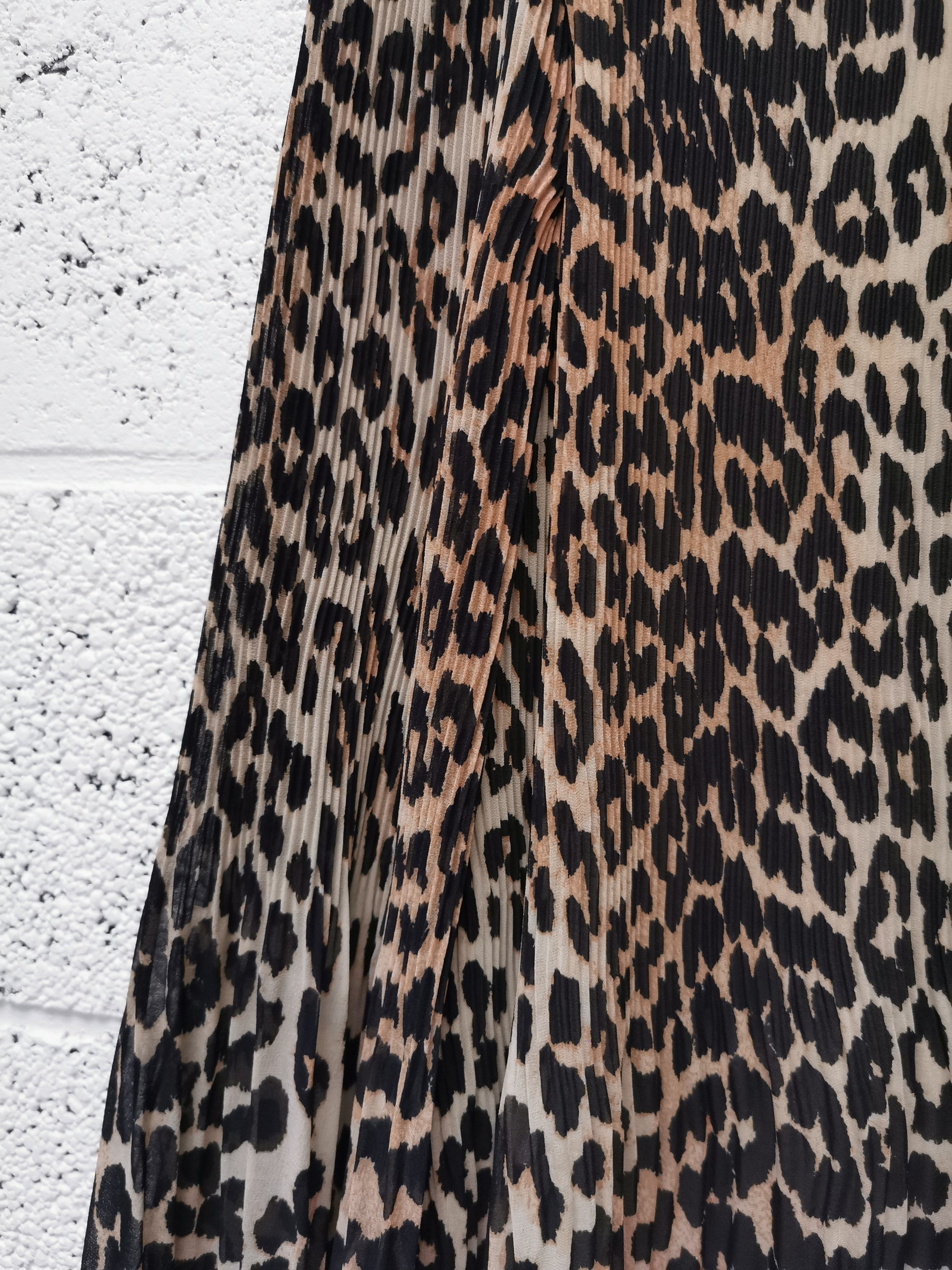 Jurk van Ganni met de iconische luipaardprint. De stof is geplisseerd. Sluit achteraan met een rits je.