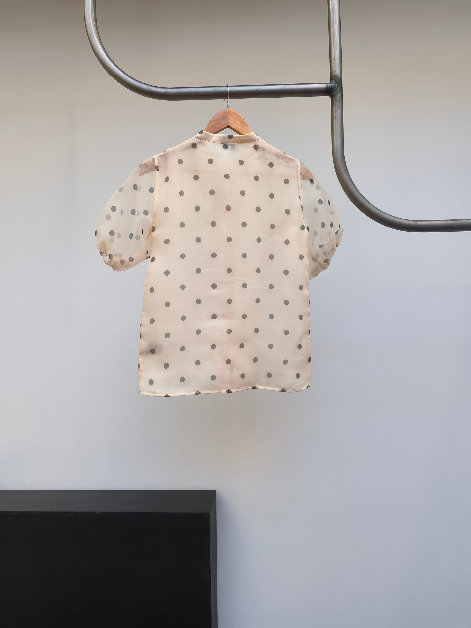 Transparante blouse. Deels gevoerd. Met pofmouw en knoopsluiting