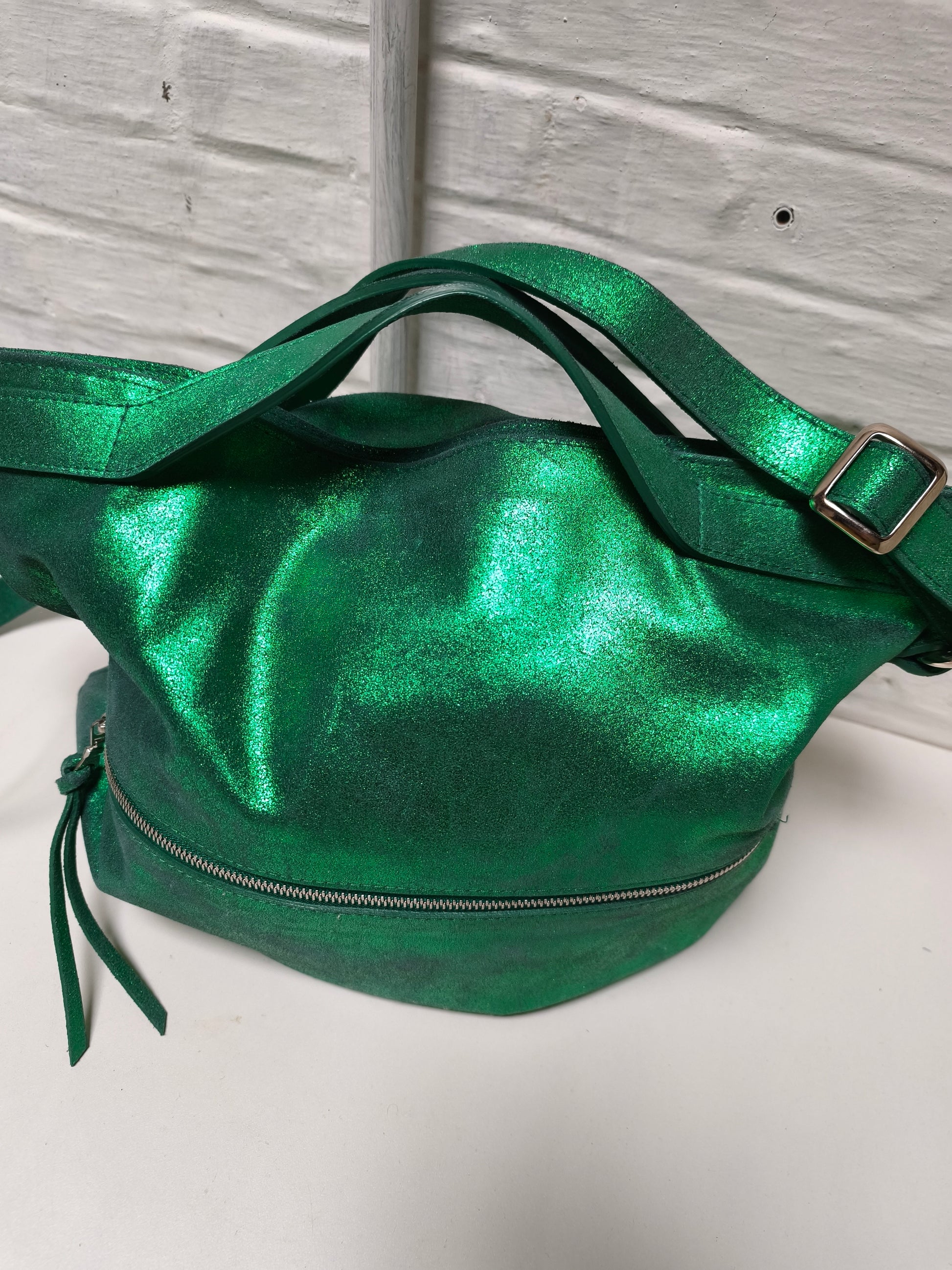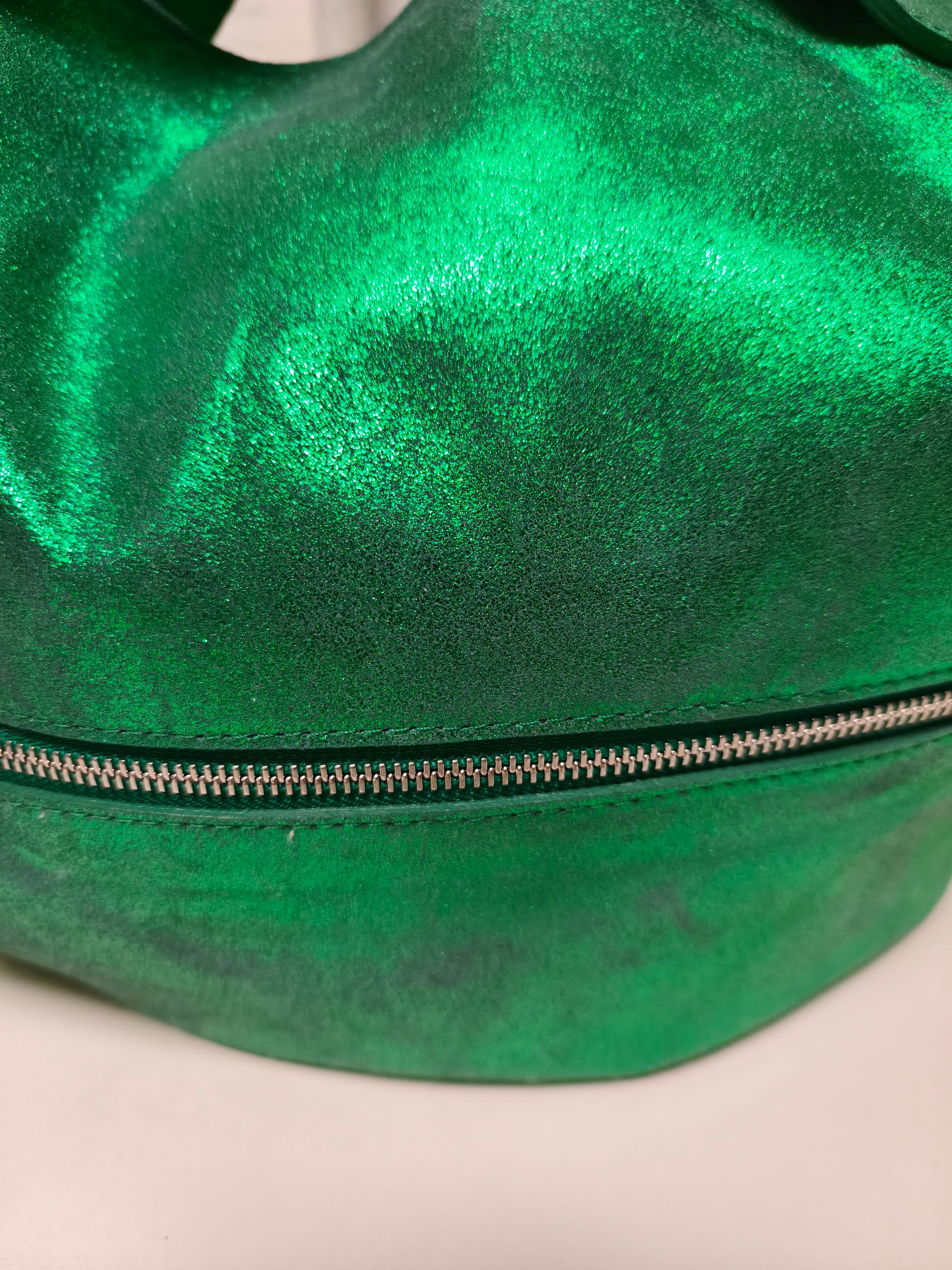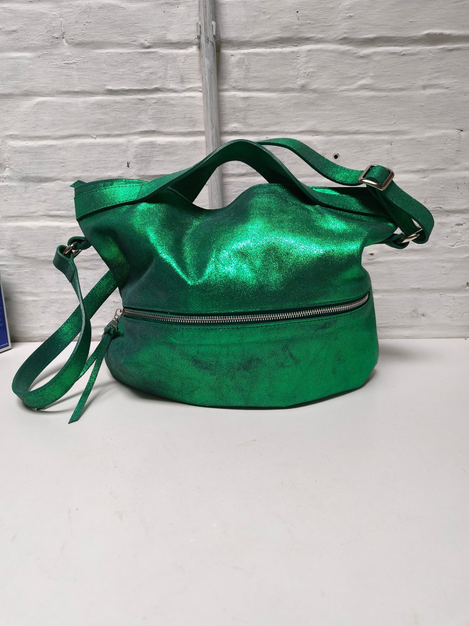 Handtas in metallic groen leer. Je kan de tas zowel aan de hand, aan de schouder als crossbody. Binnenin is de tas gevoerd in beige leer en bestaat ze uit één groot vak met enkele kleine vakjes. Op de voorkant van de tas bevindt zich ook nog een compartiment dat afgesloten is met een rits. De handtas zelf sluit ook met een rits. Je kan je hele hebben en houden kwijt in deze tas.