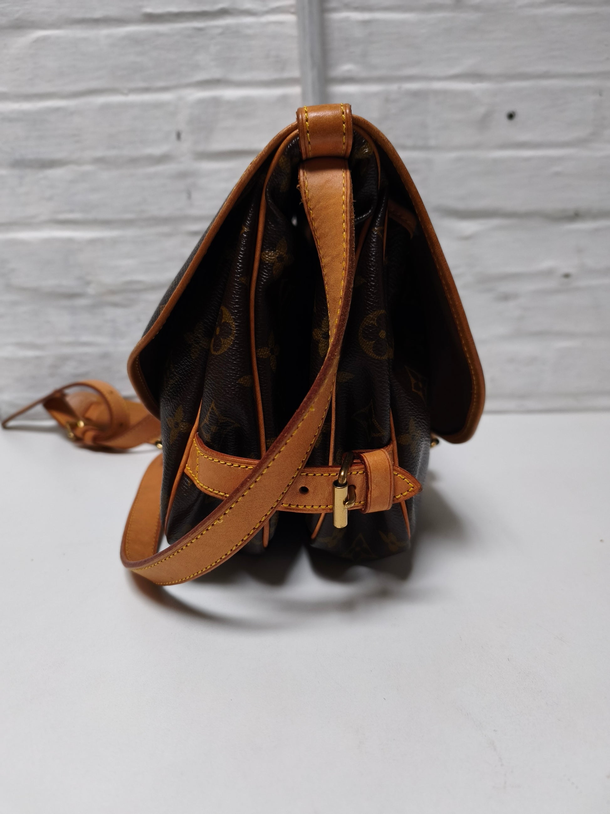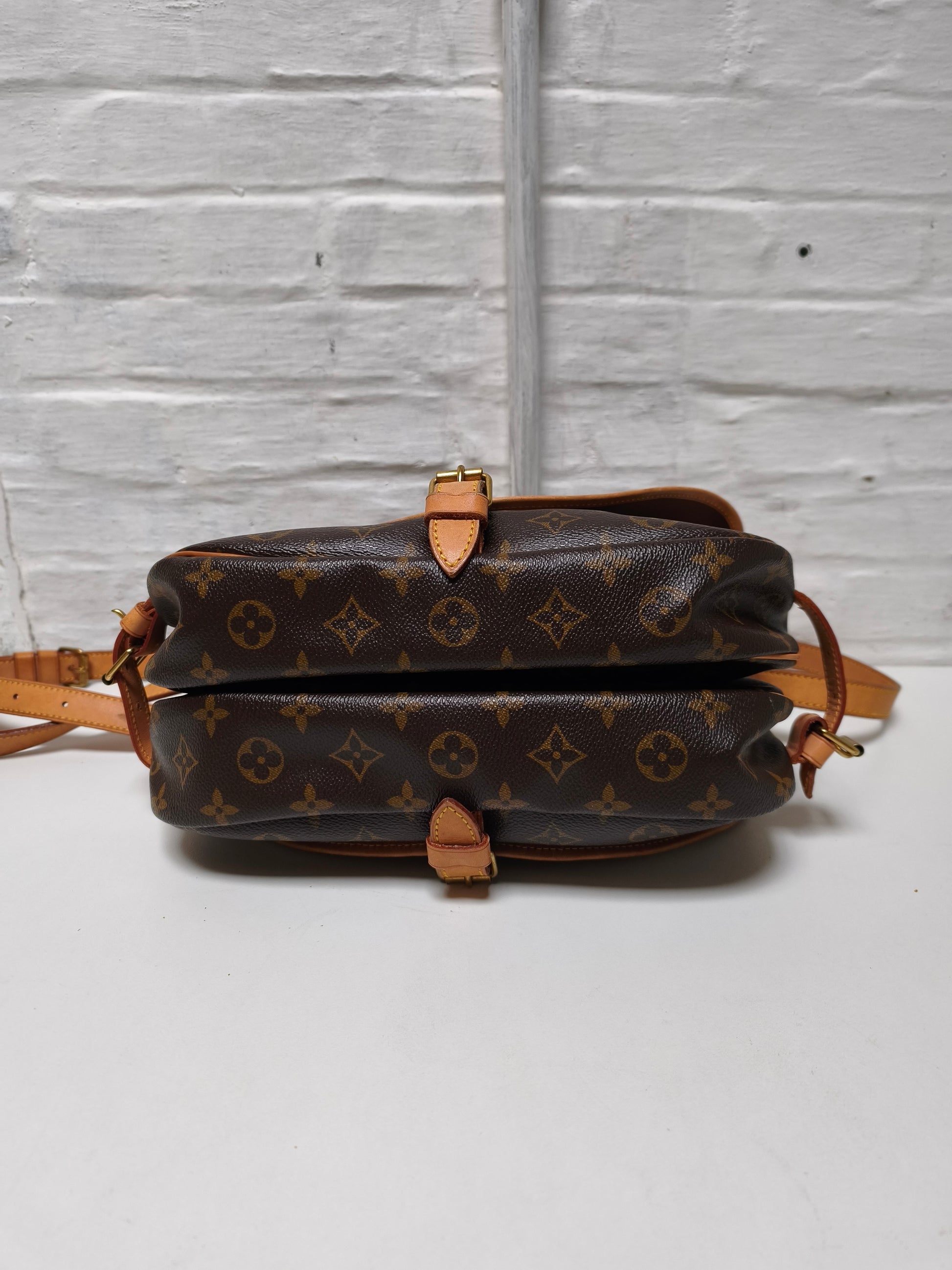 De Louis Vuitton Saumur 30 Monogram canvas met Vachetta-leren details en goudkleurige metalen hardware.