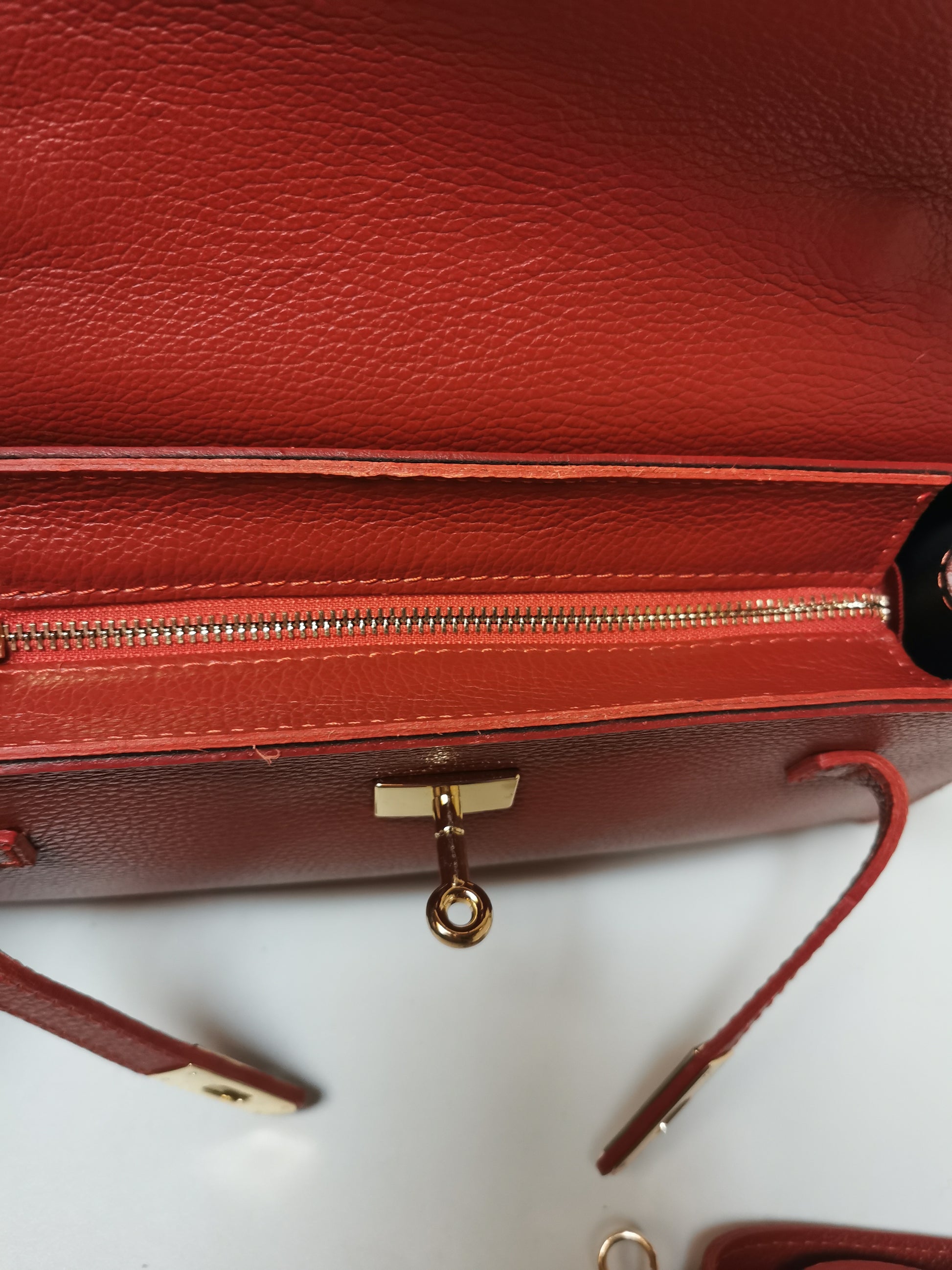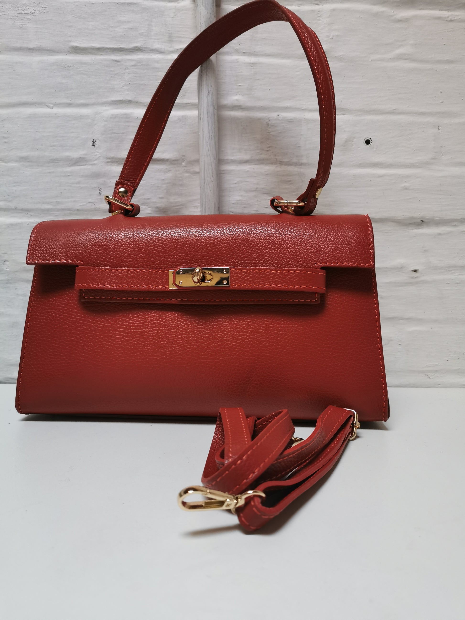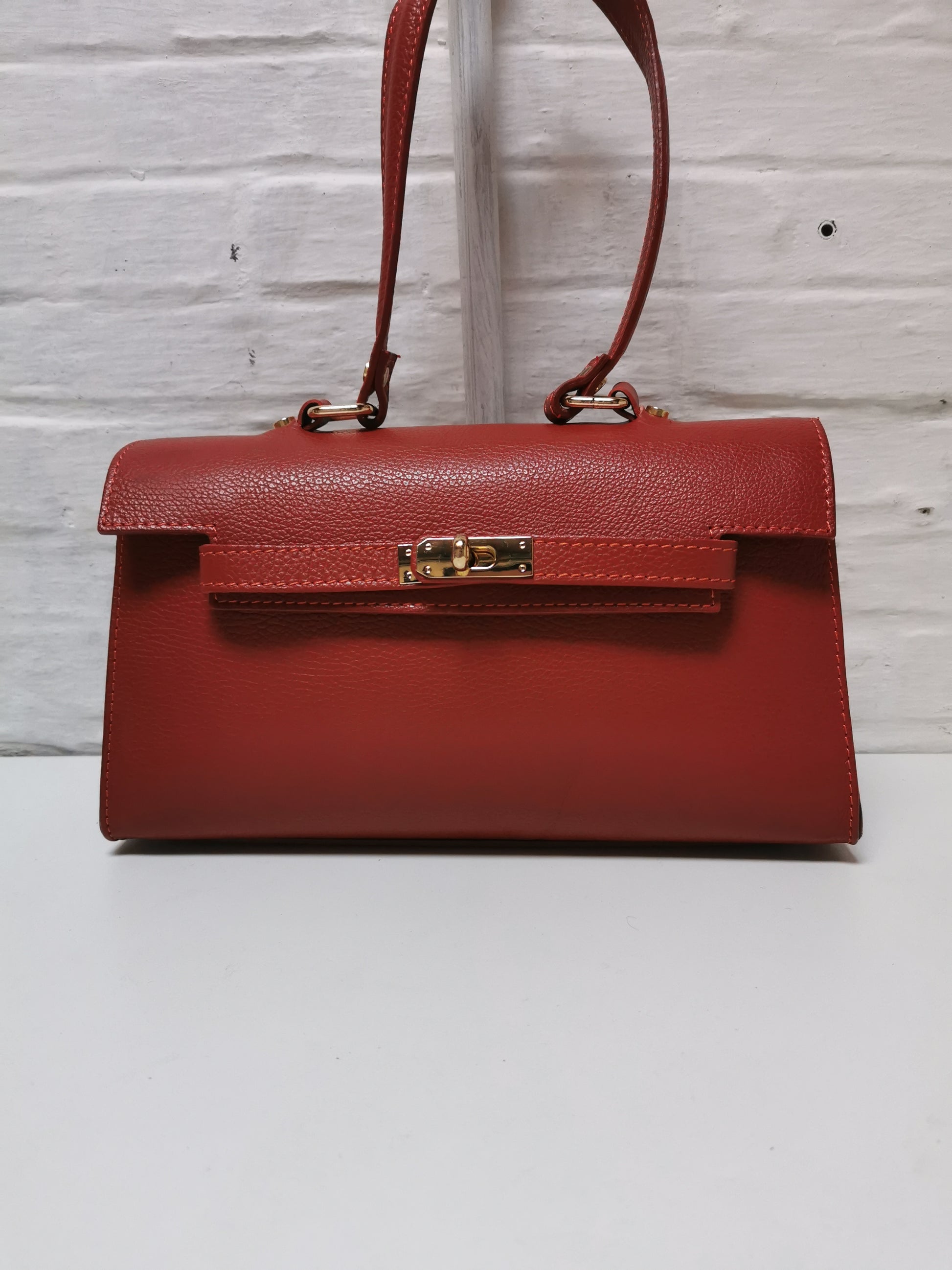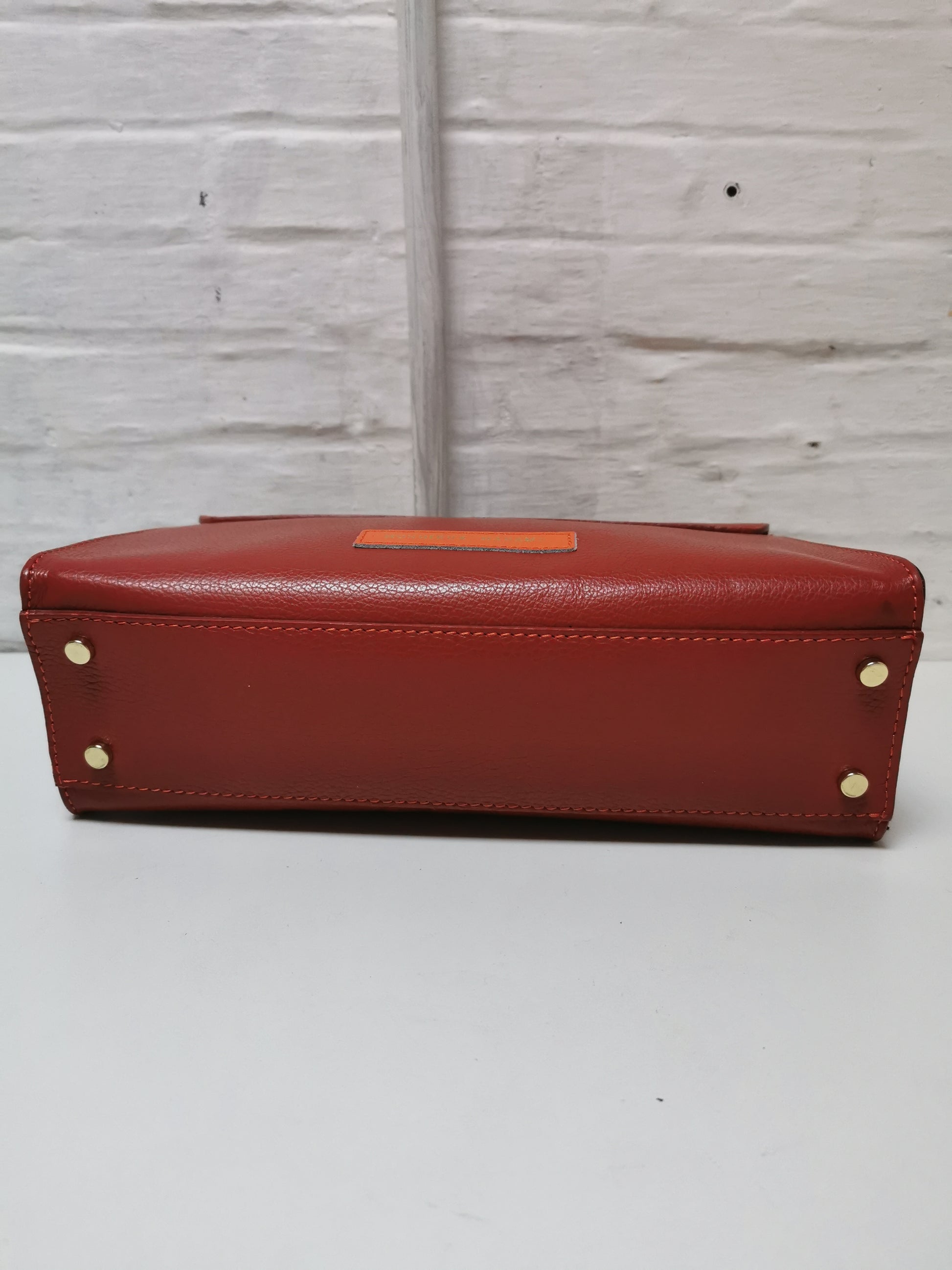 Handtas in roestkleurig leer. De tas heeft één groot vak met een klein ritszakje en sluit met een rits en een draaislotje. Ze kan aan de hand, schouder of crossbody gedragen worden door de extra schouderband, die je kan afnemen.