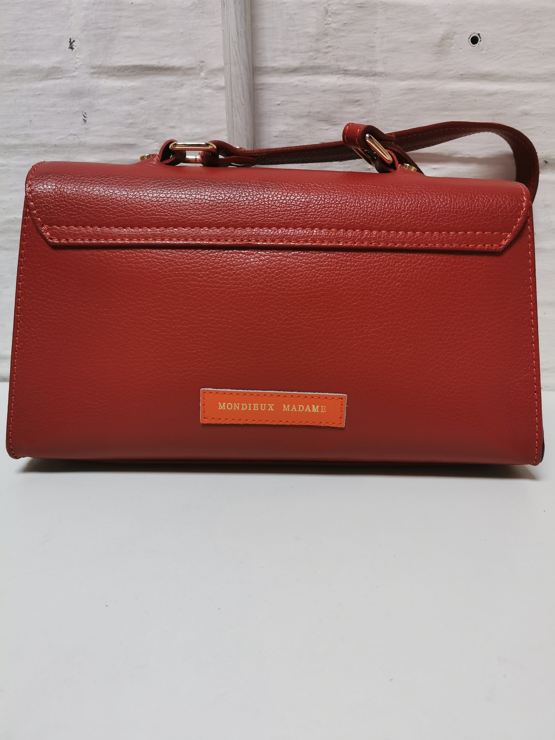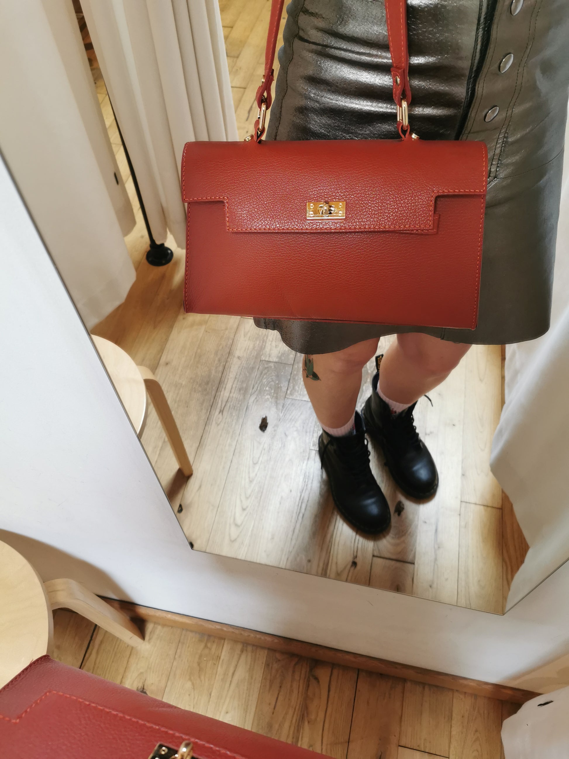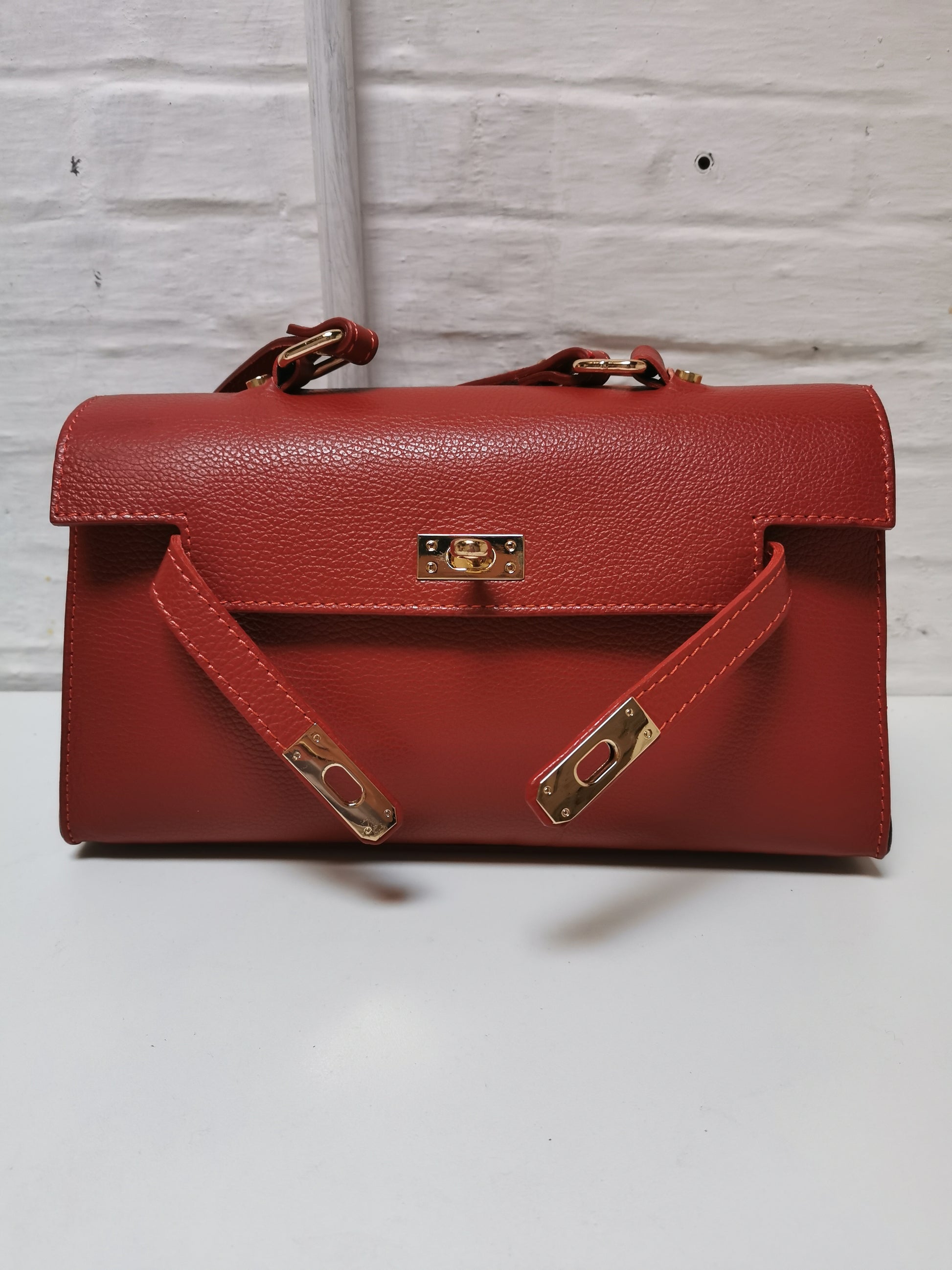 Handtas in roestkleurig leer. De tas heeft één groot vak met een klein ritszakje en sluit met een rits en een draaislotje. Ze kan aan de hand, schouder of crossbody gedragen worden door de extra schouderband, die je kan afnemen.