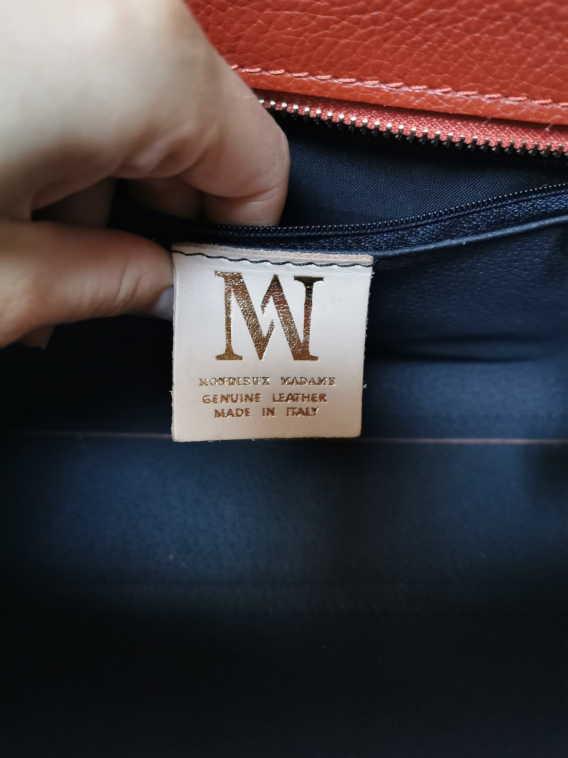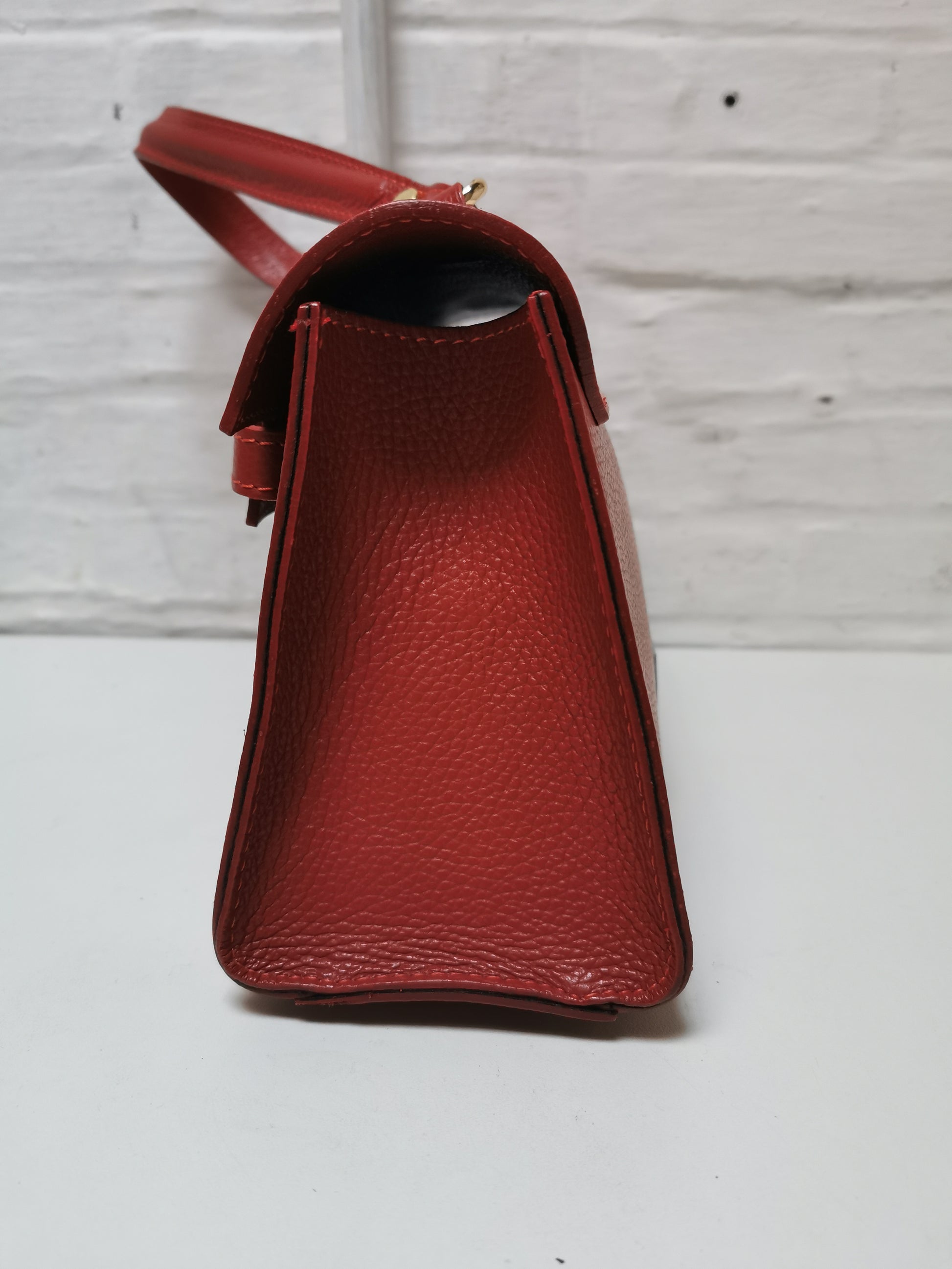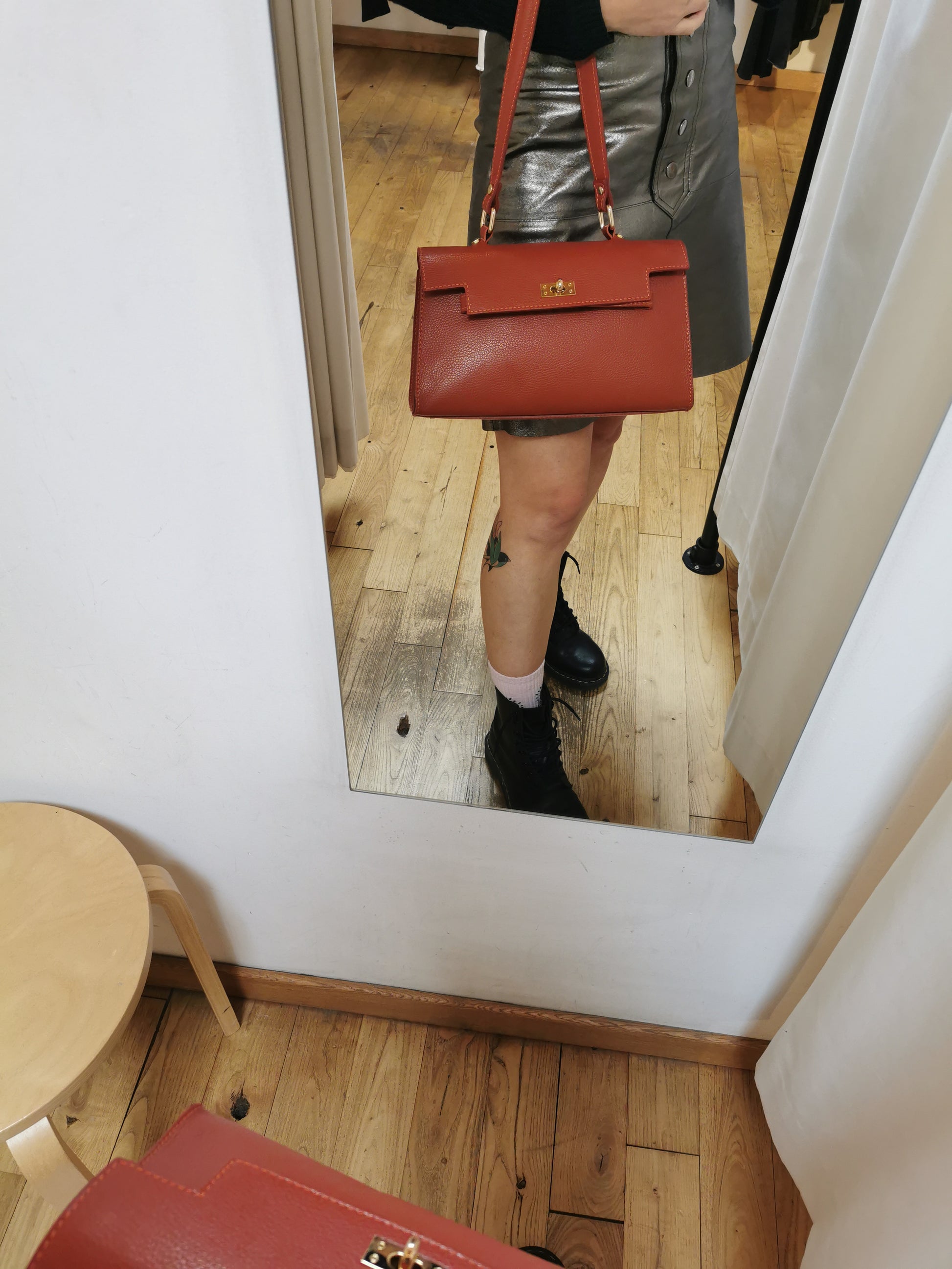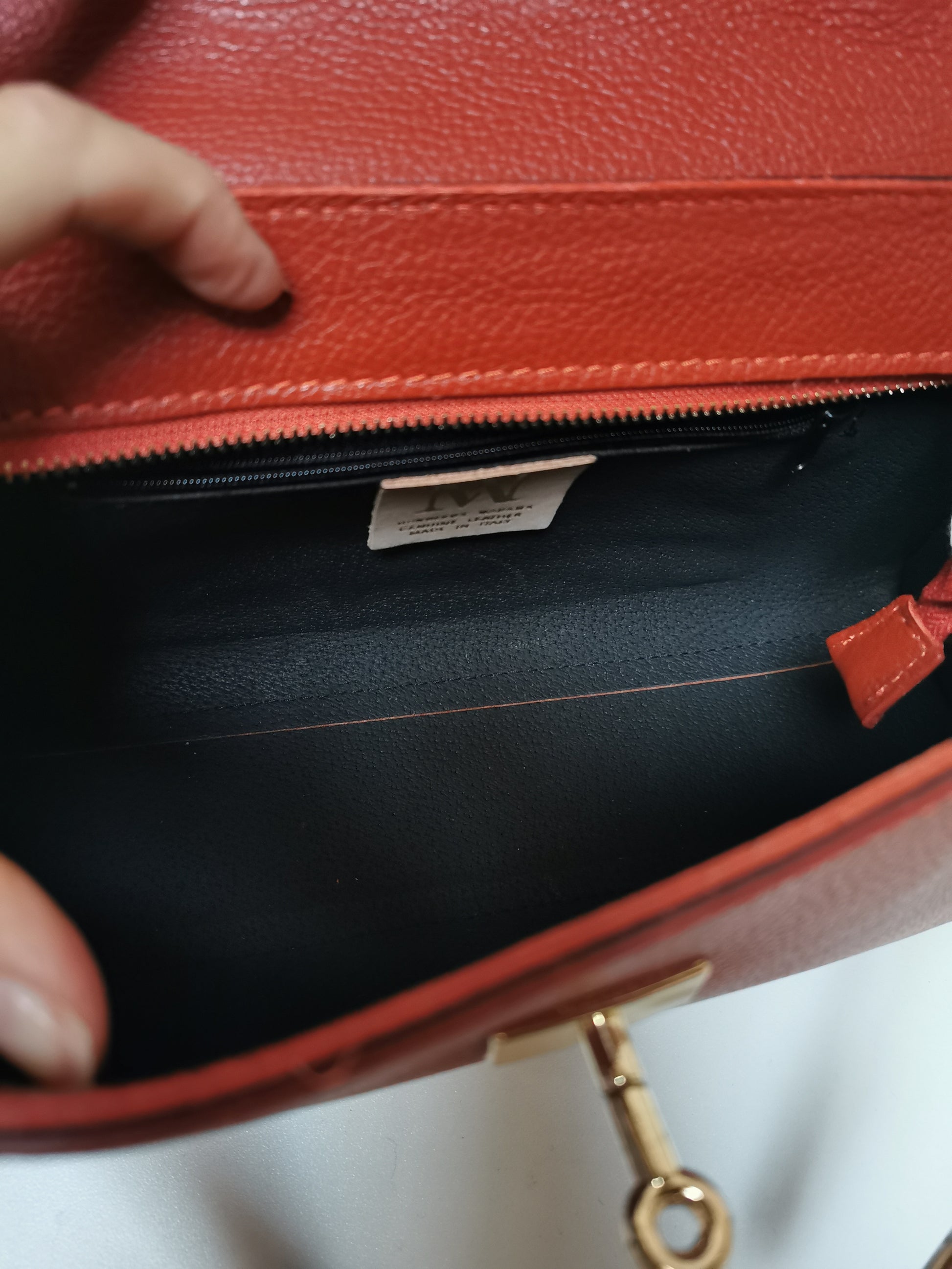 Handtas in roestkleurig leer. De tas heeft één groot vak met een klein ritszakje en sluit met een rits en een draaislotje. Ze kan aan de hand, schouder of crossbody gedragen worden door de extra schouderband, die je kan afnemen.