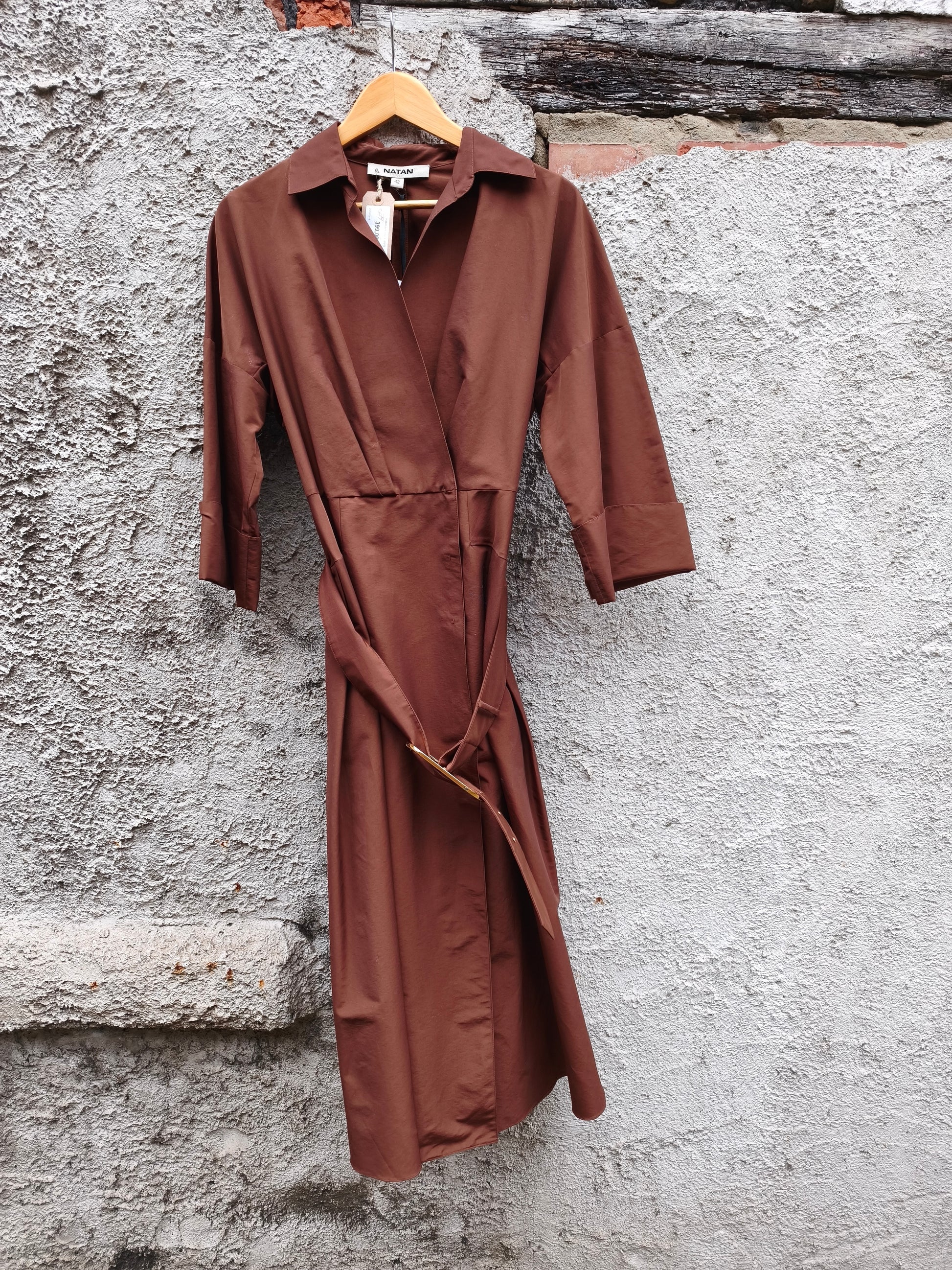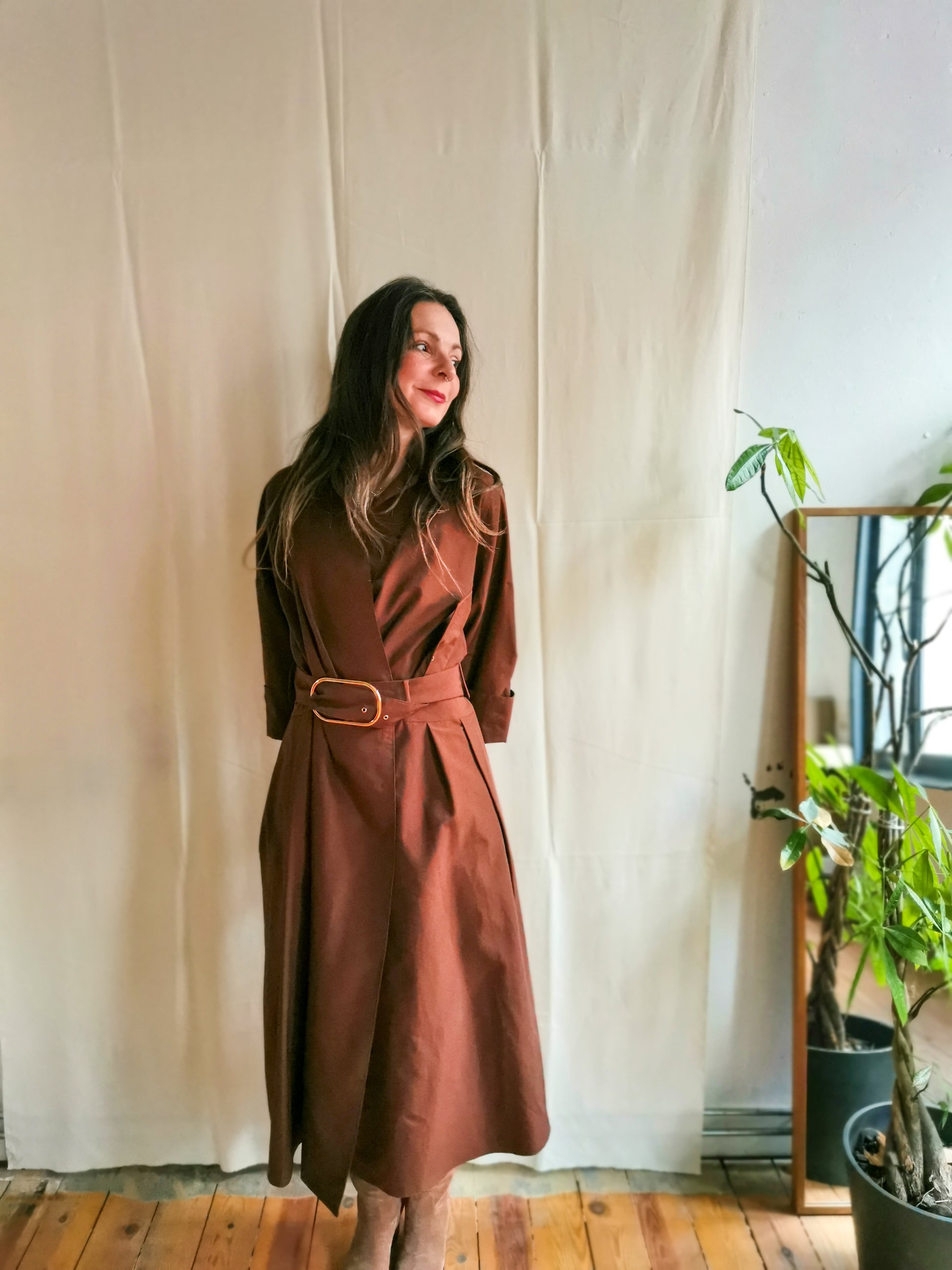 Jurk in prachtige, stevige bruine stof. Overslagmodel, sluit met drukknopen en lintje.