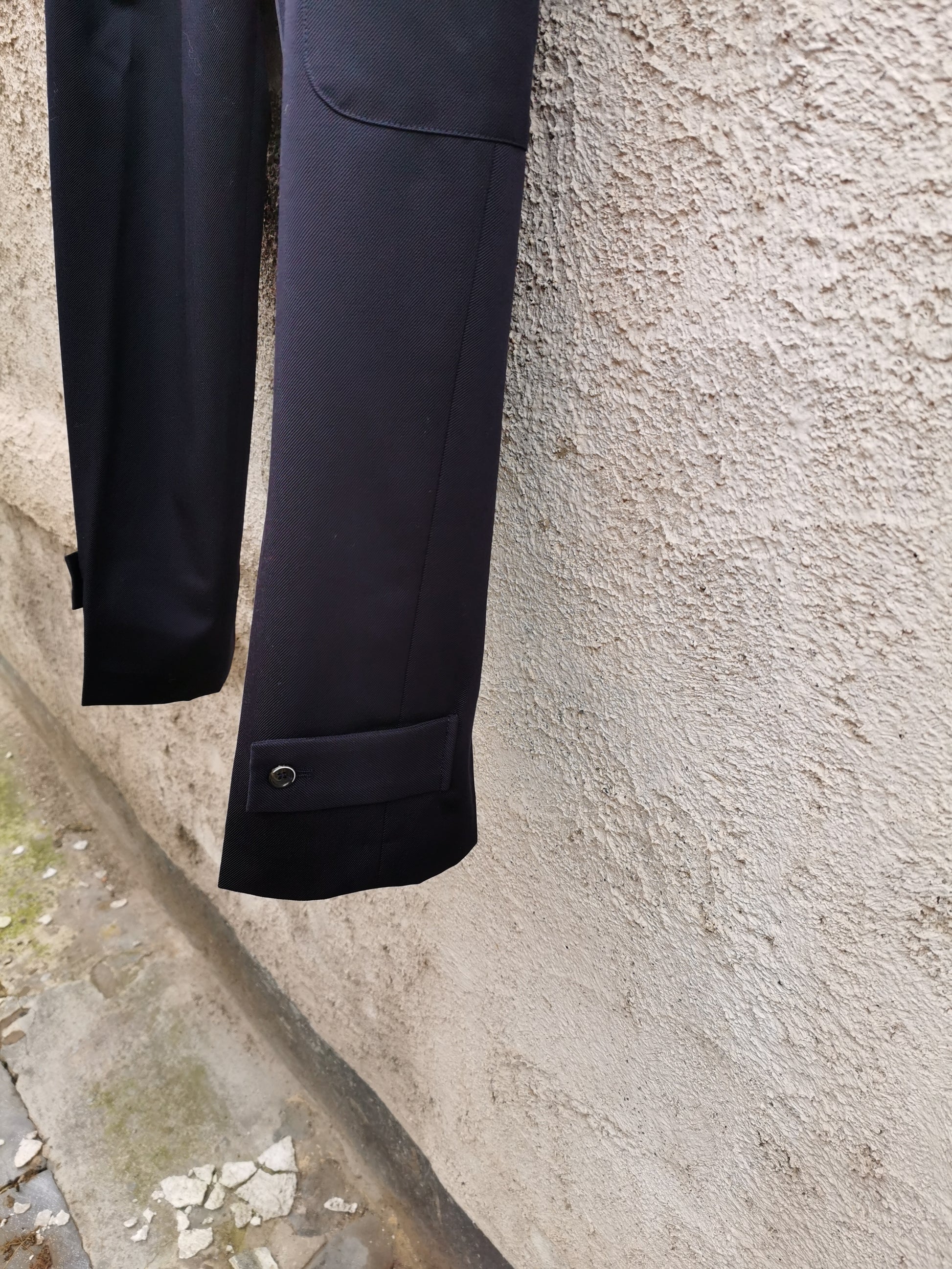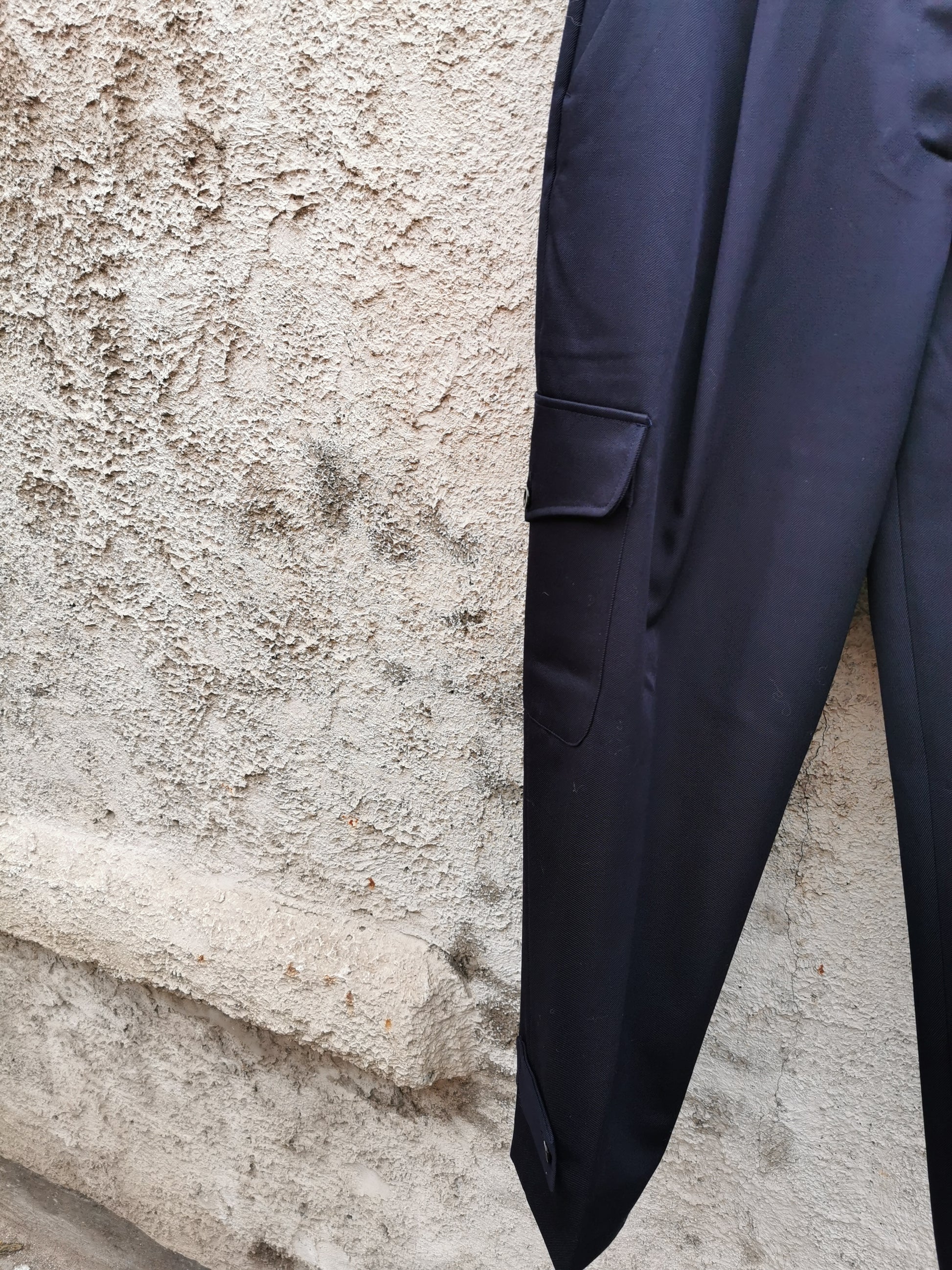 Cargopants, maar dan met een tailored snit. In een stevige, wollen gabardine.