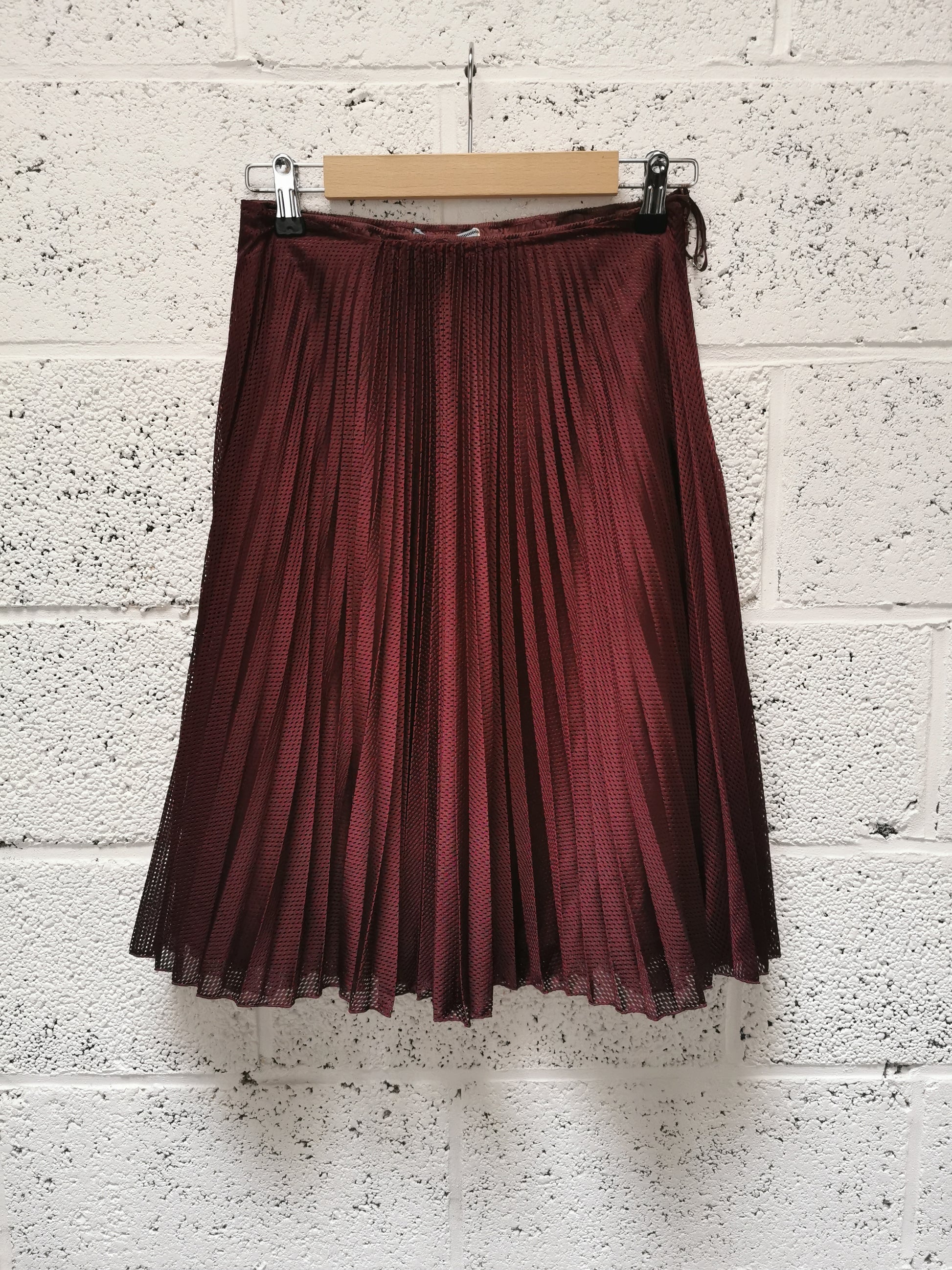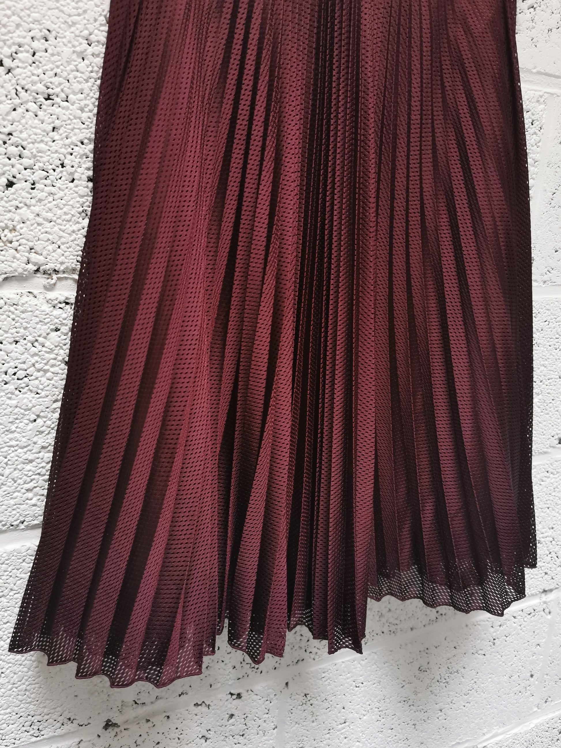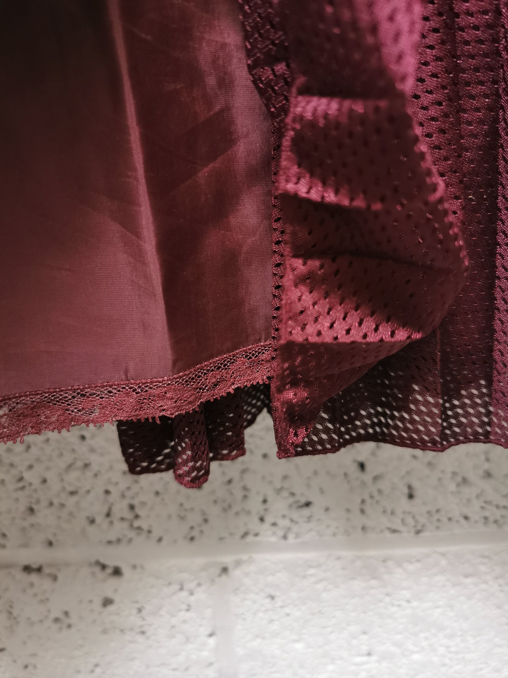 Rok in bordeauxkleurige mesh met aparte onderrok. Bovenrok sluit met rits in zijnaad. Onderrok sluit met knoopje.