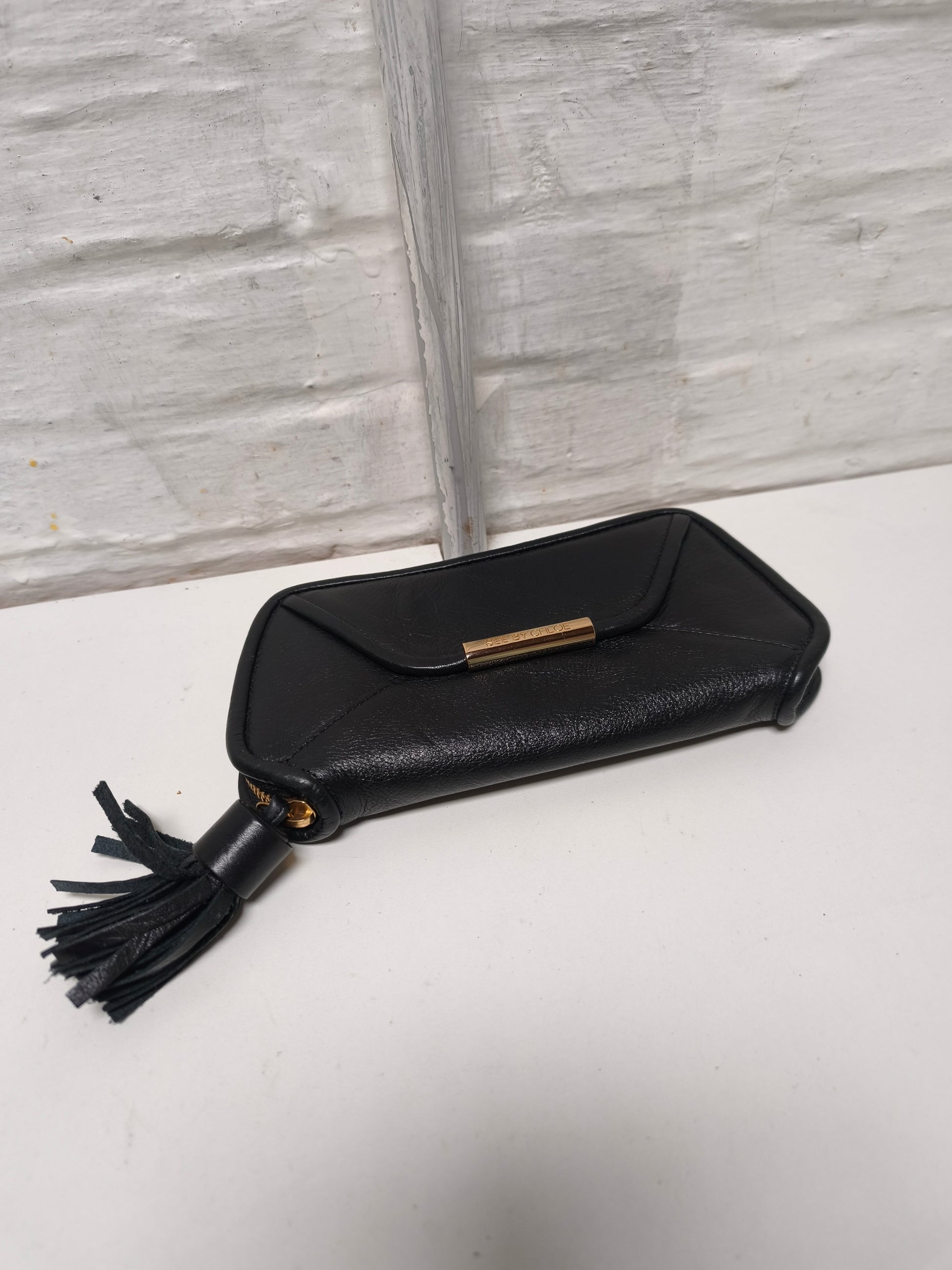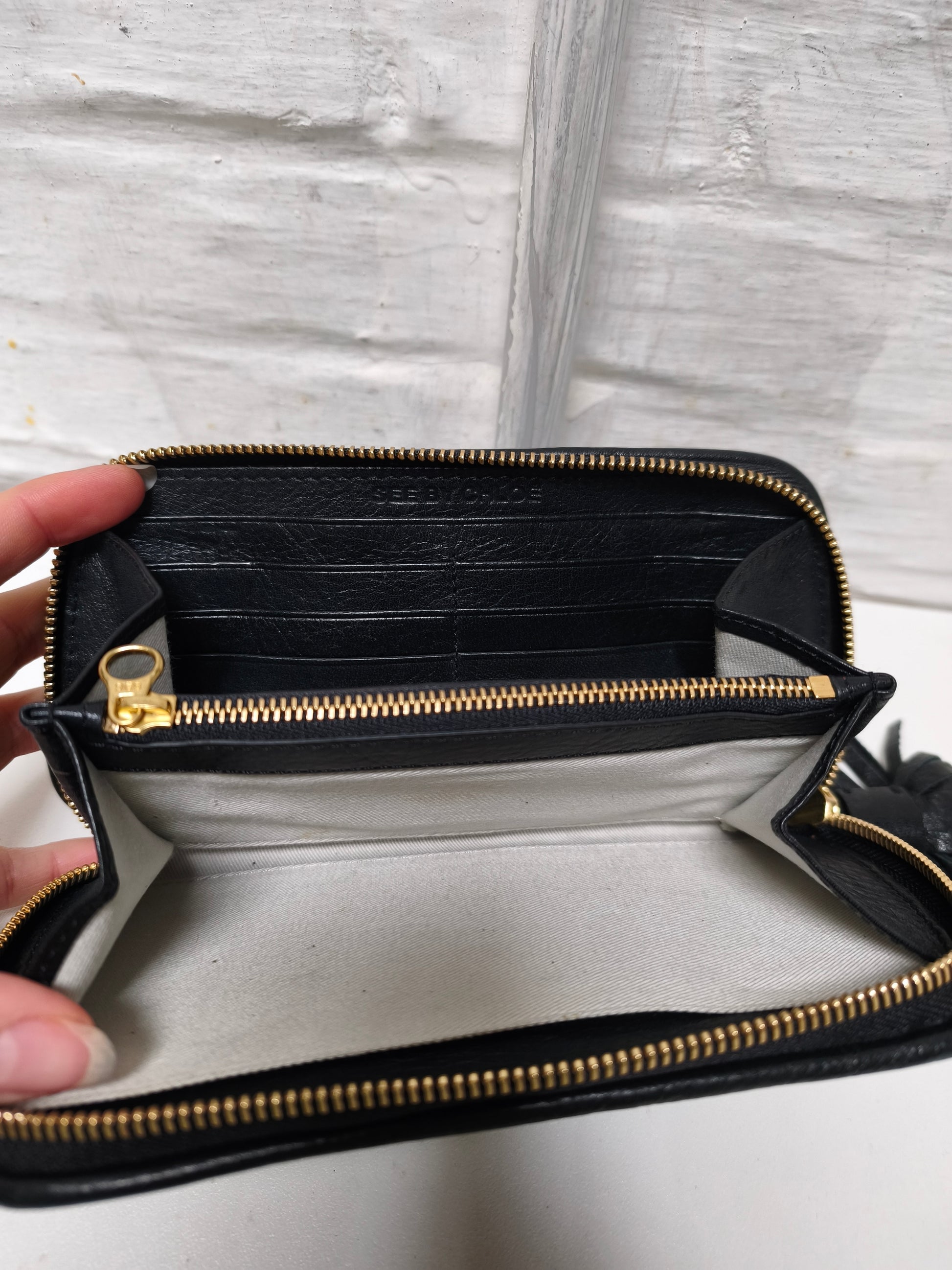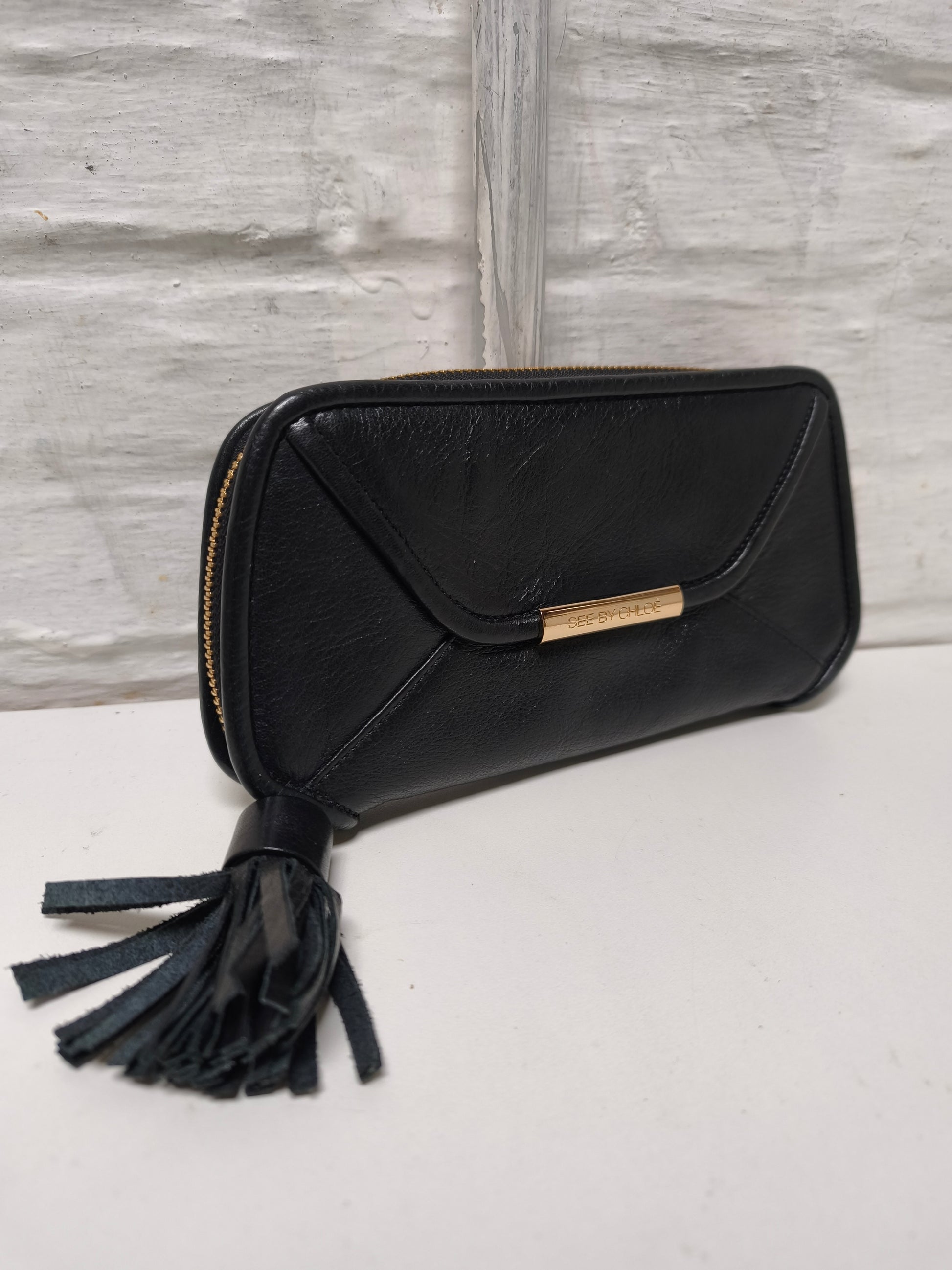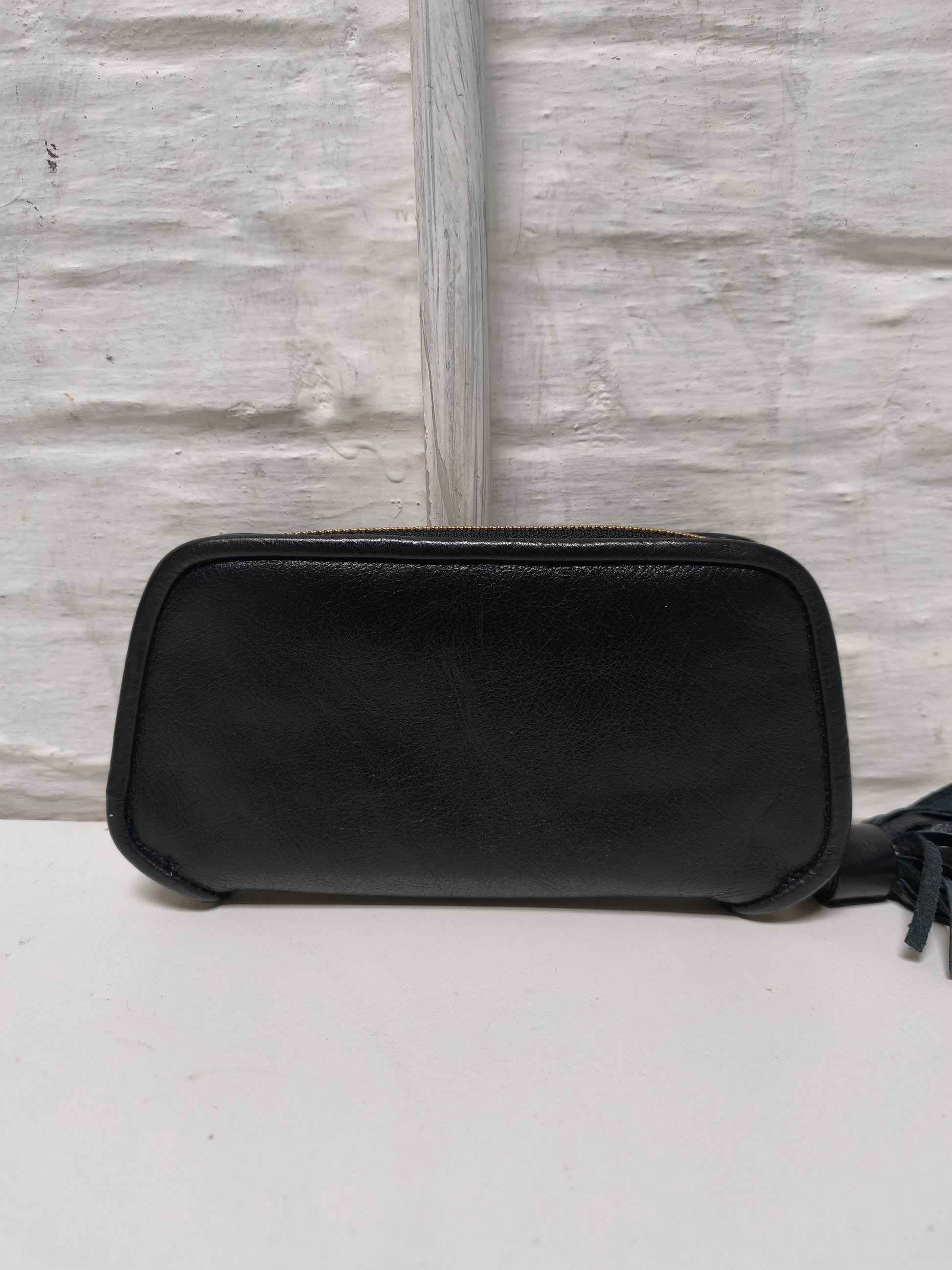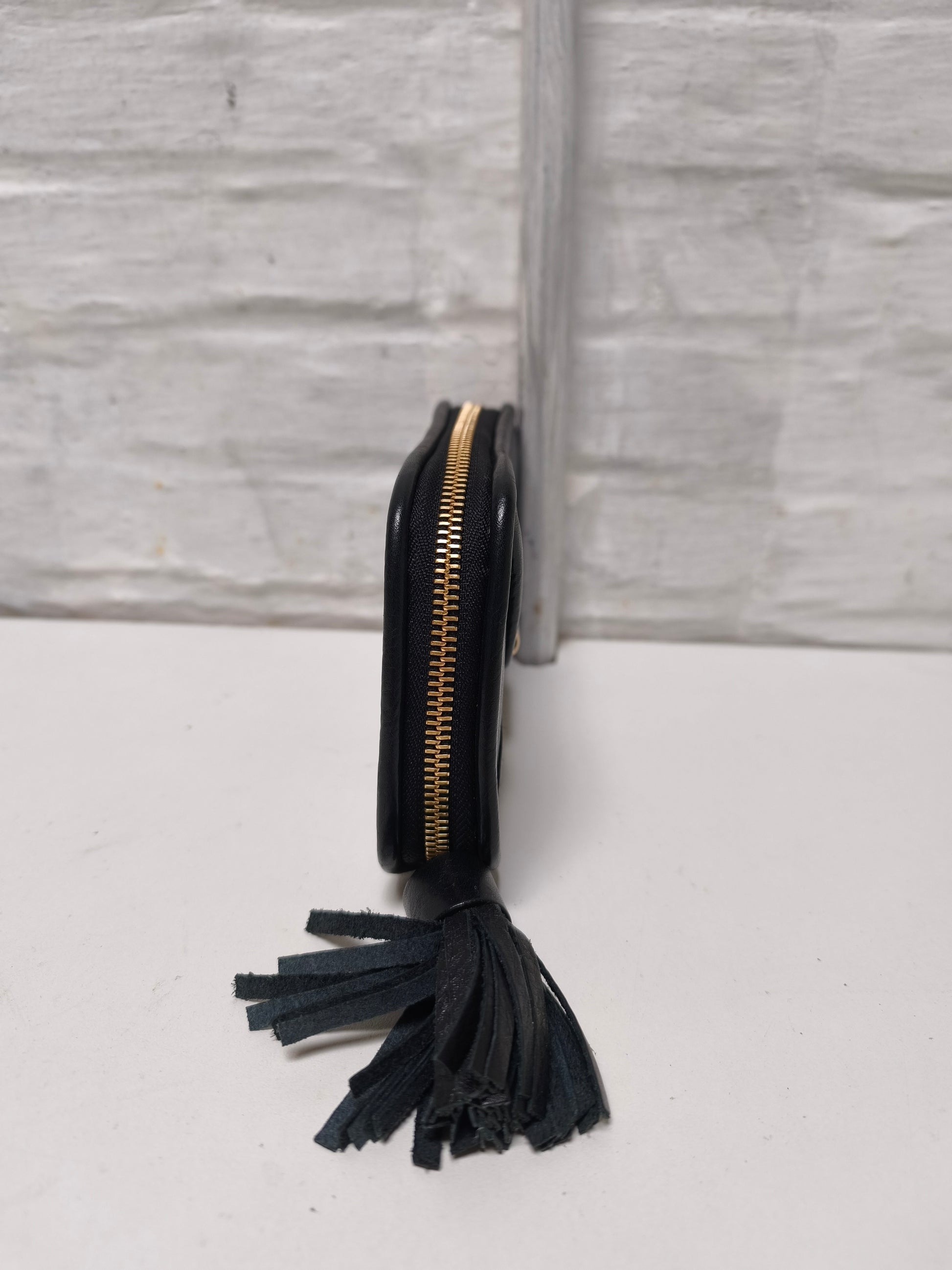 Portefeuille in zwart leer met goudkleurig metalen hardware en kwastje. De binnenkant is gevoerd in beige canvas