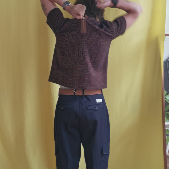 Top in geweven structuur met navy en bruine draad. De kraag is afgewerkt met plastic kralen en de top sluit op de rug met een rits.