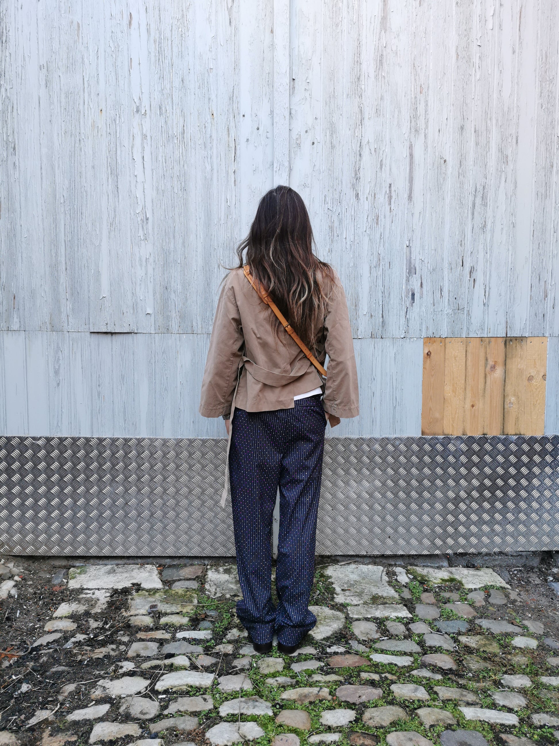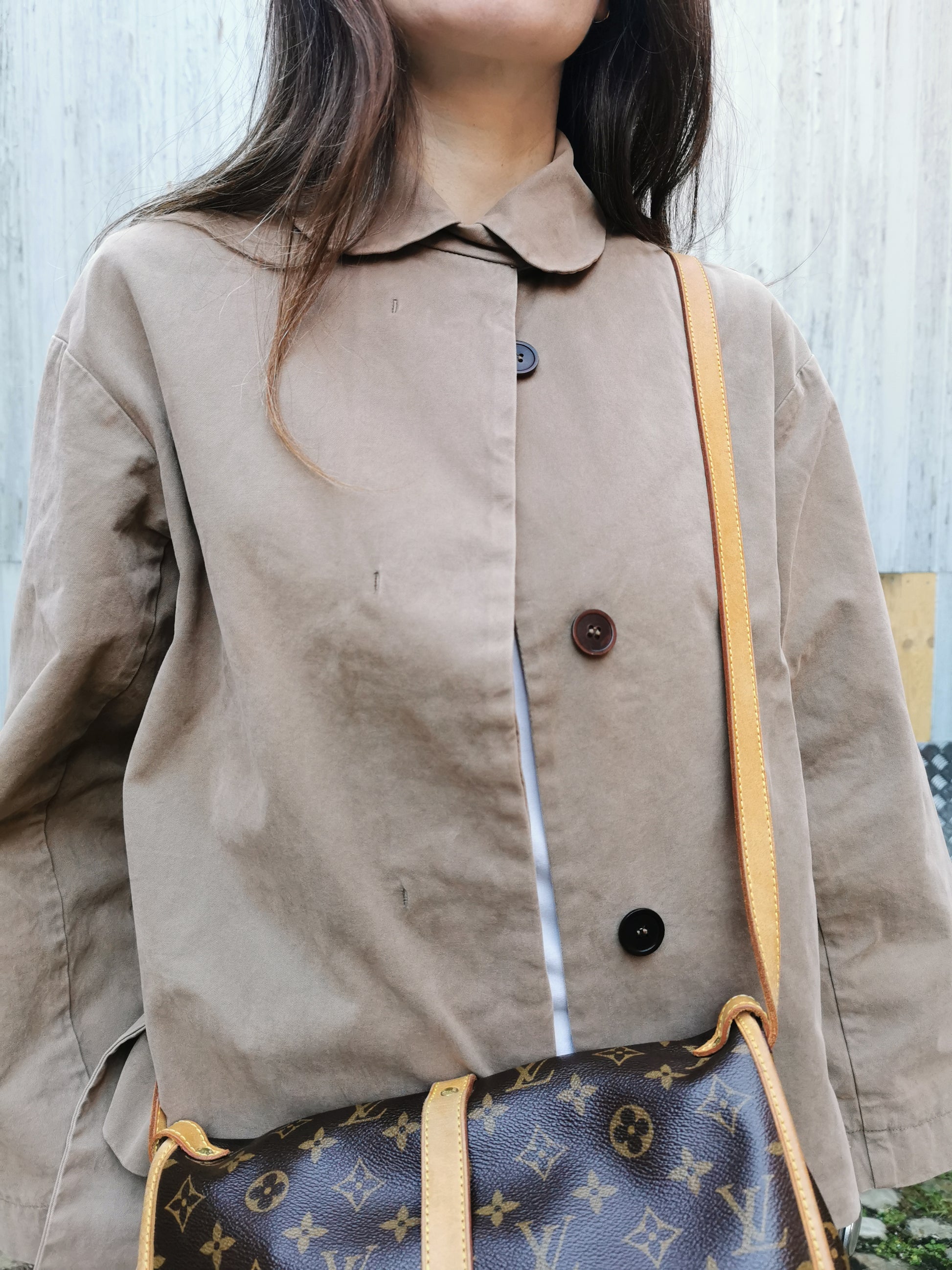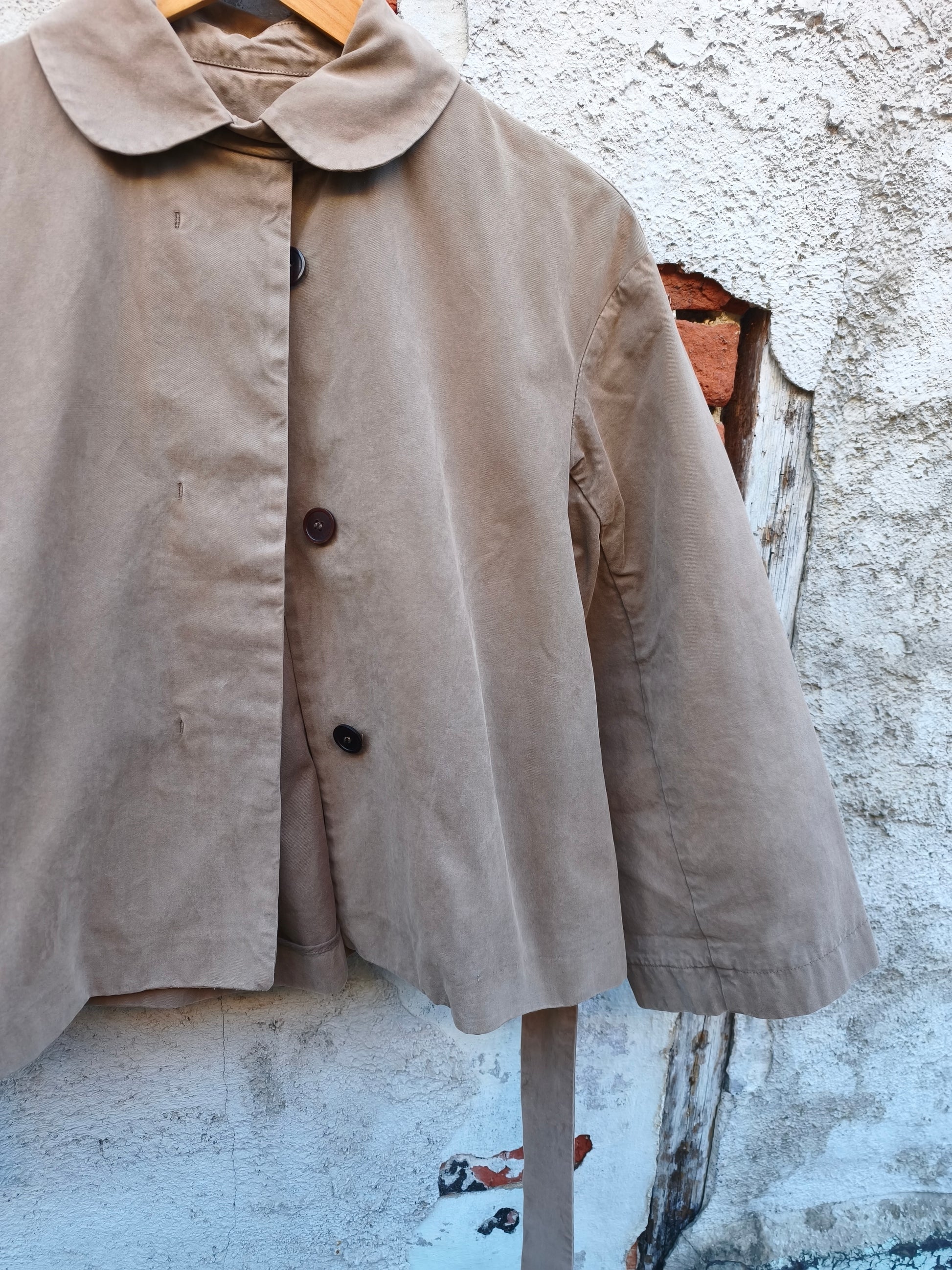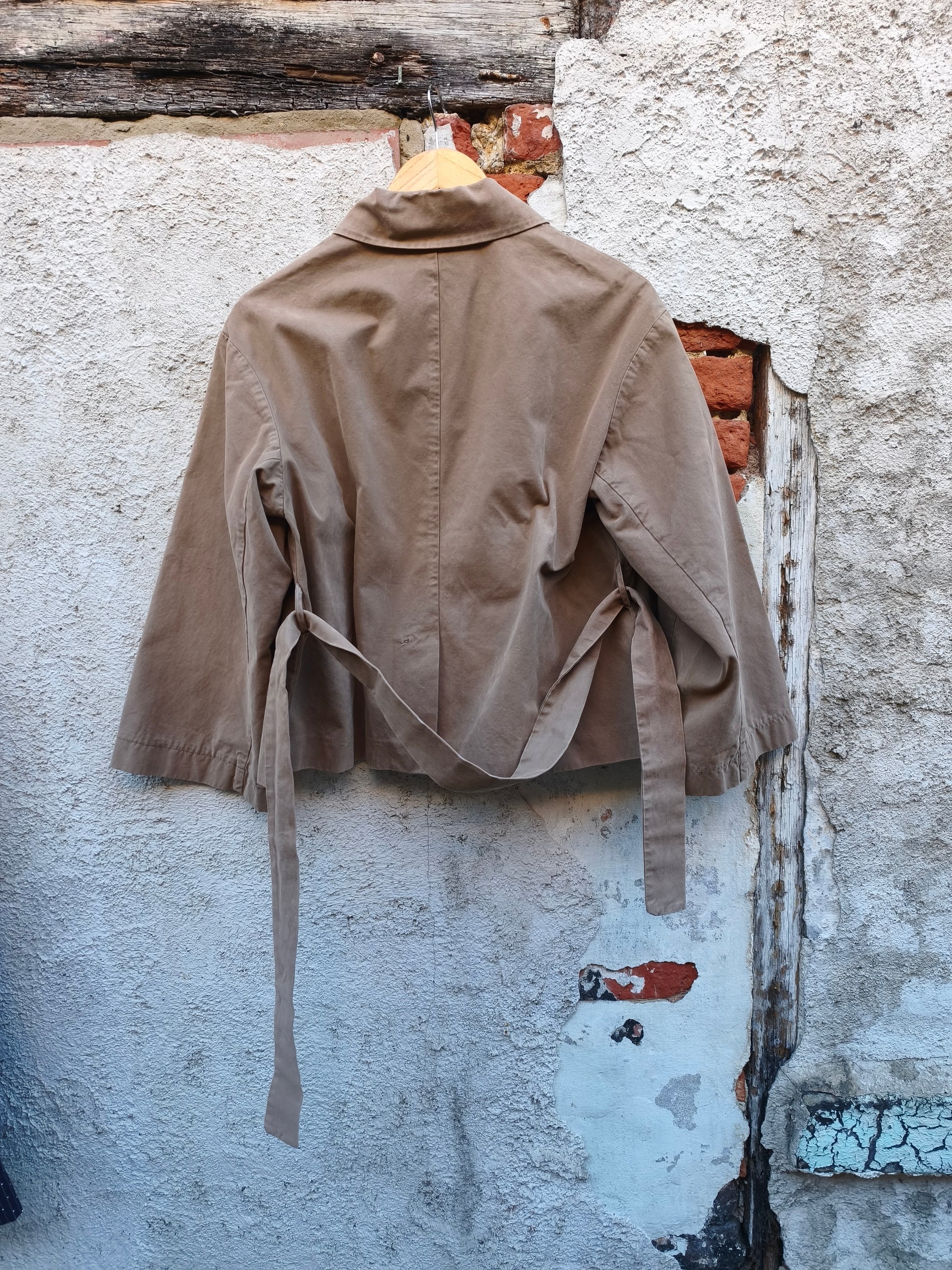 Lichtbruin jasje met blinde knoopsluiting en ceintuur.