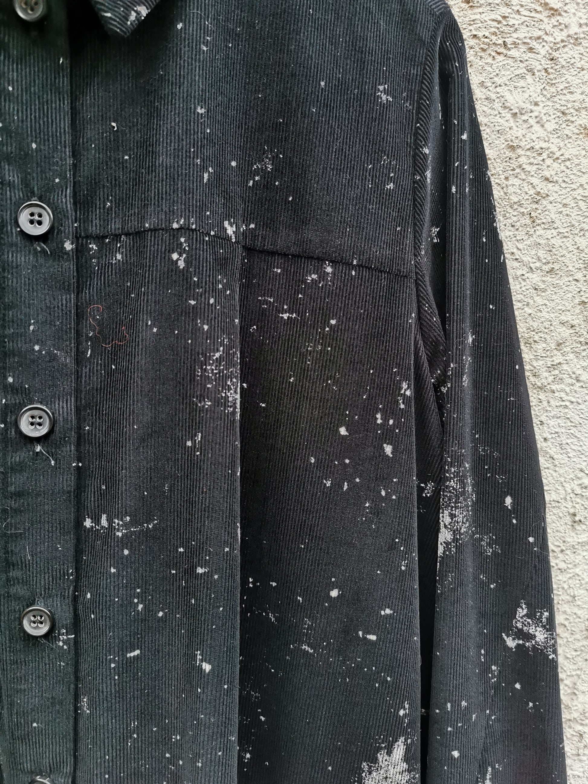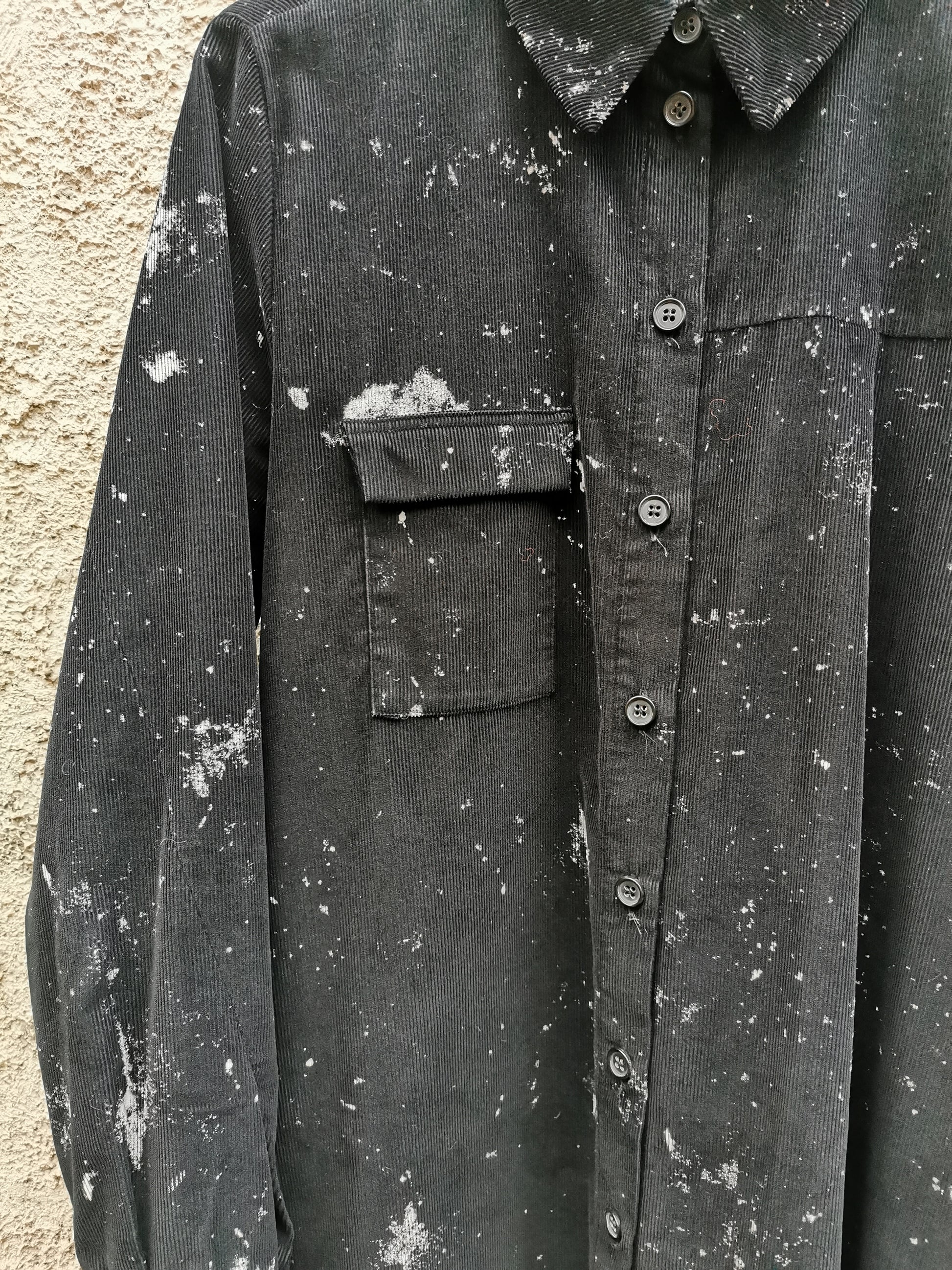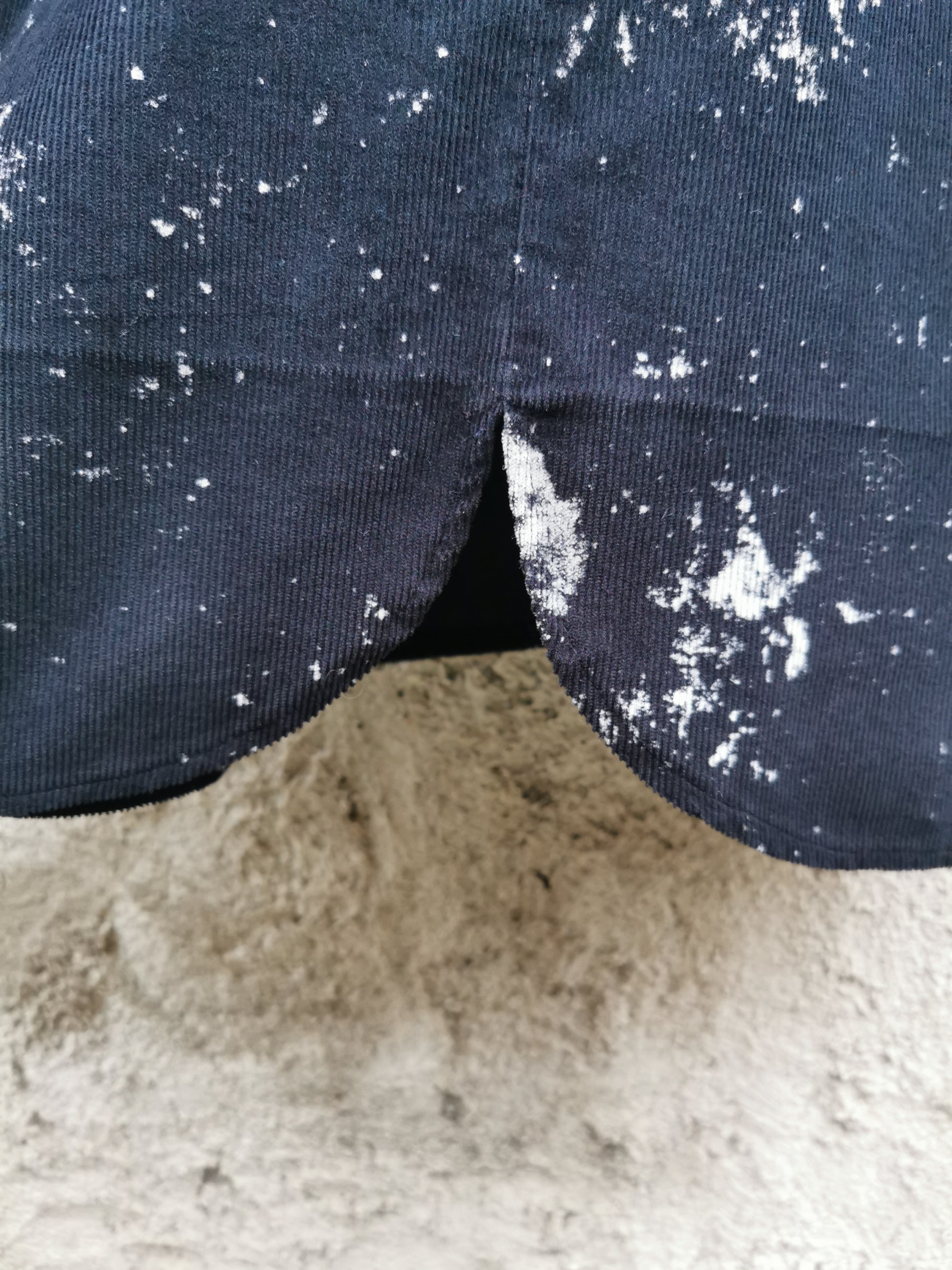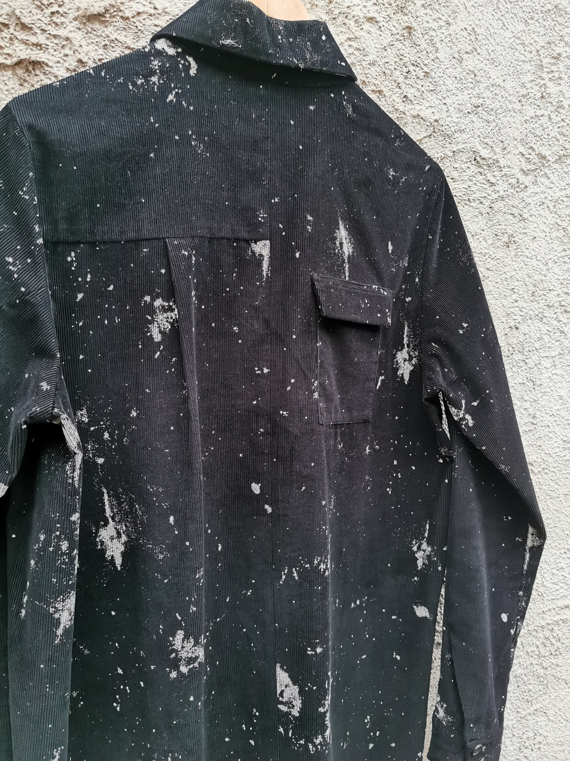 Hemdjurk in zwarte fluweel met Stardust print. Originele designdetails zoals asymmetrische manchet, borstzakje op de rug en split in de zoom.