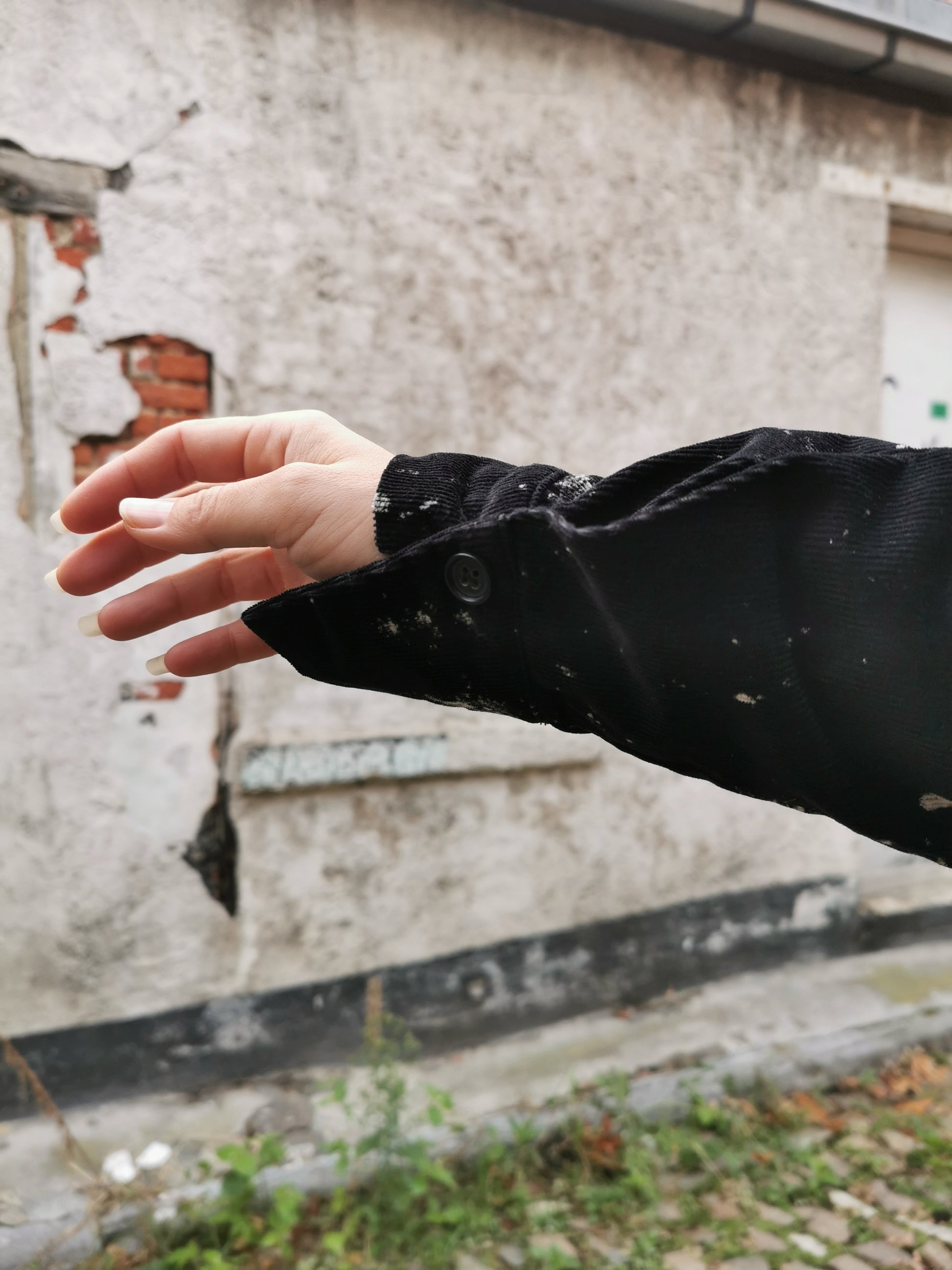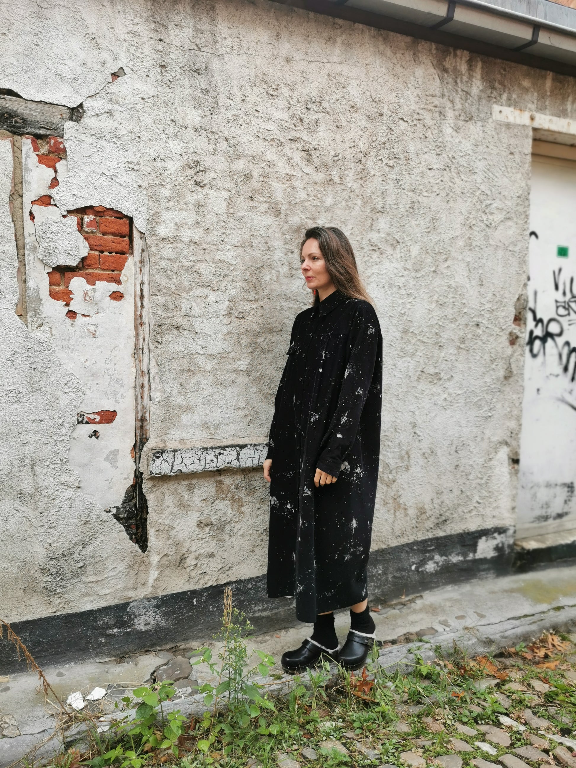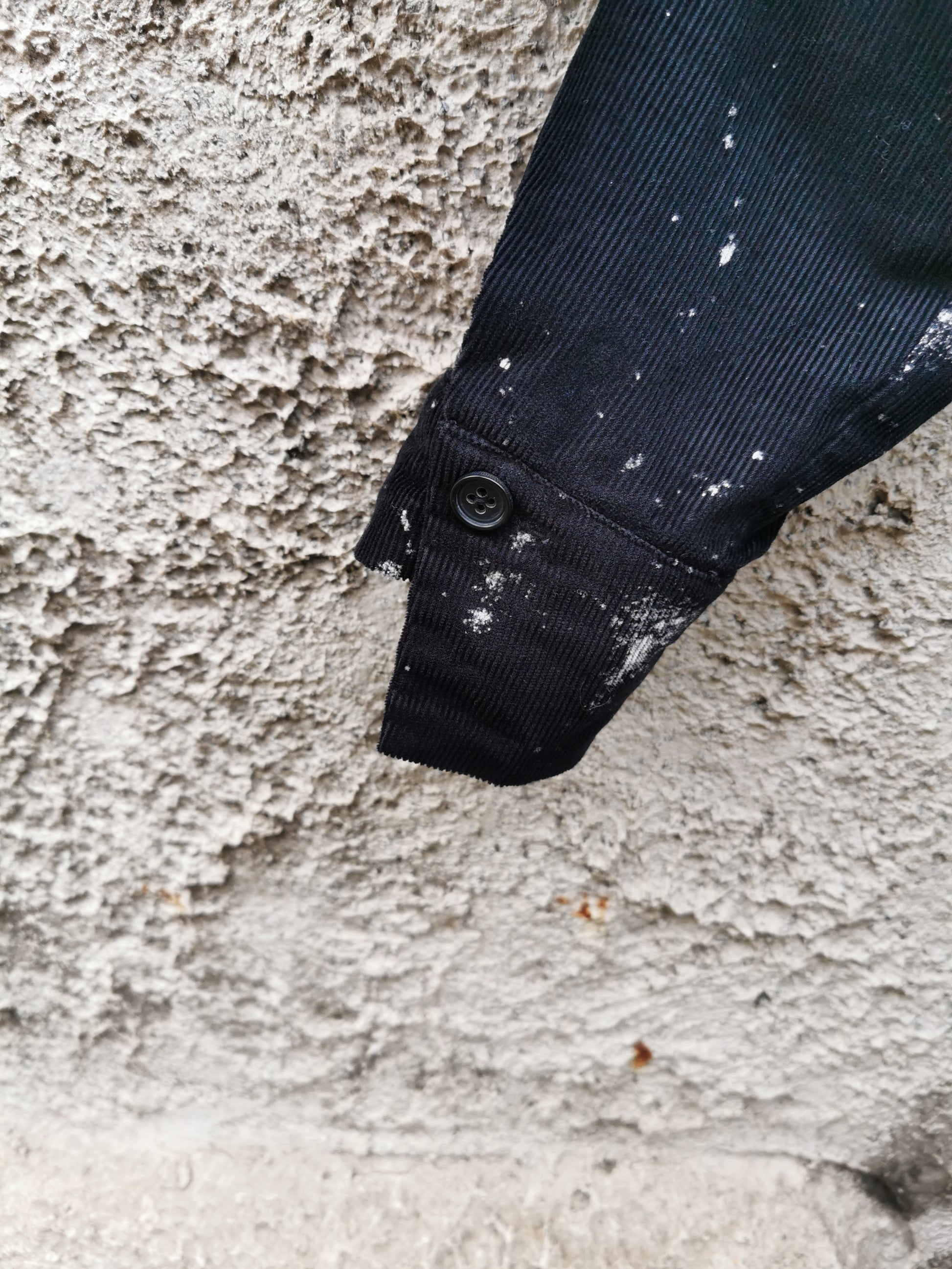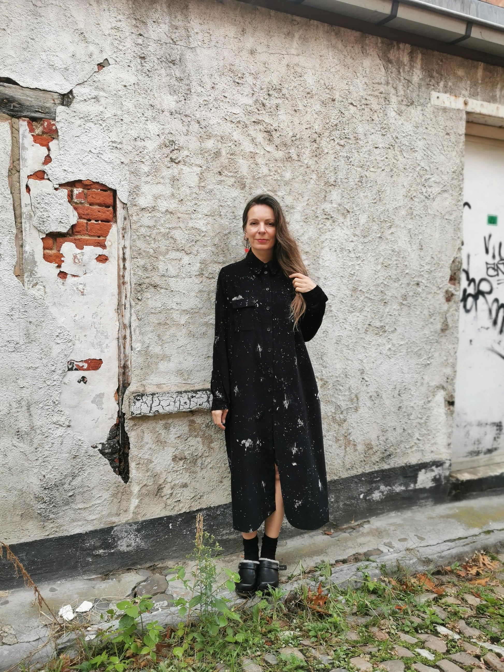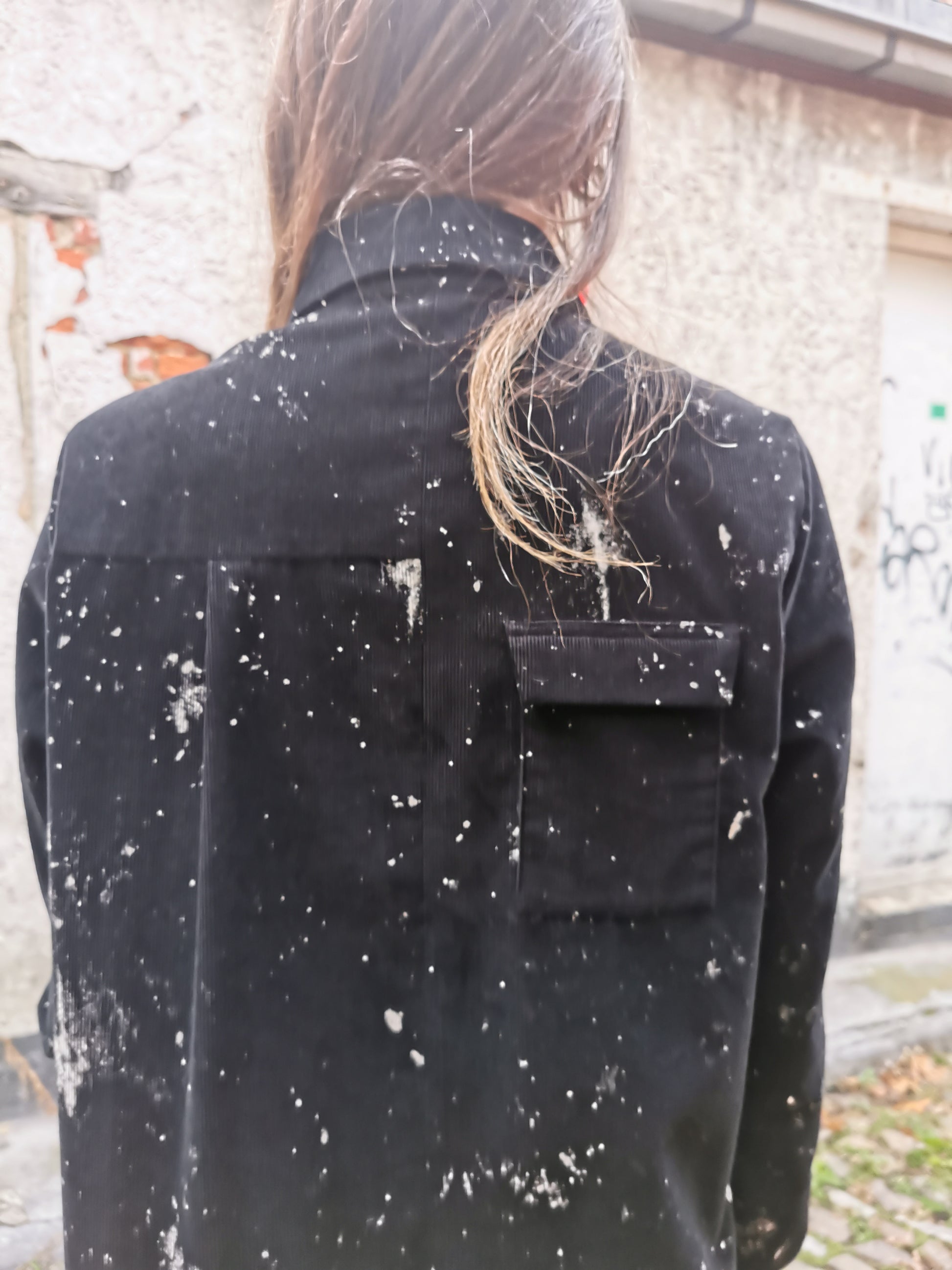 Hemdjurk in zwarte fluweel met Stardust print. Originele designdetails zoals asymmetrische manchet, borstzakje op de rug en split in de zoom.