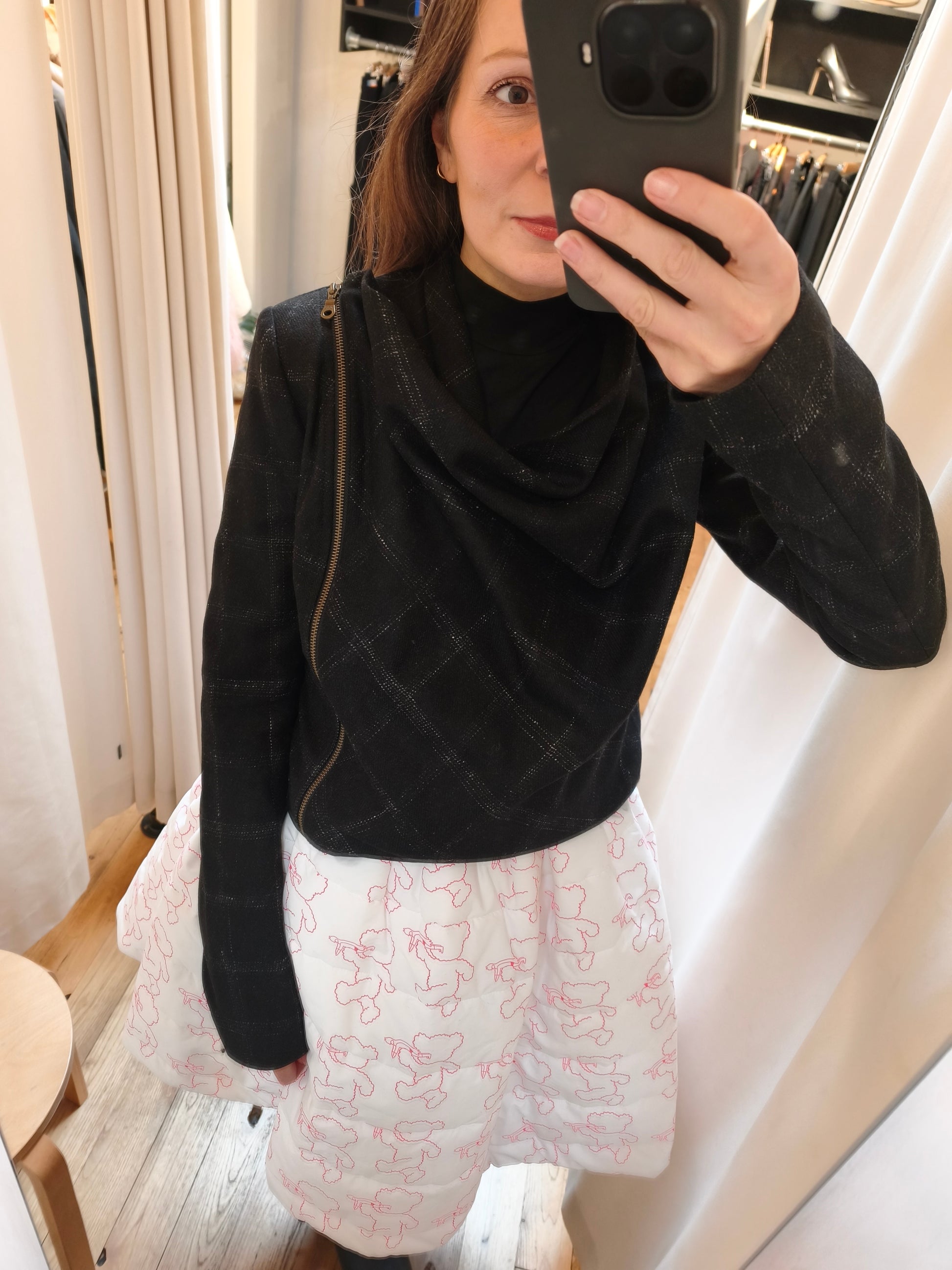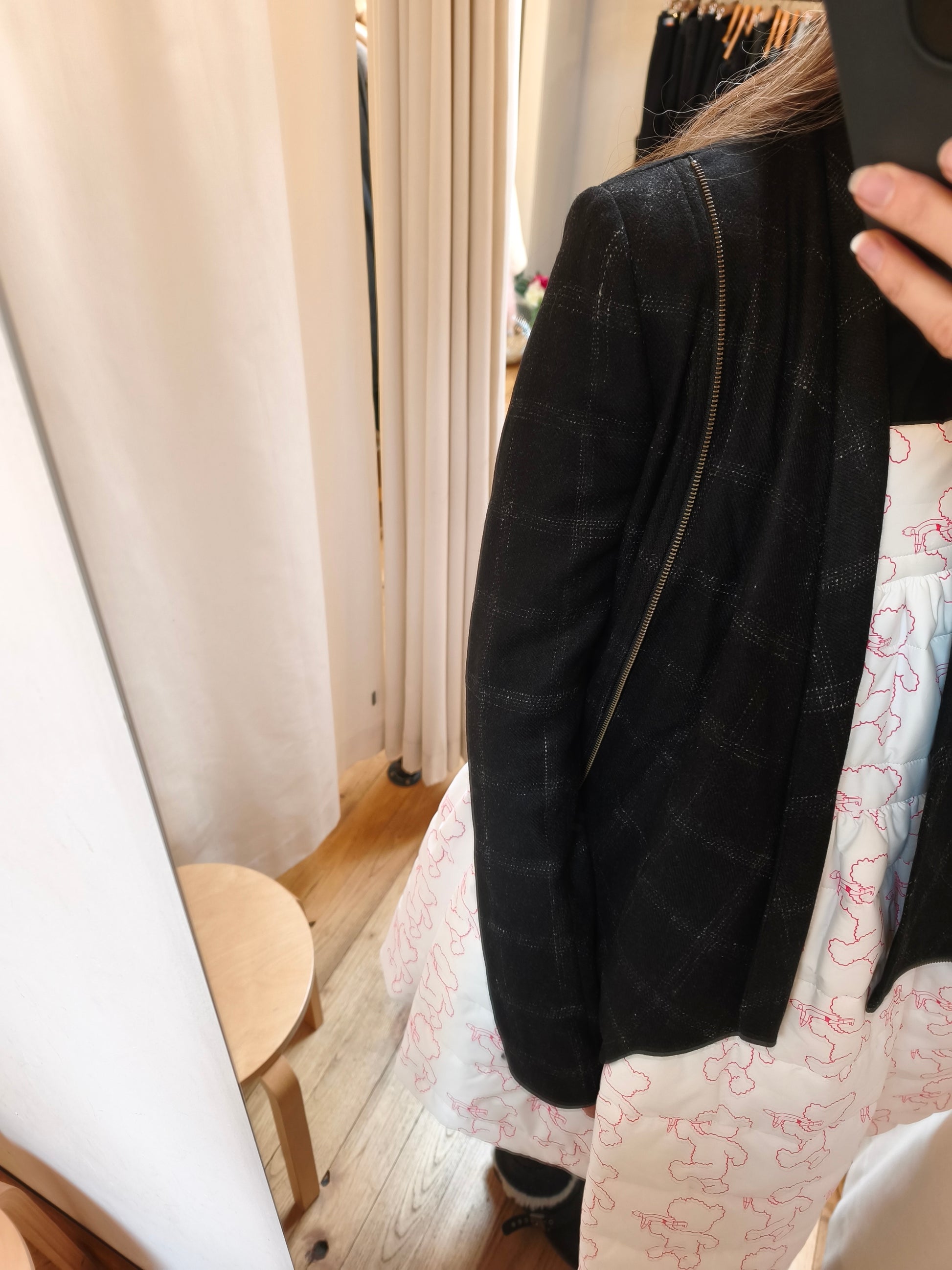Antracietkleurig jasje met tartanruit. Volledig gevoerd en sluit met een rits. Prachtig detail op de rug.